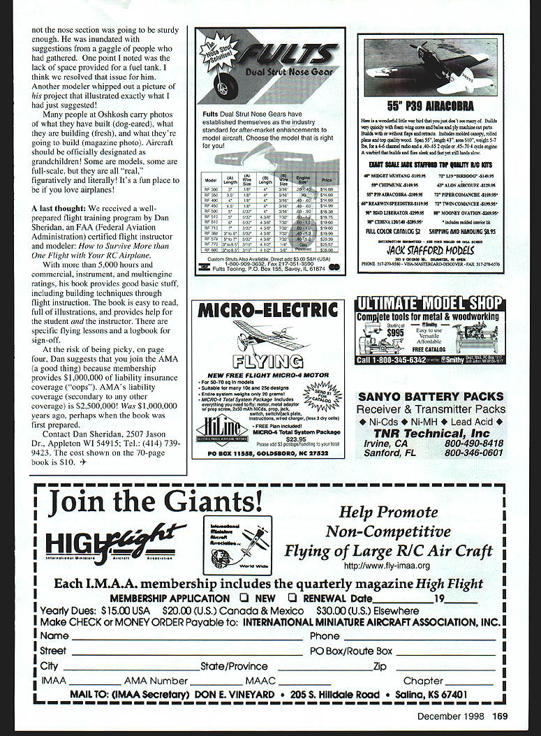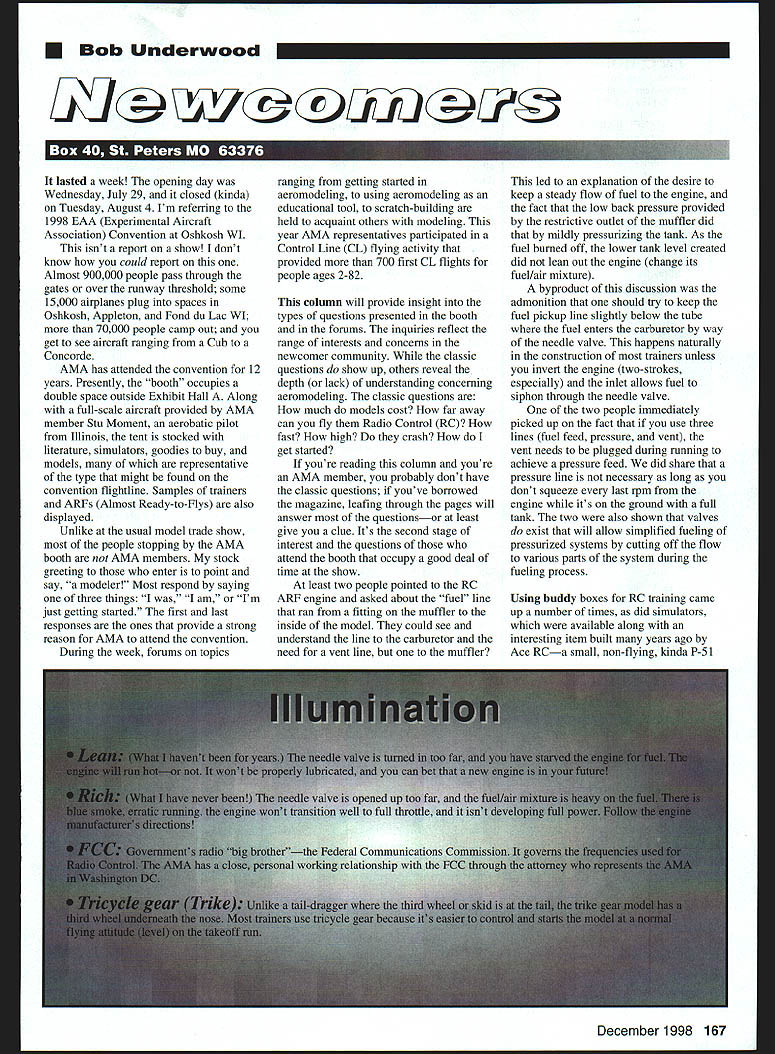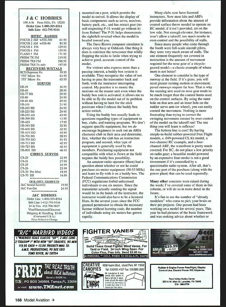 Bob Underwood 5Yikzvu lasted week opening day Wednesday July 29 closed kinda Tuesday August 4 Im referring 1998 EAA Experimental Aircraft Association Convention Oshkosh WI isnt report show dont know could report Almost 900000 people pass through gates over runway threshold some 15000 airplanes plug spaces Oshkosh Appleton Fond du Lac WI 70000 people camp out get see aircraft ranging Cub Concorde AMA has attended convention 12 years Presently booth occupies double space outside Exhibit Hall Along full-scale aircraft provided AMA member Stu Moment aerobatic pilot Illinois tent stocked literature simulators goodies buy models representative type might found convention flightline Samples trainers ARFs Almost Ready-to-Flys also displayed Unlike usual model trade show people stopping AMA booth AMA members stock greeting enter point say modeler Most respond saying three things am Im just getting started first last responses ones provide strong reason AMA attend convention During week forums topics ranging getting started aeromodeling using aeromodeling educational tool scratch-building held acquaint others modeling year AMA representatives participated Control Line CL flying activity provided 700 first CL flights people ages 2-82 column will provide insight types questions presented booth forums inquiries reflect range interests concerns newcomer community classic questions show up others reveal depth lack understanding concerning aeromodeling classic questions much models cost far away can fly Radio Control RC fast high crash get started youre reading column youre AMA member probably dont have classic questions youve borrowed magazine leafing through pages will answer questionsor least give clue Its second stage interest questions attend booth occupy good deal time show least two people pointed RC ARF engine asked about fuel line ran fitting muffler inside model could see understand line carburetor need vent line muffler led explanation desire keep steady flow fuel engine fact low back pressure provided restrictive outlet muffler did mildly pressurizing tank As fuel burned off lower tank level created did lean out engine change its fuellair mixture byproduct discussion admonition should try keep fuel pickup line slightly below tube fuel enters carburetor way needle valve happens naturally construction trainers unless invert engine two-strokes especially inlet allows fuel siphon through needle valve two people inunediately picked up fact use three lines fuel feed pressure vent vent needs plugged during running achieve pressure feed did share pressure line necessary long dont squeeze last rpm engine its ground full tank two also shown valves exist will allow simplified fueling pressurized systems cutting off flow various parts system during fueling process Using buddy boxes RC training came up number times did simulators available along interesting item built years ago Ace RCa small non-flying kinda P-5 1 December 1998 167 J & C HOBBIES 100 St Penn Hills PA 15235 Order Line 1-800-309-8314 Info Line 412-795-9344 HITEC RADIOS Focus 2 AM wIHS-3006195 FOCUS 2 AM wfHS-808195 FOCUS 4 FM12995 FOCUS 6 FM15995 FLASH S FM17195 PRISM 7X FM21995 PRISM 7X5 FM29695 PRISM 7X5 Tx only19795 RECEIVERS W/XTALS RCD Supreme Rx 535 Micro Rx 555 Micro Rx SERVOS HS-50 HS-60 HS-77 BB HS-80 HS-85 BB HS-101 HS-205 BB HS-225 BB HS-235 AG HS-300 BB HS-425 HS-545 BB HS-605 BB HS-615 MG 1-tS-700 BB HS-705 MG HS-715 IIB HS-725 BB 115-805 BB CIRRUS SERVOS CS-20 CS-2 1 CS-25 CS-26 CS-30 Pro Mini CS-70 BB OUR OWN PRODUCTS J&C Sound Security J&C Fun-Bat * ** * ******* * ****** * * * 5995 6195 6595 3695 2895 2995 2495 2995 2195 2495 2995 4395 1195 1795 3295 3295 4595 2895 4195 4295 4295 4695 2299 2799 2499 2599 1999 1499 1995 2495 J&C HOBBIES Order Line 1-800-309-8314 Info Line 1-412-795-9344 24 hr Fax 412-798-9857 Visa/MastercardlDiscover Shipping & Handling $500 Continental USA Prices Subject Change mounted post permits model swivel allows display basic components such servo receiver battery pack etc has retract gear no self-respecting P-5 1 would go Robart P-5 1 helps demonstrate right/left reversal model headed toward Dave Brown computer simulator always very busy Oshkosh thing does convince newcomer wildly flopping sticks futile trying achieve good accurate control model visitors express passing interest buddy box system available recognize value having pass transmitter back forth instructor interrupting control practice mimic motions master unit buddy box unit activated allows able fly model out its problem having hunt stick positions release buddy box action switch Using buddy box usually leads questions regarding types equipment buy clubs training programs dont suggest specific equipment encourage beginners seek out AMA chartered club area determine first whether club has instruction program second what type equipment generally used members Purchasing equipment compatible what flown field negates buddy box possibility An amateur radio operator Ham question about whether could purchase six-meter equipment 50-53 MHz learn fly buddy box Federal Communications Commission FCC regulations forbid unlicensed individuals use six meters Since transmitter actually sending signal would hands instructor instructor would also have licensed Ham several years since FCC granted permission obtain necessary license learning code number individuals using six meters has grown rapidly clubs now have licensed instructors Now kits ARFs provide information about amount control surface throw needed operate RC model isnt provided err low side enough elevator instance wont allow takeoff too much results over-control possibility stalls Since people came through booth full-scale aircraft pilots very much aware stalls element frequently covered instruction amount movement required nose gear tricyclegeared modela classic example better element consider type runway field its grass will need greater turning motion movement paved runways require far less ste