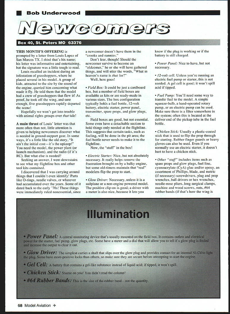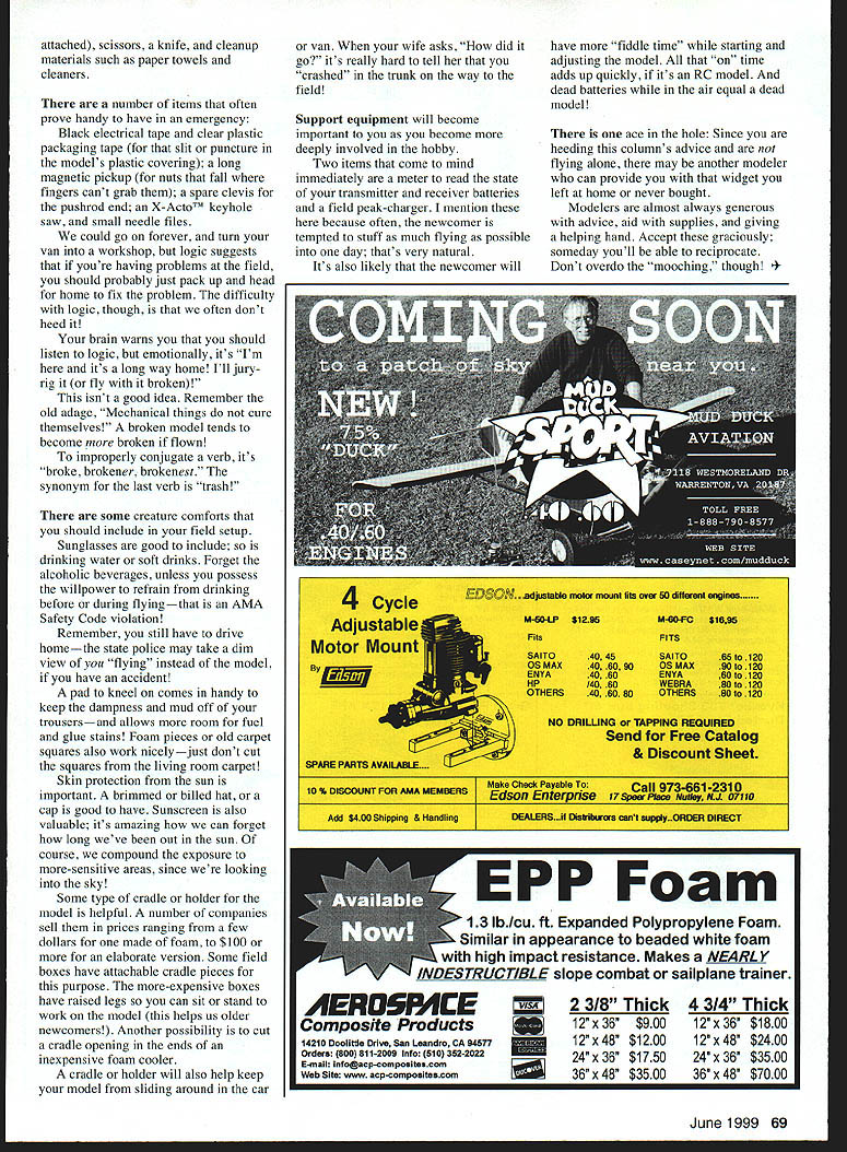 U Bob Underwood 5Yk xizizicu THIS MONTHS OFFERING prompted letter Louis Lopez San Marcos TX think thats name letter informative entertaining signature little tough read Louis recalled incident during infestation grasshoppers placed several model group kids attracted site sound engine queried him concerning what made fly told model crew grasshoppers flew As proof took off wing sure enough five grasshoppers rapidly departed scene Hopefully wont get trouble animal rights groups over tale main thrust Louis letter often little attention given helping newcomers discover what needed ground-support gear some ways its little like old story aint initial costits upkeep need model power plant launch mechanism radio its RC what else needed Seeking answer went downstairs see what flightline box other tool kits contained discovered carrying around things couldnt identify Parts like 0-rings needle valves whatever accumulated over years Some dated back early 70s things immediately ruled nonessential since newcomer doesnt have crooks nannies Dont fear though Should newcomer survive become oldcomer will have gathered things will utter words What heavens name Well goes Field Box could just cardboard box number field boxes available kits ready-made various sizes box configuration typically holds fuel bottle 12-volt battery electric starter power panel transmitter spare props glow plugs etc Field boxes good essential Some have detachable section hold things needed flightline suggests certain tasks such fueling will done pit area fuel bottle never needs make flightline Now stuff box Electric Starter Nice absolutely necessary really helps remove frustration brought balky engine some old-timers maintain real modelers flip prop start Glow Driver Necessary unless sailplane non-engine powered model positive clip-on good driver meter also nice because lets know plug working battery still charged Power Panel Nice have necessary 12-volt cell Unless youre running electric fuel pump starter needed gel cell good wont spill acid tipped Fuel Pump Youll need some way transfer fuel model simple squeeze-bulb hand-operated rotary pump electric pump can used Make sure filter somewhere system often located deliver end pickup tube fuel bottle Chicken Stick Usually plastic-coated stick used flip prop through starting Rubber finger guards heavy gloves can also used normally use electric starter doesnt hurt have chicken stick Other stuff includes items such spare props glow plugs fuel line cyanoacrylate CyA glue and/or epoxy assortment Phillips blade metric necessary screwdrivers plug prop wrenches ball drivers hex wrenches needle-nose pliers long surgical clamps machine wood screws nuts #64 rubber bands thats wing 68 Model Aviation ched scissors knife cleanup materials such paper towels cleaners number items often prove handy have emergency Black electrical tape clear plastic packaging tape slit puncture models plastic covering long magnetic pickup nuts fall fingers cant grab spare clevis pushrod end XActoTM keyhole saw small needle files could go forever turn van workshop logic suggests youre having problems field should probably just pack up head home fix problem difficulty logic though often dont heed brain warns you should listen logic emotionally its Im its long way home Ill juryrig fly broken isnt good idea Remember old adage Mechanical things cure themselves broken model tends become broken flown improperly conjugate verb its broke brokener brokenest synonym last verb trash some creature comforts should include field setup Sunglasses good include drinking water soft drinks Forget alcoholic beverages unless possess willpower refrain drinking before during flying Safety Code violation Remember still have drive homethe state police may take dim view flying instead model have accident pad kneel comes handy keep dampness mud off trousersand allows room fuel glue stains Foam pieces old carpet squares also work nicelyjust dont cut squares living room carpet Skin protection sun important brimmed billed hat cap good have Sunscreen also valuable its amazing can forget long weve out sun course compound exposure more-sensitive areas since looking sky Some type cradle holder model helpful number companies sell prices ranging few dollars made foam $100 elaborate version Some field boxes have attachable cradle pieces purpose more-expensive boxes have raised legs can sit stand work model helps us older newcomers Another possibility cut cradle opening ends inexpensive foam cooler cradle holder will also help keep model sliding around car van wife asks did go its really hard tell crashed trunk way field Support equipment will become important you become deeply involved hobby Two items come mind immediately meter read state transmitter receiver batteries field peak-charger mention because often newcomer tempted stuff much flying possible day thats very natural Its also likely newcomer will have fiddle time starting adjusting model time adds up quickly its RC model dead batteries air equal dead model ace hole Since heeding columns advice flying alone may another modeler can provide widget left home never bought Modelers almost always generous advice aid supplies giving helping hand Accept graciously someday youll able reciprocate Dont overdo mooching though 4EPP Foam 13 Ib/cu ft Expanded Polypropylene Foam Similar appearance beaded white foam high impact resistance Makes NEARLY e combat sailplane trainer AEROSPACE Thick Composite Products12 x 36$900 12x48$1200 24x 36$1750 36 x 48$3500 14210 Doallttle Drive San Leandra CA 94577 Orders t800 811-2009 Info t510 352-2022 E-mail into@acp-compositeacom Web Site www acp-compositeacom 4 314 Thick 12x 36 $1800 12x 48 $2400 24 x 36 $3500 36 x 48 $7000 June1999 69 4 CycleEO8ONaiiueable maim moist file aew 80 dUstgiitai0eee AM404P S12UM40FC15 FitsFITS Motor4046SAITO 8610120 40 60ENYA0 Ia 120 140 60WESRASeto 120 40 6080OTHERS101OA20 SAITO OS MAX ENYA HP RS NO DRiLUNG TAPPING OUINED Send Fm Catalog & Discount