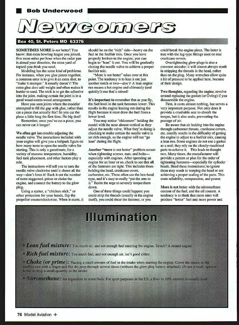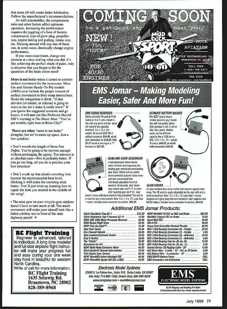 U Bob Underwood U4iKU SOMETIMES MORE better know extra bowling league joined five miles per hour radar gun aimed direction extra yard topsoil think need Modeling has same kind problems instance glue pieces together common error give extra shot make stronger usually doesnt extra glue does add weight often makes harder sand trick get adhesive joint making certain joint good wood-meets-wood arrangement Have seen joints modeler attempted fill gap glue rather cut piece actually fits9 So cut piece little long first time No big deal Remember once youve cut piece can never cut longer often get trouble adjusting needle valve instructions included engine will give ballpark figure turns open needle valve starting guestimate variety reasons temperature humidity fuel tank placement other factors play role instructions will tell turn needle valve clockwise until closes waydont force Back out number turns suggested prime choke engine connect battery glow plug Using starter chicken stick other protection hands flip propeller counterclockwise starts should rich sideheavy fuel fuel/air mix Once have properly broken-in engine can begin lean out will gradually closing needle valve achieve proper fuellair mix better takes over point tendency lean out just another notch twodon t lean engine run means hot engine ultimately quickly thats mined Its important remember fly fuel level tank becomes lower results engine leaning out during flight because must draw fuel lower level may notice oldcomers holding model nose almost vertical adjust needle valve What theyre doing checking make certain needle valve set rich enough engine will go lean during flight Another better problem occurs tightening screws nuts boltsespecially engines After operating engine hour check see fasteners tight includes holding head crankcase cover carburetor etc often use hex-head type its easy really put arm Resist urge severely torque down three things could happen could strip threads usually engine itself could shear fastener could break engine piece latter true lug-type fittings used rear crankcase covers Overtightening glow plugs also common mistake will almost always result stripping threads head rather plug wrenches allow quite bit pressure applied because design Two thoughts regarding engine revolve around replacing gasket 0-ring disassemble engine First costs almost nothing serves very important purpose does provide crushable seat absorb torque hut also seals preventing passage air aware air leaking engine through carburetor throats crankcase covers etc usually results difficulty getting engine adjust fuel/air mix causing lean run Some engines use gasket seal rely closely-machined parts achieve leads thought two times manufacturer will provide pattern plan order tightening fastenersespecially cylinder heads Heed instructions ignore may result warping head achieving proper sealing parts costs reliability compression power better nitromethane content fuel oil content tendency think nitro will produce hotter fuel power 76 Model Aviation * oil will create better lubrication Follow manufacturers recommendations As automobiles compression ratio other factors affect optimum operation Increasing performance requires juggling host factors compression type glow plug propeller size engine timing porting intake size etc Messing around can some cases drastically change engine performance must experiment change element time log what did Its like achieving perfect shade paint discover forgot list quantities basic colors used better comes controlsurface movement newcomer Most kits Almost-Ready-To-Fly models ARFs now include proper amount surface movement setup instructions Resist temptation think elevator rudder aileron going wave lets make really wave ignore suggested amounts go heavy will turn out like Professor Harold Hills warning Music Man Youve got trouble right River City other better thoughts weve eaten up space Just few quickies Dont overdo length first flights Youre going nervous enough prolonging agony Ten minutes absolute maxfive probably better go too long practice best mistakes Dont crank up plastic-covering iron beyond recommended heat level thinking will make covering stick better Youll just wind up learning repair hole melted middle wing nose gear tricycle-gear airplane doesnt have turn much ail Too much movement will make takeoff look like failed sobriety test front state highway patrol SERVO REVERSER Works AM FM PCM 7 radios 4 5 cells Install in- J line servo servo will move opposite directionl 50175025 weight 25 ounce EMS SR-2 connector $14 95 wired connectors tor $1995 EMS SR-2Y wired leg ot Y harness tor $2250 GEARAND DOOR SEQUENCER microprocessor driver device controls sequences landing gear mechanism landing gear doors Works air and/or 1 servo controlled systems Gear servo door servo travel time individually adjustable trom toll speed 11 seconds Gear doors may remain open ala P-47 close utter lowering gear ala P-Si Gear doesnt move until doors travel tally completed unit tor retract system Size 15015075 Less 1 ounce Includes servo connector receiver $4495 Glitch Stop/Noise Trap OS-I$1250 Glitch Stop/Noise Trap YHarness GS-1Y1500 NEW SRE-2000 Micro-Processor Reverser2495 NEW Beepo Flight 7imer 2995 NEW StopGoLightTM2495 Gear Door Cycler3495 Channel Failsafe3895 Opto-Isolated Electronic Switch3995 Dual E-S witch3995 Snitch3995 Autoretract U/C3995 NEW Multi-Mode Electronic Mixer4495 Glitch Buster/6 Channel Opto-Isolator7995 Twin Engine Sync System8995 NEW NanoMAXlndoorliltralightESC4495 NEW MicroMAX Speed 400 ESC w/BEC5995 Electronic Model Systems 22605 E La Palma Ave Suite 516 Yarba Linda CA 92887 Info Only 714-692-1393 Orders Only 800-845-8978 wwwemsjomaoom e mark@emsjomaCom ULTIMATEBATTERYBACKER BEST way insure reliable power model Use two packs Works standard 4 cell 5 cell GEL-CELL packs Battery K.. packs can ditterent capacity like 1200 600 150150 75 weight 8 ounce $4995 wired connectors $5995 DRIVER An opto-isolated glow dr