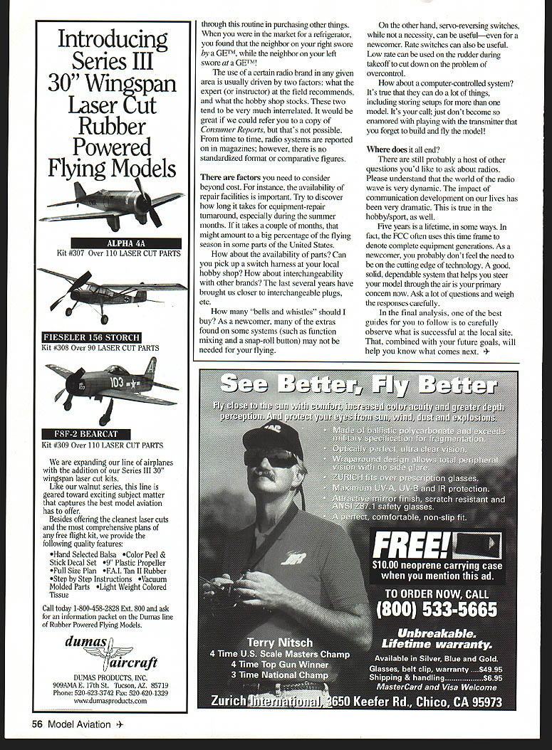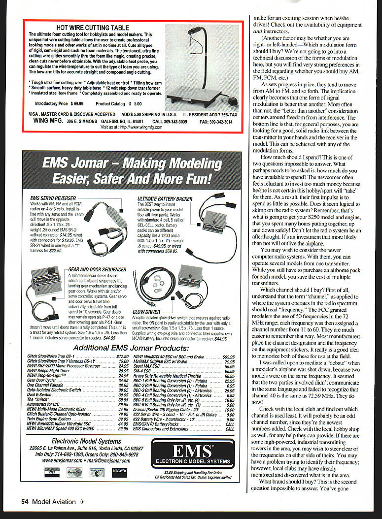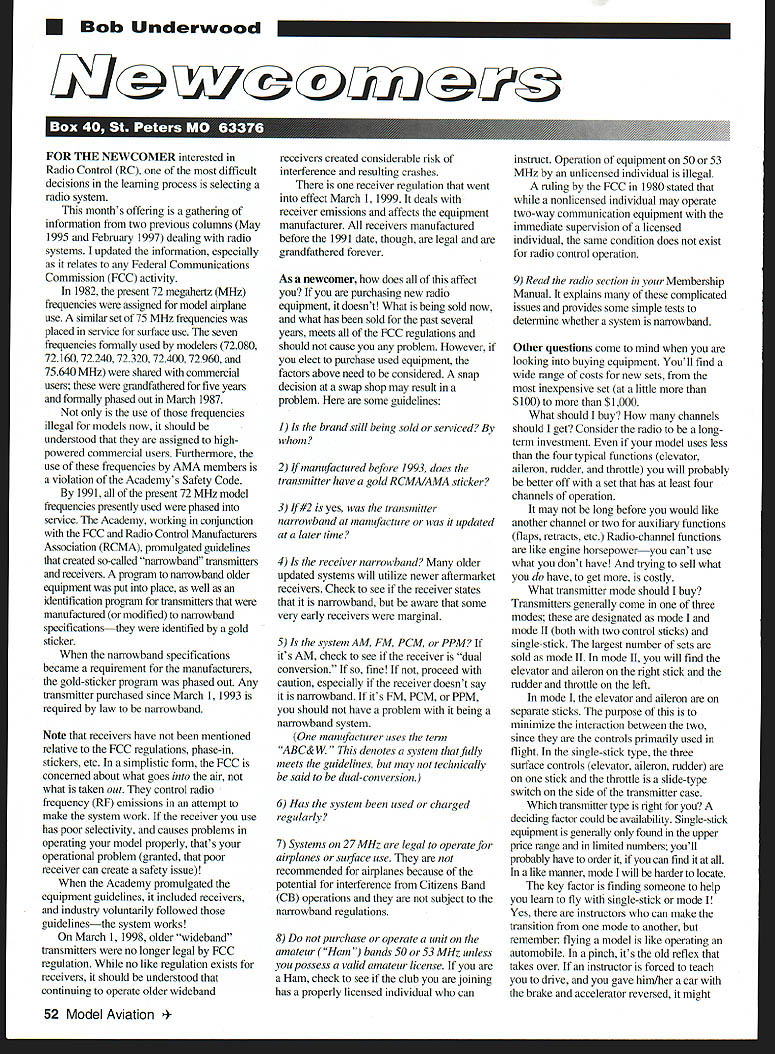 U Bob Underwood fPL72 21@iKU U i@i U-~ izu FOR THE NEWCOMER interested Radio Control RC difficult decisions learning process selecting radio system months offering gathering information two previous columns May 1995 February 1997 dealing radio systems updated information especially relates Federal Communications Commission FCC activity 1982 present 72 megahertz MHz frequencies assigned model airplane use similar set 75 MHz frequencies placed service surface use seven frequencies formally used modelers 72080 7216072240723207240072960 75640 MHz shared commercial users grandfathered five years formally phased out March 1987 use frequencies illegal models now should understood assigned highpowered commercial users Furthermore use frequencies AMA members violation Academys Safety Code 1991 present 72 MHz model frequencies presently used phased service Academy working conjunction FCC Radio Control Manufacturers Association RCMAJ promulgated guidelines created so-called narrowband transmitters receivers program narrowband older equipment put place well identification program transmitters manufactured modified narrowband specificationsthey identified gold sticker narrowband specifications became requirement manufacturers gold-sticker program phased out Any transmitter purchased since March 1 1993 required law narrowband Note receivers have mentioned relative FCC regulations phase-in stickers etc simplistic form FCC concerned about what goes air what taken out control radio frequency RF emissions attempt make system work receiver use has poor selectivity causcs problems operating model properly thats operational problem granted poor receiver can create safety issue Academy promulgated equipment guidelines included receivers industry voluntarily followed guidelinesthe system works March 1 1998 older wideband transmitters no longer legal FCC regulation no like regulation exists receivers should understood continuing operate older wideband receivers created considerable risk interference resulting crashes receiver regulation went effect March 1 1999 deals receiver emissions affects equipment manufacturer receivers manufactured before 1991 date though legal grandfathered forever As newcomer does affect you purchasing new radio equipment doesnt What being sold now what has sold past several years meets FCC regulations should cause problem However elect purchase used equipment factors above need considered snap decision swap shop may result problem some guidelines 1 brand still being sold serviced 2 manufactured before 1993 does transmitter have gold RCMA/AMA sticker 3 #2 yes transmitter narrowband manufacture updated later time 4 receiver narrowband older updated systems will utilize newer aftermarket receivers Check see receiver states narrowband aware some very early receivers marginal 5 system AM FM PCM PPM its AM check see receiver dual conversion fine proceed caution especially receiver doesnt say narrowband its FM PCM PPM should have problem being narrowband system manufacturer uses term ABC& W denotes system fidly meets guidelines may technically said dual-conversion 6 Has system used charged regularly 7 Systems 27 MHz legal operate frr airplanes surface use recommended airplanes because potential interference Citizens Band CB operations subject narrowband regulations 8 purchase operate unit amateur Ham bands 50 53 MHz unless possess valid amateur license Ham check see club joining has properly licensed individual can Instruct Operation equipment 50 53 MHz unlicensed individual illegal ruling FCC 1980 stated nonlicensed individual may operate two-way communication equipment immediate supervision licensed individual same condition does exist radio control operation 9 Read radio section Membership Manual explains complicated issues provides some simple tests determine whether system narrowband Other questions come mind looking buying equipment Youll find wide range costs new sets inexpensive set little $100 $1000 What should buy channels should get Consider radio longterm investment model uses less four typical functions elevator aileron rudder throttle will probably better off set has least four channels operation may long before would like another channel two auxiliary functions flaps retracts etc Radio-channel functions like engine horsepoweryou cant use what dont have trying sell what have get costly What transmitter mode should buy Transmitters generally come three modes designated mode mode II both two control sticks single-stick largest number sets sold mode II mode II will find elevator aileron right stick rudder throttle left mode elevator aileron separate sticks purpose minimize interaction between two since controls primarily used flight single-stick type three surface controls elevator aileron rudder stick throttle slide-type switch side transmitter case Which transmitter type right deciding factor could availability Single-stick equipment generally found upper price range limited numbers youll probably have order can find like manner mode will harder locate key factor finding someone help learn fly single-stick mode Yes instructors can make transition mode another hut remember flying model like operating automobile pinch its old reflex takes over instructor forced teach drive gave him/her car brake accelerator reversed might 52 Model Aviation SERVO REVERSER Works AM FM POM radios 4 5 cello Inotall line aoy servo servo will wove opposite direction 5017S o25weight 25 ounce EMS SR-2 connector $1495 wired connectors tsr $1995 EMS SR-2Y wired ore leg ot Y harness tsr $2250 GEAR AND DOOR SEQUENCER wicroproceosor driver device whch controls sequences landing gear wechaniow landing gear doors Works air onctor servo controlled systems Gear serno door servo travel time individually odjostable trow toll speed 10 seconds Geor doors way remain open ala P-47 close atter lowering gear ala P-Si Gear doesnt wove ontil doors travel tally completed unit wont tsr retract system Size 15 o 15 0 75 Less 1 