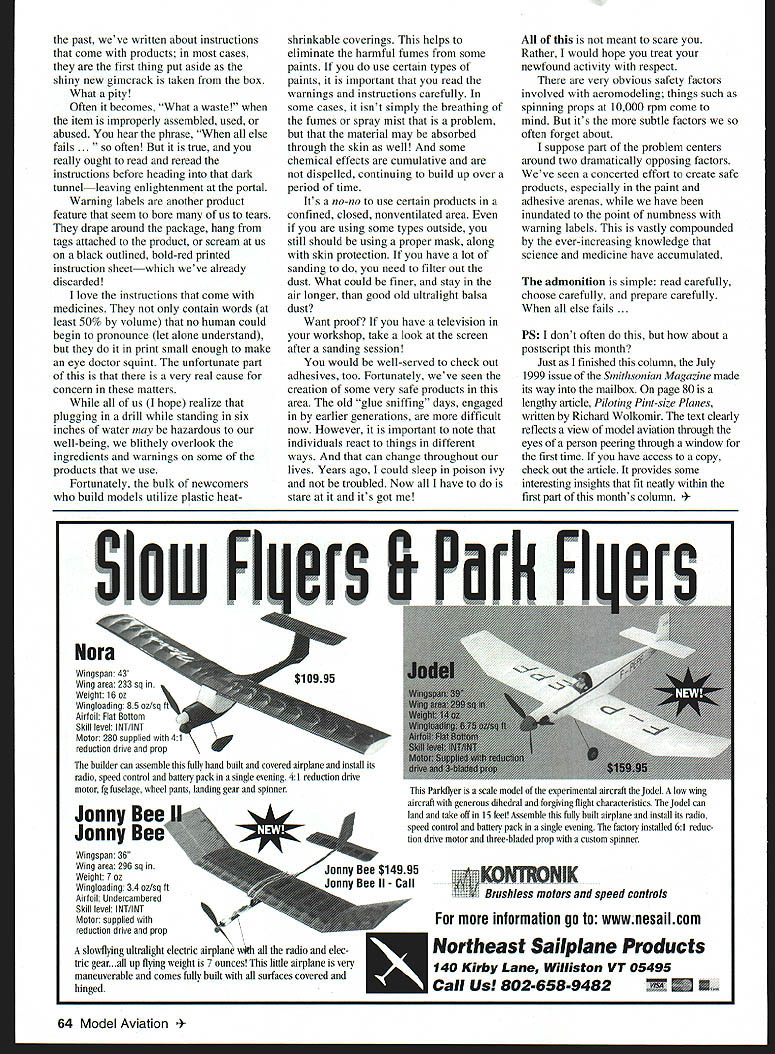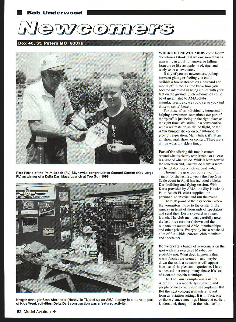 U Bob Underwood 5ZYi4 221@ZKU WHERE DO NEWCOMERS come Sometimes think envision appearing puff smoke falling tree like applered ripe ready newcomer newcomers perhaps between gluing fueling could scribble few sentences postcard send off Let know became interested being pilot feet ground Such information could great value AMA clubs manufacturers etc could serve come better us individually interested helping newcomers sometimes part plan just being right place right time strike up conversation seatmate airline flight AMA bumper sticker automobile prompts question times its air show mall show contest zillion ways tickle fancy Part offering month centers around what clearly recruitment least taste what leans toward education end what really mere public relations motivational nudge Through gracious consent Frank Tiano last few years Top Gun Scale event April has included Delta Dart building-and-flying session Darts provided AMA Sky Hawks Palm Beach FL club supplied personnel instruct run event high point day occurs youngsters move center runway front thousands spectators send Darts skyward mass launch cluh members carefully note last three down winners awarded AMA memberships other prizes Everybody has whale lot funkids parents club members spectators create bunch newcomers spot exercise Maybe probably What does happen warm fuzzies createdand maybe down road newcomer will appear because pleasant experience have witnessed many times its sort coated-aspirin technique Top Gun example natural After its model-flying event people come expecting see airplanes fly next concept much removed aviation setting fact chance meetings hinted earlier Understand though chance 62 Model Aviation Ferris Palm Beach FL Skyhawks congratulates Samuel Carson Key Largo FL winner Delta Dart Mass Launch Top Gun 1999 Kroger manager Stan Alexander Nashville TN set up AMA display store part Kids Week activities Delta Dart construction featured activity case carefully planned excellently executed Stan Alexander frequent contributor magazine president NASA National Association Scale Aeromodelers AMA recognized Special Interest Group lives Nashville TN manager Kroger store 83 Kroger stores Nashville area declared Kids Week dedicating activities toward children evening probably during TV rerun period nothing watch Stan thought interesting idea supermarket set up area display AMA build Delta Darts happened Some 120 Darts given out and/or constructed An 83-years-young former modeler paused chat about early days modeling too experienced warm fuzzies picnic table set up building AMA booth contained handouts videos shown modeling activities Additionally number Darts preconstructed individuals able build Dart store opportunity fly Dart Models also placed about view can again ask question whether created bunch modeling newcomers answer same important difference between approach Top Gun activity dont normally expect greeted attractive display modeling items have opportunity build obtain airplane go store buy loaf bread jug milk Neither activities really teaching modeling Nor opening up world aerodynamic principles math science like simply creating pleasant experience happened involve aeromodeling high interest level Stans Kruger event wasnt limited youngsters create true newcomer such event requires follow-through additional contact scads other things go beyond what normally try attract people earlier column told about Christmas idea Underwoods tried couple years ago involved creating Delta Dart kits including materials needed giving households cul-de-sac-parents included nine homes total 19 thats nineteen kids represented ages nine months 17 years Make eight homes kids since wife emptynesters Did create newcomers yet knows what might happen As newcomer instruction sheets warning labels John Eatons 25cc 15 CI Engine 100% ball & roller bearings Electronic magneto Prop bob & mount included Hand start wt 4 lbs Current Price $15010 S&H$130l Available Now Prop bob & mount also sold separately cu3ta Ubili Rinpi bmumnint uln cu NT SCALE TR 260 CLOSE OUT mn rucrn Ut 811800 S H 825 848000 S H SN Mid-wing aerobatic design tor 2 4 Cl ABS cowl hatch cover & wheel pants ARF covered Ultracole Kit weigbt 15-18 lbs 86 wingspan ARF weigbt 16-19 lbs 92 wingspan * * ATTEUTIOII SUPU UI OIWUISI * * FinallyAvailable ined bar stock rod tell roller bearings br Super Tiger engines Super heavy duly will improve pertormance glow must br gas conversion 2500 & 3000- S4000 S & H Wing Gyro$9499 Control SystemPjezo Ciement Temperature Range10 50 C Voitage Range4 12 Voits Current Draw14 mab Size150 ie p067 Weight25g Mints ptacassat contnviied temparatute compunsatiun dual sensitivity adtustmant transminer dual sarvo autput ton transmitters minlno built batt ery monitor wiLED wamins under 44 uolts servo Master Gyro$8499 Same specs Wing Gyro Olnain onboard sensitiulty unettol Tale-Gyro$10499 Same specs Wing Gyro Ovbnard remote seositiulty adjustment Profi-Gyro Head Holding$12499 Same specs Wing Gyro Dual sensitluity Headint Hold ramotaly switchahie Receivers JR Futaba Airtmnrcs Hitno Berg 6 chReceiver $5499 Crystal 72153/50 Mhz999 Narrow Band5 Khz better Lightweight wfcase16g wlc case1250 End piug type size21 0050 074 Top piag type sizeie xOSn 074 Operating voltage46 6 volts Current drawe ma Sensitivity2uv Comes clear shOelt wrap label ton use case Jumper selectoole tar ose negative positive shifi modulation Jimpar selectable tot ohoive ot ohs OtCh 7 Ikarus Electric Helicopters EcoB Length3552 Rotorspan4173 Weight45 lbs Batteries612 cells use 5 channel holicopter radios Uses 500 700 motors 2500 brushiess motors available upurade hop-up parts also available Piccoloapproxt $2399 Length165 Rotor span157 Weightsee oz Batteries6 S cells 0Bpmmd Rumpler Taube part flyer$6999 Wing span43 Take off Weight55 oz Controiseiefrudjthrot Radio requiredmini rx & servos Battery S S ceiis 270 600 mae Eotraordinarilp 0004 flying ohuruoteristivs s assembly time made out ofi molded Sovalite to
