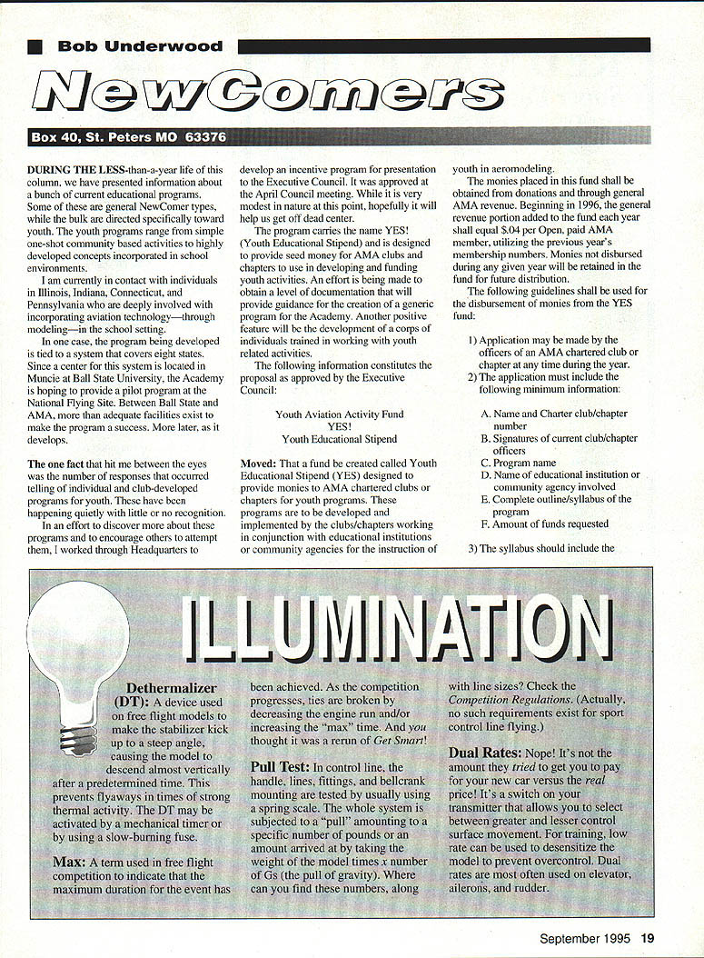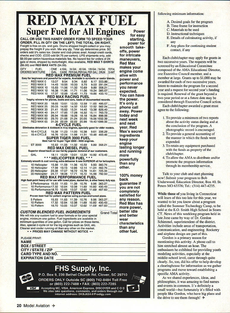 U Bob Underwood Zifkuzizu DURING TIlE LESS-than-a-year life column have presented information about bunch current educational programs Some general NewComer types bulk directed specifically toward youth youth programs range simple one-shot community based activities highly developed concepts incorporated school environments am currently contact individuals Illinois Indiana Connecticut Pennsylvania deeply involved incorporating aviation technologythrough modelingin school setting case program being developed tied system covers eight states Since center system located Muncie Ball State University Academy hoping provide pilot program National Flying Site Between Ball State AIVIA adequate facilities exist make program success later develops fact hit between eyes number responses occurred telling individual club-developed programs youth have happening quietly little no recognition effort discover about programs encourage others attempt worked through Headquarters develop incentive program presentation Executive Council approved April Council meeting very modest nature point hopefully will help us get off dead center program carries name YES Youth Educational Stipend designed provide seed money AMA clubs chapters use developing funding youth activities An effort being made obtain level documentation will provide guidance creation generic program Academy Another positive feature will development corps individuals trained working youth related activities following information constitutes proposal approved Executive Council Youth Aviation Activity Fund YES Youth Educational Stipend Moved fund created called Youth Educational Stipend YES designed provide monies AMA chartered clubs chapters youth programs programs developed implemented clubs/chapters working conjunction educational institutions community agencies instruction youth aeromodeling monies placed fund shall obtained donations through general AMA revenue Beginning 1996 general revenue portion added fund year shall equal $04 per Open paid AIvIA member utilizing previous years membership numbers Monies disbursed during given year will retained fund future distribution following guidelines shall used disbursement monies YES fund 1 Application may made officers AMA chartered club chapter time during year 2 The application must include following minimum information A Name Charter club/chapter number B Signatures current club/chapter officers C Program name D Name educational institution community agency involved E Complete outline/syllabus program F Amount funds requested 3 The syllabus should include September 1995 19 RED MAX FUEL Super Fuel Engines CALL OR USE THIS HANDY ORDER FORM TO SPEED YOUR ORDER FILL IN OTY ON THE LEFT THE TOTAL ON RIGHT Freight free qts gals Drums shipped freight collect may prepay freight wish Mix qty Total qty determines price SC orders add 5% sales tax Dealer club prices avail Accept credit cards checks COD COD add $475 per carton UPS shipments add $800 per carton hazardous materials fee No hazard fee orders 24 gals shipped motorfreight Also available RED MAX T-SHIRTS $600 RED MAX HATS $400 OTY FUEL ONE 4GAL 24GAL ttGAL 126GAL 54GAL TOTAL ORDEREDMlXTURE PERGALPERGALPERGAL DRUM RED MAX PREMIUM FUEL Easy beginners powerful experts Available synthetic castor blends ____RED MAX 0130795493488281722388 ____ ____RED MAX 514451055103397590329104 ____ ___RED MAX 10158311561132106998935821 ____ ____RED MAX 121638119611711106102438507 ____ ____RED MAX 151737126812421173108643315 ____ REDMAX RACING FUEL Trophy winners planes boats cars loads documented records ____RED MAX 201865136113331259116549507 _____ ____RED MAX 252003146214321352125256224 _____ ___RED MAX3O2141156315311445133862940 ____ ___REDMAX402417176517281632151176373 ____ ___RED MAX 502694196619261818168489806 ____ ___RED MAX 6029702168212420051856103239 ____ ____RED MAX 6531082269222220981943109956 _____ 4-CYCLE FUEL Eliminates detonation & kickback 4-cy engines specially good older models ___ 10-4CYCLE 1538 1123 1100 1038 961 33629 ____ ____ 15-4 CYCLE 1676 1224 1198 1131 1048 40346 _____ SUPER TIGER 3000 FUEL Best fuel Super Tiger 2000 4000 engines ___ 5T30001583 1156 1132 1069 989 35821 ____ RED MAX DIESEL FUEL Superior diesel back list popular demand Customers ____ GAL1911 1329 1301 1229 1092 47345 _____ *** HELICOPTER FUEL *** Extremely smooth & cool running extra defoamer & new SUPERIOR oil helicopters ____10 Helicopter158811591136107299336074 _____ ____15 Helicopter1798131312861214112446275 ____ ____25 Helicopter2338170716721578146172534 ____ ____ 30 Helicopter 2477 1808 1771 1672 1548 79250 _____ RED MAX PERFORMANCE FUEL High flash point heavy oil use tuned pipes ducted fan & other heavy duty app ____5 Performance 159311631139107699636327 _____ ____10 Performancel732126412381169108243043 _____ ____15 Performancel870136513371262116949760 _____ RED MAX PATTERN FUEL Proven beat fuel pettern engines using pumps tuned pipes ____ 5 Pattern 1593 1163 1139 1076 996 36327 _____ ____ 10 Pattern 1732 1264 1238 1169 1082 43043 _____ ____ 15 Pattern 1870 1365 1337 1262 1169 49760 _____ CUSTOM BLENDED FUEL INGREDIENTS Grand Total will mix custom fuel formula special engine minimum gallon Fuel ingredients available minimum quantities gallon Call prices items Also special 2-cycle oil big engines such SAX etc Cleaner cooler running oil other market PRICES MAY CHANGE WITHOUT NOTICE. Power easy starting power smooth take offs power intricate maneuvers Red Max makes engine come alive power performance never expected can have power Its phone call away Power today next week next year Red Maxs secret ingredients keep engine lasting longer running powerfully other 100% money back guarantee completely satisfied reason Red Max has power better idle better wear characteristics other fuel following minimum information A Desired goals program B Time frame instruction C Materials used D Instructional techniques E Details culminating activity F Any pians continuing student contact club/