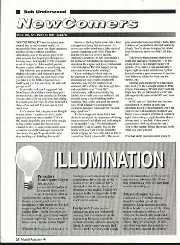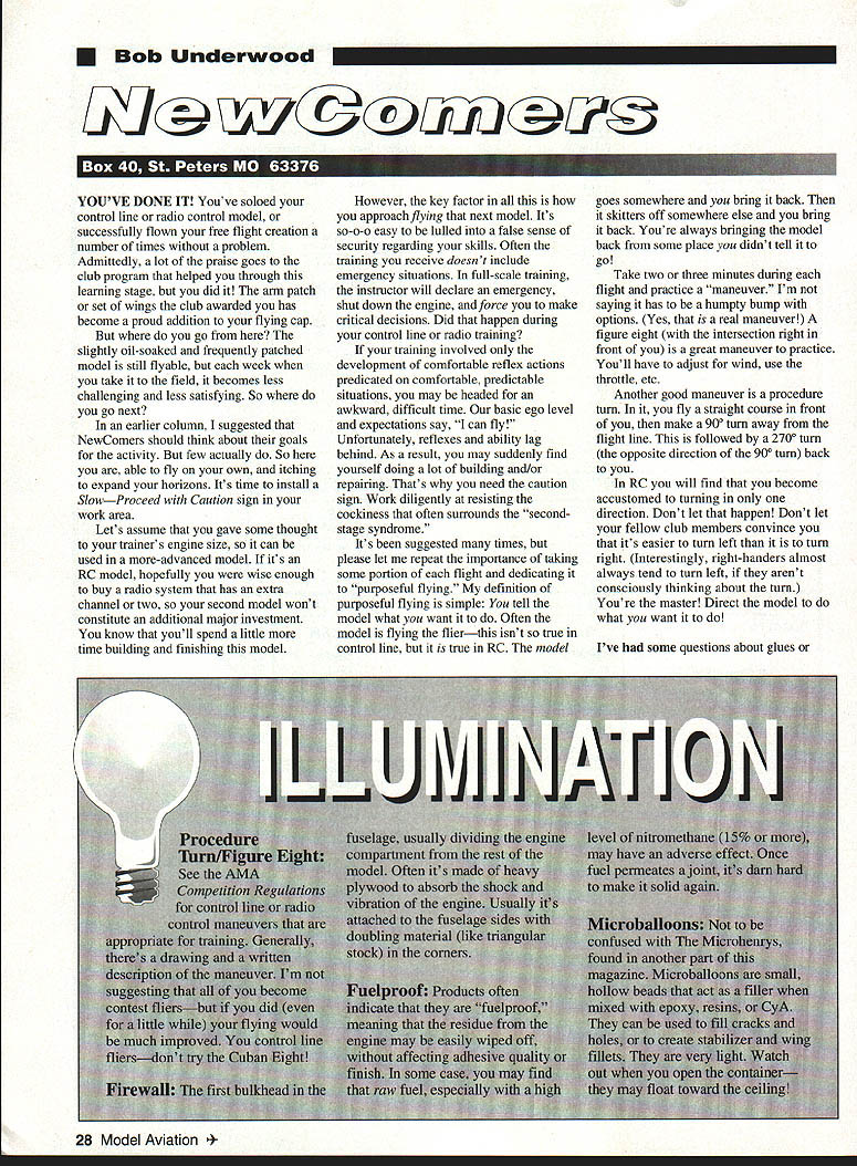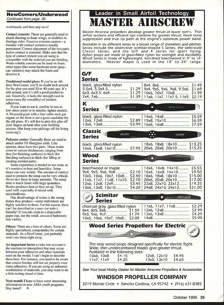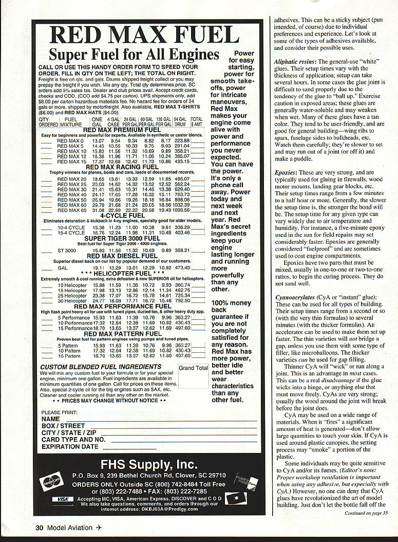 U Bob Underwood 5P74@ZKU rcw IU1 YOUVE DONE IT Youve soloed control line radio control model successfully flown free flight creation number times problem Admittedly lot praise goes club program helped through learning stage did arm patch set wings club awarded has become proud addition flying cap go slightly oil-soaked frequently patched model still flyable week take field becomes less challenging less satisfying So go next earlier column suggested NewComers should think about goals activity few actually So able fly own itching expand horizons Its time install SlowProceed Caution sign work area Lets assume gave some thought trainers engine size can used more-advanced model its RC model hopefully wise enough buy radio system has extra channel two second model wont constitute additional major investment know youll spend little time building finishing model However key factor approachflying next model Its so-o-o easy lulled false sense security regarding skills Often training receive doesnt include emergency situations full-scale training instructor will declare emergency shut down engine force make critical decisions Did happen during control line radio training training involved development comfortable reflex actions predicated comfortable predictable situations may headed awkward difficult time basic ego level expectations say can fly Unfortunately reflexes ability lag behind As result may suddenly find yourself doing lot building and/or repairing Thats need caution sign Work diligently resisting cockiness often surrounds second stage syndrome Its suggested times please let repeat importance taking some portion flight dedicating purposeful flying definition purposeful flying simple tell model what want Often model flying flierthis isnt true control line true RC model goes somewhere bring back skitters off somewhere else bring back Youre always bringing model back some place didnt tell go Take two three minutes during flight practice maneuver Im saying has humpty bump options Yes real maneuver figure eight intersection right front great maneuver practice Youll have adjust wind use throttle etc Another good maneuver procedure turn fly straight course front make 900 turn away flight line followed 2700 turn opposite direction 900 turn back RC will find become accustomed turning direction Dont let happen Dont let fellow club members convince its easier turn left turn right Interestingly right-handers almost always tend turn left arent consciously thinking about turn Youre master Direct model what want Ive some questions about glues 28 Model Aviation * RED MAX FUEL Super Fuel Engines CALL OR USE THIS HANDY ORDER FORM TO SPEED YOUR ORDER FILL IN OW ON THE LEFT THE TOTAL ON RIGHT Freight free qts gals Drums shipped freight collect may prepay freight wish Mix qfy Total qfy determines price SC orders add 5% sales tax Dealer club prices avail Accepf credif cards checks COD COD add $475 per carfon UPS shipments add $800 per carton hazardous maferials fee No hazard fee orders 24 gals shipped motorfreight Also available RED MAX T-SHIRTS $800 RED MAX HATS $400 QTY FUELONE4OAL 24GAL tOGAL 126GAL 54GALTOTAL ORDERED MIXTUREGALCASE PERGALPERGALPERGAL DRUM$AMT_ _REDMAXPREMIUM FUEL_ Easy beginners powerful experts Available synthetic castor blends RED MAX 0130795493488281722388 _____ ___REDMAX514451055103397590329104 ____ ___RED MAX 10158311561132106998935821 ____ ___RED MAX 121638119611711106102438507 ____ ___RED MAX 151737126812421173108643315 ____ REDMAXRACINGFUEL Trophy winners planes boats cars loads documented records ____RED MAX 201865136113331259116549507 _____ ____RED MAX 252003146214321352125256224 _____ ____RED MAX 302141156315311445133862940 ____ ___RED MAX 402417176517281632151176373 ____ ____RED MAX 502694196619261818168489806 _____ ____RED MAX 6029702168212420051856103239 _____ ____RED MAX 6531082269222220981943109956 ____ 4-CYCLE FUEL Eliminates detonation & kickback 4-cy engines specially good older models ____ 10-4 CYCLE 1538 1123 1100 1038 961 33629 _____ ___ 15-4 CYCLE 1676 1224 1198 1131 1048 40346 ____ SUPER TIGER 3000 FUEL Best fuel Super Tiger 2000 4000 engines ____ 5T30001583 1156 1132 1069 989 35821 ____ RED MAX DIESEL FUEL Superior diesel back list popular demand customers ____ GAL1911 1329 1301 1229 1092 47345 _____ *** HELICOPTER FUEL *** Extremely smooth & cool running extra defoamer & new SUPERIOR oil helicopters ____10 Helicopter158811591136107299336074 ____ ____15 Helicopter1798131312861214112446275 _____ ____25 Helicopter2338170716721578146172534 _____ ____30 Helicopter2477180817711672154879250 _____ RED MAX PERFORMANCE FUEL High flash point heavy oil use tuned pipes ducted fan & other heavy duty app ____5 Performance 159311631139107699636327 _____ ____10 Performancel732126412381169108243043 _____ ____15 Performancel870136513371262116949760 _____ RED MAX PATTERN FUEL Proven best fuel pattern engines using pumps tuned pipes ____ 5 Pattern 1593 1163 1139 1076 996 36327 ____ ____ 10 Pattern 1732 1264 1238 1169 1082 43043 ____ ____ 15 Pattern 1870 1365 1337 1262 1169 49760 _____ CUSTOM BLENDED FUEL INGREDIENTS Grand Total will mix custom fuel formula special engine minimum gallon Fuel ingredients available minimum quantities gallon Call prices items Also special 2-cycle oil big engines such SAX etc Cleaner cooler running oil other market PRICES MAY CHANGE WITHOUT NOTICE Power easy starting power smooth take offs power intricate maneuvers Red Max makes engine come alive power performance never expected can have power Its phone call away Power today next week next year Red Maxs secret ingredients keep engine lasting longer running powerfully other 100% money back guarantee completely satisfied reason Red Max has power better idle better wear characteristics other fuel adhesives can sticky subject pun intended course due individual preferences experience Lets look some types adhesives available consider possible uses Aliphatic resins general-use white glues setup times vary thickne
