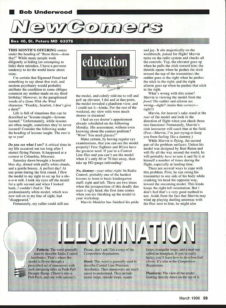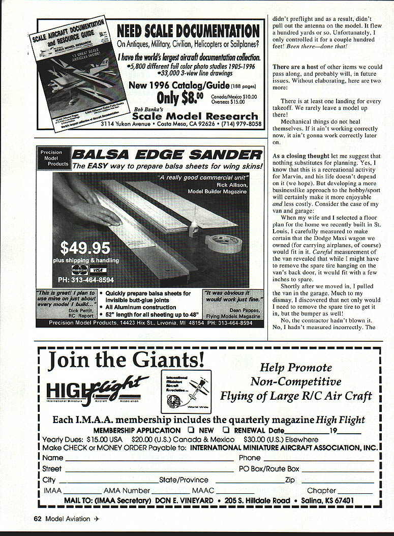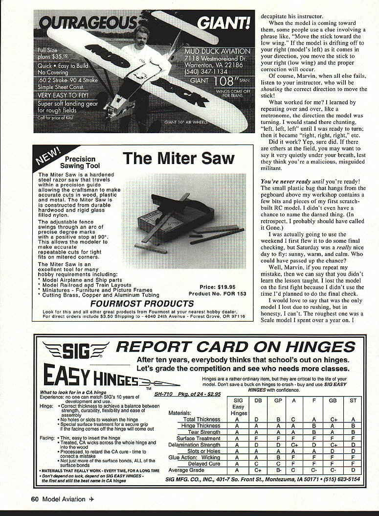 Bob Underwood 5S4 @hu fijj THIS MONTHS OFFERING comes under heading Been theredone people work diligently hiding attempting hide mistakes have perverse tendency let world know about Im certain Sigmund Freud something say about trait modern psychiatry would probably attribute condition some oblique comment mother made third birthday However paraphrased words Gone Wind character Frankly Scarlett dont give darn Life full situations can described lessons taughtlessons learned Unfortunately lessons often taught sometimes theyre never learned Consider following under heading lessons taught rest up you see what see critical time life occurred too long after started flying Pattern happened contest Columbia Missouri Saturday dawn brought beautiful blue sky dotted puffy white clouds gentle breeze perfect day point during first round flew model right set up slo o-o-w roll took eyes off model split second looked back couldnt find predominantly white model now tail-on line sight disappeared Fortunately caller could still see model calmly told roll pull up elevator did point model revealed planform view could see itkinda rest weekend slow rolls much shorter duration eye doctors appointment already scheduled following Monday assessment knowing about contest problem Wow need glasses Make certain having regular eye examinations can see model properly Free fighters RCers have greatest need youre Control Line flier cant see model its 60 70 feet away take up HO-gauge railroading No dummyyour other right Radio Control probably hardest lessons learn basic kindergarten stuff right left two times juxtaposition deadly duo rears ugly head first time comes finishing up model workshop Marvin Modeler has finished pride joy sits majestically workbench poised flight Marvin turns radio system checks controls Yep elevator goes up pulls stick toward him throttle opens pushes stick toward top transmitter rudder goes right pushes stick right right aileron goes up pushes stick right Whats wrong scene Marvin viewing model front rudder aileron wrongright make correct right Marvin heavens sake stand rear model look direction flight check two functions Fortunately Marvins club instructor will catch field PsstMarvin Im just trying keep feeling like dummy Marvin flying second part problem surfaces Unless model designed hy Burt Rutan will fly way around world will probably have turn fly himself number times during flight especially landing time several ways cope problem First can swing transmitter side body cranking head opposite way toward oncoming model kinda keeps right-left orientation dont feel thats very good method use Aside fact Marvin may wind up playing dueling antennas flier next him might also March 1996 59 decapitate instructor model coming toward some people use clue involving phrase like Move stick toward low wing model drifting off right models left comes direction move stick right low wing proper correction will occur course Marvin else fails listen instructor will shouting correct direction move stick What worked learned repeating over over like metronome direction model turning would stand chanting left left left until ready turn became right right right etc Did work Yep sure did others field may want say very quietly under breath lest think youre malicious misguided militant Youre never ready until youre ready small plastic bag hangs pegboard above workshop contains few bits pieces first scratchbuilt RC model didnt have chance name darned thing retrospect probably should have called Gone actually going use weekend first flew some final checking Saturday really nice day fly sunny warm calm could have passed up chance Well Marvin repeat mistake can say didnt learn lesson taught lost model first fight because didnt use time Id planned final check would love say model lost due rushing honesty cant roughest Scale model spent over year REPORT CARD ON HINGES After ten years everybody thinks schools out hinges Lets grade competition see needs classes SH-710 Pkg 24- 529a Materials Total Thickness Hinges rather ordinary item critical life model Dont save buck hinges crash buy use SIG EASY HINGES confidence SIG Easy Hinges DB D GP B C F GB ST Hinge ThicknessAAAABAB TearStrengthAAAABAB Surface TreatmentAFFFFFF D D C D C-iD LJOfl~UIflUtJISJLI OIULI sorHolesAAAAADD Glue Action WickingAABFFFF Delayed Cure Average Grade A 0 0 C BF C F 0F CF D What took CA hinge Experience no can match SIGs 10 years development use Hinge Correct thickness achieve balance between strength durability flexibility ease assembly No holes slots weaken hinge Special surface treatment secure grip facing comes off hinge will come out Facing Thin easy insert hinge Treated CA wicks across whole hinge wood Processed retard CA cure time correct mistake just surface bonds ALL surface bonds MATERIALS ThAT REALLY WORK EVERY TIME FOR LONG TIME Dont depend luck depend SIG EASY HINGESthe first still best name CA hinges 60 Model Aviation ision Sawing Tool Miter Saw Miter Saw hardened steel razor saw travels within precision guide allowing craftsman make accurate cuts wood plastic metal Miter Saw is constructed durable hardwood rigid glass filled nylon adjustable fence swings through arc precise degree marks positive stop 900 allows modeler make accurate repeatable cuts tight fits mitered corners Miter Saw excellent tool hobby requirements including * Model Airplane Ship parts * Model Railroad arid Train Layouts * Miniatures Furniture Picture Frames * Cutting Brass Copper Aluminum Tubing FOURMOST PRODUCTS Look other great products Irom Fourmost nearest hobby dealer direct orders include $3 50 Shipping 4040 24th Avenue Forest Grove OR 97116 Price $1995 Product No FOR 153 HINEE SIG MFG CO INC 401-7 So Front St Montezuma IA 50171 623-5154 SCALE DOCUMENTATION Antiques Military Civilian Helicopters Sailplanes hove wAls hirgest aircraft doojmentaiion collection 5800 different Full color photo studies 1905-1996 33000 3-view line drawings New 1996 Catalog/Guide 188 pages H