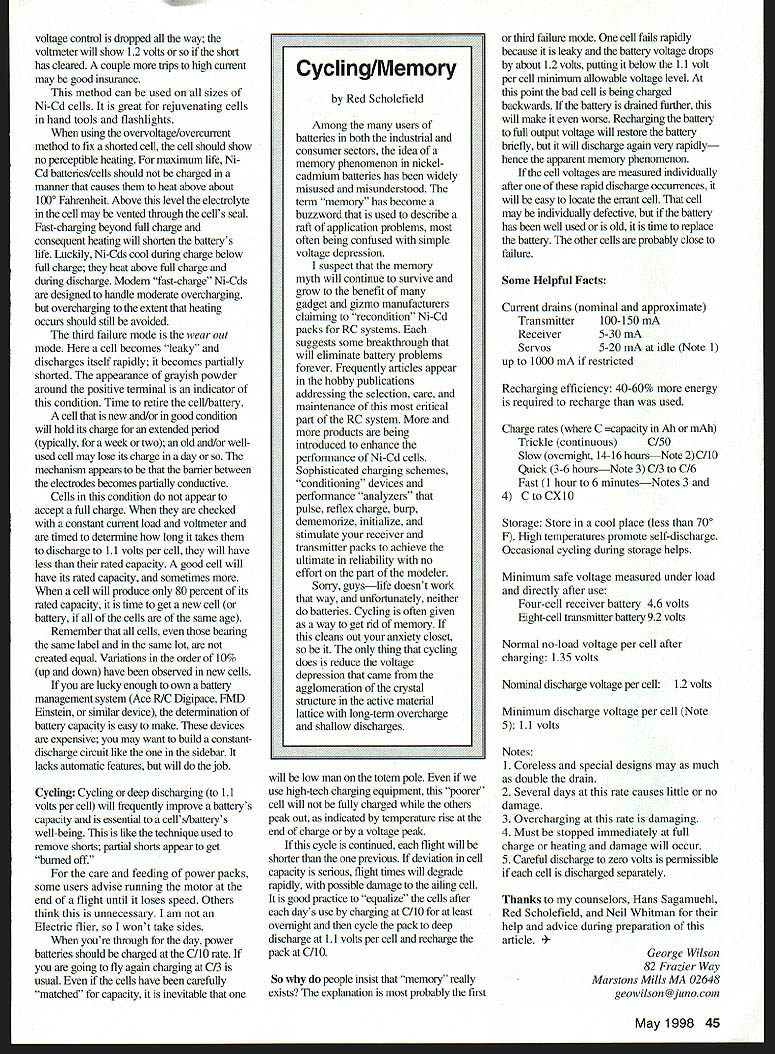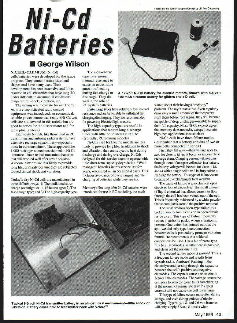 Ni-Cd Ba lie des U George Wilson NICKEL-CADMIUM Ni-Cd cells/batteries developed space program come sizes shapes have uses development has extensive has resulted cells/batteries have long life under difficult environmental conditions temperature shock vibration etc timing fortunate hobby As more-sophisticated radio control equipment introduced economical reliable power source ready Ni-Cd wet cells covered article good batteries starter motor glow plug igniters Light-duty Ni-Cds like used RC transmitters airborne radio systems have extensive recharge capabilitiesespecially transmitters approach 1000 recharges sometimes claimed Ni-Cd literature have retired transmitter batteries still worked well after seven seasons Airborne batteries less likely provide long life primarily because subjected mechanical shock vibration Todays dry Ni-Cd cells manufactured three different ways 1 traditional slowcharge overnight 14-16 hours type 2 fast-charge type 3 high-capacity type slow-charge type have enough internal resistance cause undesirable amount heating during fast charge discharge well role RC system batteries Fast-charge types have relatively low internal resistance better able withstand fast charging/discharging recommended powering Electric flight motors high-capacity types useful applications require long discharge times little no increase size typically RC Soaring models Ni-Cds used Electric models less likely provide long life addition shock vibration subject heat during discharge during overcharge Ni-Cds designed service seem operate little short-term capacity degradation Well managed batteries service last years used occasional basis includes avoidance overcharging charging batteries hot Memory long after Ni-Cd batteries introduced use RC modeling myth tho o,thnr rnnhin floninn hulill Ann ted about having memory problem myth states regularly draw small amount capacity before recharging will become incapable deep dischargesunable supply full capacity Most Ni-Cd experts agree memory does exist except certain high-tech applications see sidebar Ni-Cd cells have three failure modes Remember battery consists two cells connected series First fail opentheir voltage goes zero close it becomes impossible recharge Charging current will pass through open cell exists battery battery voltage will zero close single cell will impossible recharge battery type failure occurs because overcharging total wearout cause failure mechanical open circuit loss electrolyte small amount liquid chemical allows current flow through cell has vented out cell frequently evidenced white powder accumulates around positive tenninal obvious open-type failure broken wire between cells open circuit inside cell type failure frequently occurs airborne packs vibration present writer has pointed out spot-welded strip-type interconnection between cells particularly prone vibration failure recommends soldered connections used Use bit paste-type flux eg NoKrode little heat possible clean off residual flux second failure mode shorted frequent failure mode results crystals aka dendrites forming electrolyte passing through separator between cells positive negative electrodes crystals cause short circuit between electrodes voltage across cell goes zero close charging normal charging rate say /io rated current will cause cell recharge type failure occurs often during storage during periods tricklecharging Typically 48- 96-volt batteries will supply 36 84 volts May 1998 43 12-volt Ni-Cd battery electric motors shown 48-volt 100 mAh airborne battery gliders D cell Typical 96-volt Ni-Cd transmitter battery almost ideal environmentlittle shock vibration Battery cases held transmitter back Velcrot0 discharging shorted cell will produce no voltage will allow current flow through Note charged battery eight fewer cells shorted cell produces less voltage allowable minimum 11 volts per cell have methods used fix shorted Ni-Cd cells Most experts agree cell has shorted internally has fixed cell should used critical applications Use flashlight never alrborne RC system Shorted cells have traditionally fixed charging large capacitor several thousand microfarads 10 12 volts discharging plus-to-plus across shorted cell usually clears short cell will act normally thereafter favorite method use currentcontrolled bench power supply has voltmeter ammeter current llmiting cell placed across supply plus-to plus current through increased until voltage across jumps up 12 volts voltage increased watching current After reaching 5 10 amperes CONSTANT-CURRENT DISCHARGE CIRCUIT 24ohm 100 1v ohm ww set 20 ohm Wv fine set circuit useful determine battery cells capacity After fully charging battery cell set discharge current batterys nominal discharge value time long takes battery cell discharge 11 volts per cell discharge time hours times discharge current milliamperes mA will batterys capacity milliampere-hours discharge current measured using milliammeter multimeter set appropriate scale set using variable resistor shown circuit 24 ohm resistor sets maximum current about 300 mA minimum current will less 10 mA variable resistor should rated watt preferably will wire-wound type cannot find resistor values Radio Shack RS can supply substitutes LM 317 IC number 276-1778 24 ohm resistor can made five 10 ohm resistors RS 271-1301 parallel variable resistor can made using four 22 ohm resistors RS 271-1103 wired series switched multiposition switch RS 275-1386 20 ohm variable resistor RS 271-265A fine adjustment See circuit diagram Some transmitters use diode series charging circuits prevent reverse polarity connection charger cases discharger circuit must connected before diode will necessary open transmitter case get proper connection point Use care light cost automatic discharge/charge devices home-brew discharger may well worth effort 44 Model Aviation AA cells constitute 48-volt airborne Ni-Cd battery Five cells would increase servo powerand battery drain CONSTANT CURRENT L