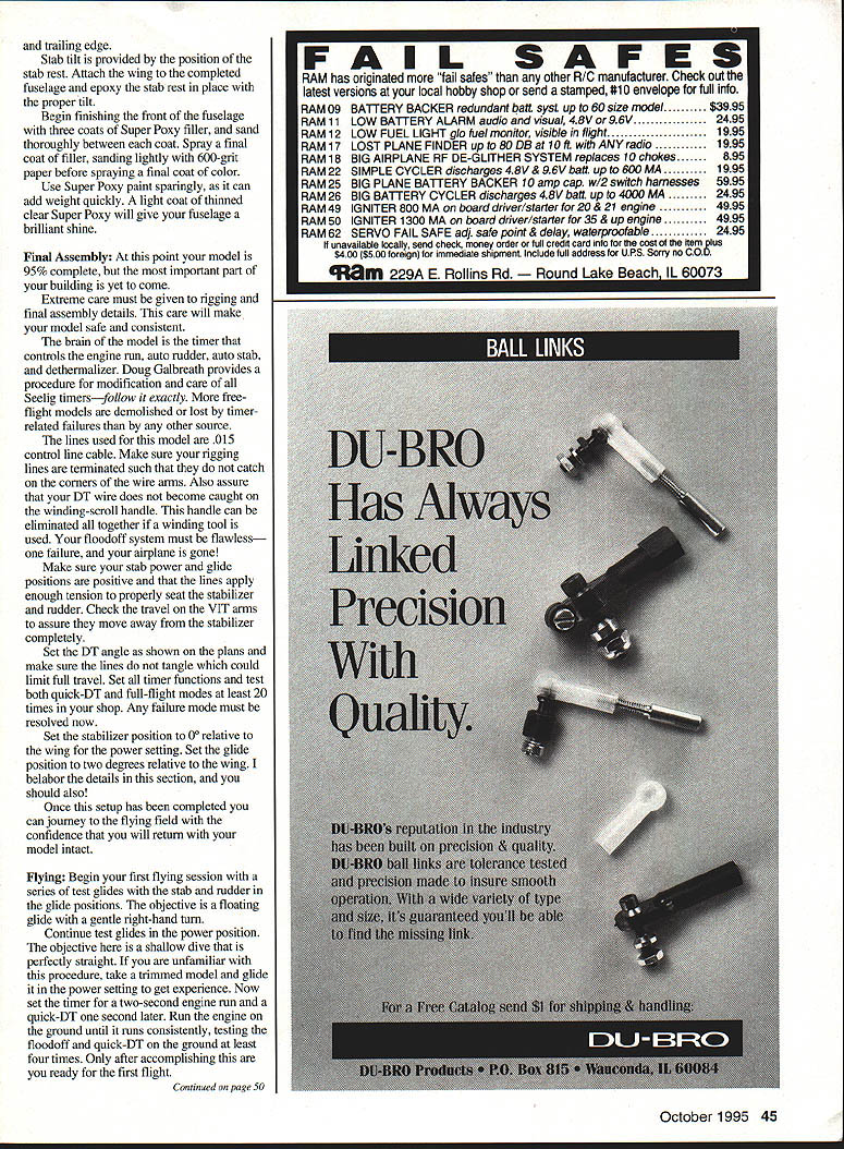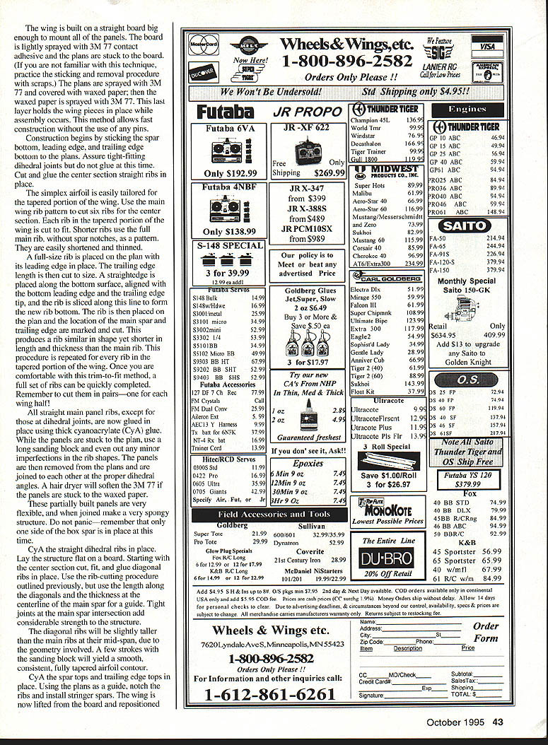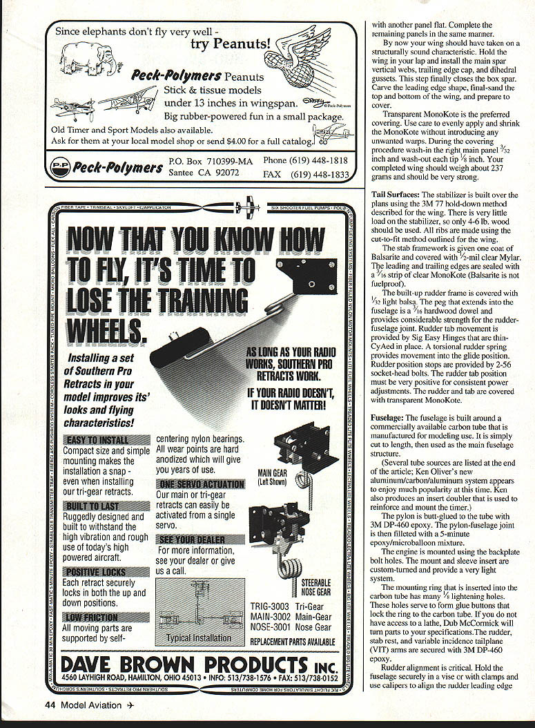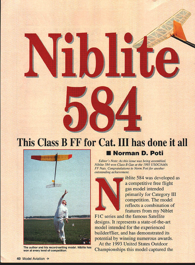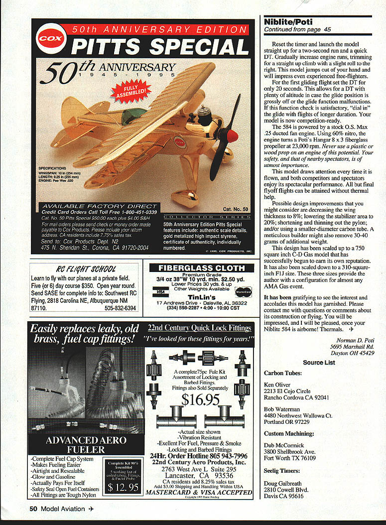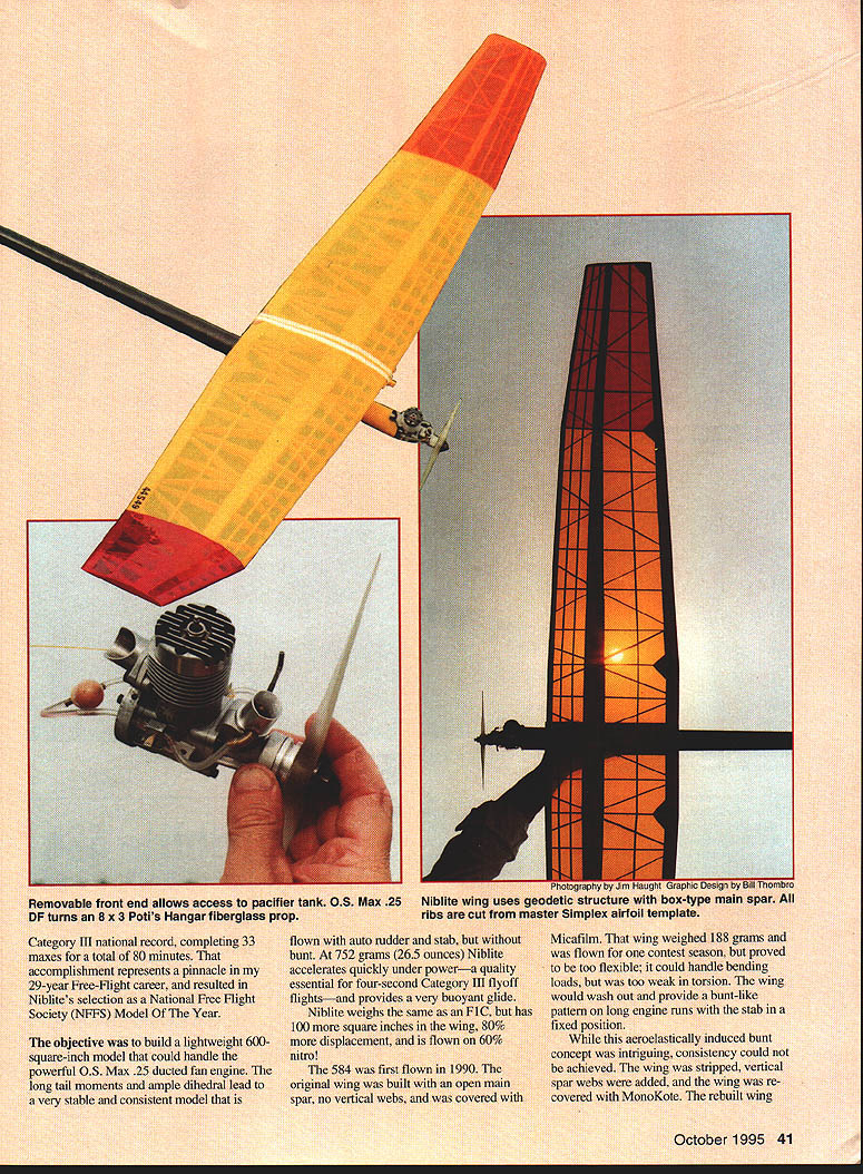 7 This_Class B FF Cat III has done U Norman D Poti Editors Note As issue being assembled Niblite 584 won Class B Gas 1995 USOC/AMA FF Nats Congratulations Norm Poti another outstanding achievement iblite 584 developed competitive free flight gas model intended primarily Category III competition model reflects combination features Niblet FiC series famous Satellite designs represents state-of-the-art model intended experienced builder/flier has demonstrated its potential winning numerous awards 1993 United States Outdoor Championships model captured 40 Model Aviation I author record-setting model Niblite has won level competition Removable front end allows access pacifier tank 05 Max 25 DF turns 8 x 3 Potis Hangar fiberglass prop Thornbro Niblite wing uses geodetic structure box-type main spar ribs cut master Simplex airfoil template Category III national record completing 33 maxes total 80 minutes accomplishment represents pinnacle 29-year Free-Flight career resulted Niblites selection National Free Right Society NFFS Model Year objective build lightweight 600square-inch model could handle powerful OS Max 25 ducted fan engine long tail moments ample dihedral lead very stable consistent model flown auto rudder stab bunt 752 grams 265 ounces Niblite accelerates quickly under powera quality essential four-second Category III flyoff flightsand provides very buoyant glide Niblite weighs same FlC has 100 square inches wing 80% displacement flown 60% nitro 584 first flown 1990 original wing built open main spar no vertical webs covered Micafilm wing weighed 188 grams flown contest season proved too flexible could handle bending loads too weak torsion wing would wash out provide bunt-like pattern long engine runs stab fixed position aeroelastically induced bunt concept intriguing consistency could achieved wing stripped vertical spar webs added wing re covered MonoKote rebuilt wing October 1995 41 49 grams heavier produced very stable configuration wing stabilizer utilize 9% 6% simplex flat-bottom airfoils respectively airfoils based logarithmic spiral has property producing curve geometrically similar original cut length property invaluable building wing tapered planform allows ribs cut master rib curve combination airfoils along 25% stabilizer set 34-inch moment produces very stable power pattern lightly loaded wing produces impressively slow glide Lets get its construction CONSTRUCTION Anyone attempting build model should familiar basic construction unusual techniques procedures will provided Wing first glance wing construction appears overwhelming task therefore will covered some detail wing built five parts eliminates typical center joint associated stress concentration major bending torsional loads carried closed fully tapered box spar spar built single unit instead assembled integral part wing construction construction technique allows straight diagonal ribs carry through spar five-panel layout produces four dihedral joints wood sizes densities can tailored minimize weight still carrying loads Note follow wood sizes indicated plans Center main tip spar wood should 8-10 6-8 4-6 lbicubic ft respectively rest wing carries little load required define airfoil shape therefore other wing components should 4-6 lb wood 42 Model Aviation plate-style engine mount bolts front carbon fuselage Seelig multifunction timer controls engine shutdown auto rudder tube Floodoff line timer L-shaped bracket stab DT functions Note stout skid Rudder sheet-covered structure spring-loaded tab Loop around fuselage attaches stab controls DT angle Hammers stab glide power positions pivot rearward DT Stab covered clear 1h-mil Mylar Niblite 584 Type FE Class B Wingspan 711/2 inches flat Wing area 584 square inches Engine OS Max 25 Flying weight 265 ounces Construction Built-up Covering/finish MonoKote Mylar wing built straight board big enough mount panels board lightly sprayed 3M 77 contact adhesive plans stuck board familiar technique practice sticking removal procedure scraps plans sprayed 3M 77 covered waxed paper waxed paper sprayed 3M 77 last layer holds wing pieces place assembly occurs method allows fast construction use pins Construction begins sticking spar bottom leading edge trailing edge bottom plans Assure tight-fitting dihedral joints glue time Cut glue center section straight ribs place simplex airfoil easily tailored tapered portion wing Use main wing rib pattern cut six ribs center section rib tapered portion wing cut fit Shorter ribs use full maln rib spar notches pattern easily shortened thinned full-size rib placed plan its leading edge place trailing edge length cut size straightedge placed along bottom surface aligned bottom leading edge trailing edge tip rib sliced along line form new rib bottom rib placed plan location main spar trailing edge marked cut produces rib similar shape yet shorter length thickness main rib procedure repeated rib tapered portion wing Once comfortable trim-to-fit method full set ribs can quickly completed Remember cut pairsone wing half straight main panel ribs except dihedral joints now glued place using thick cyanoacrylate CyA glue panels stuck plan use long sanding block out minor imperfections rib shapes panels removed plans joined other proper dihedral angles hair dryer will soften 3M 77 panels stuck waxed paper partially built panels very flexible joined make very spongy structure panicremember side box spar place time CyA straight dihedral ribs place Lay structure flat board Starting center section cut fit glue diagonal ribs place Use rib-cutting procedure ouflined previously use length along diagonals thickness centerline main spar guide Tight joints main spar intersection add considerable strength structure diagonal ribs will slightly taller main ribs mid-span due geometry involved few strokes sanding block will yield smooth consistent fully tapered airfoil contour CyA spar tops trailing edge tops place Using plans guide notch ribs install stringer spars wing no