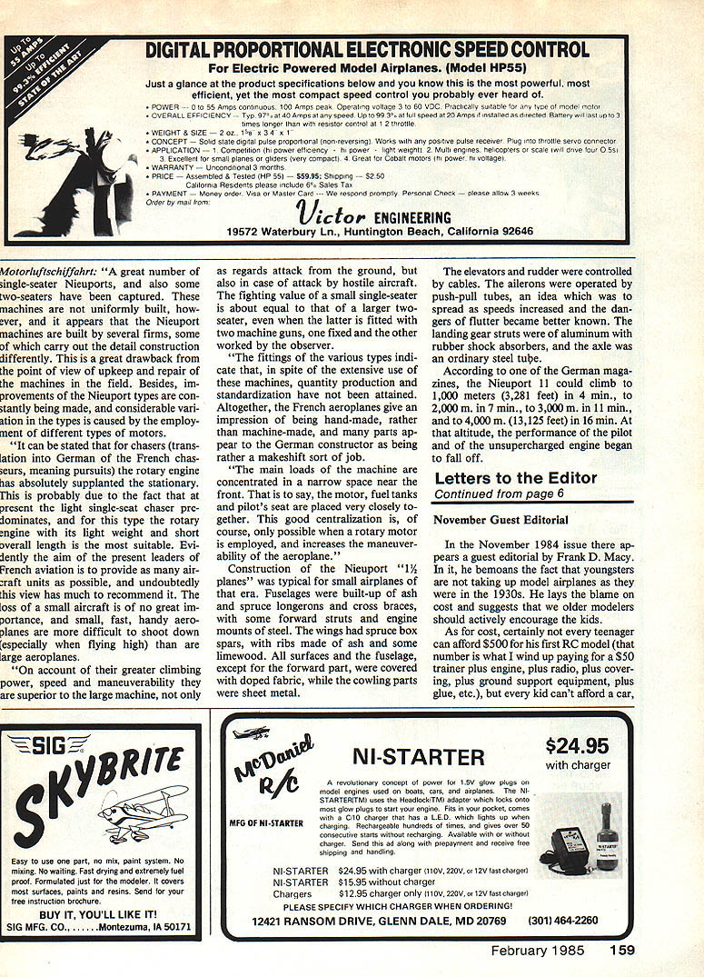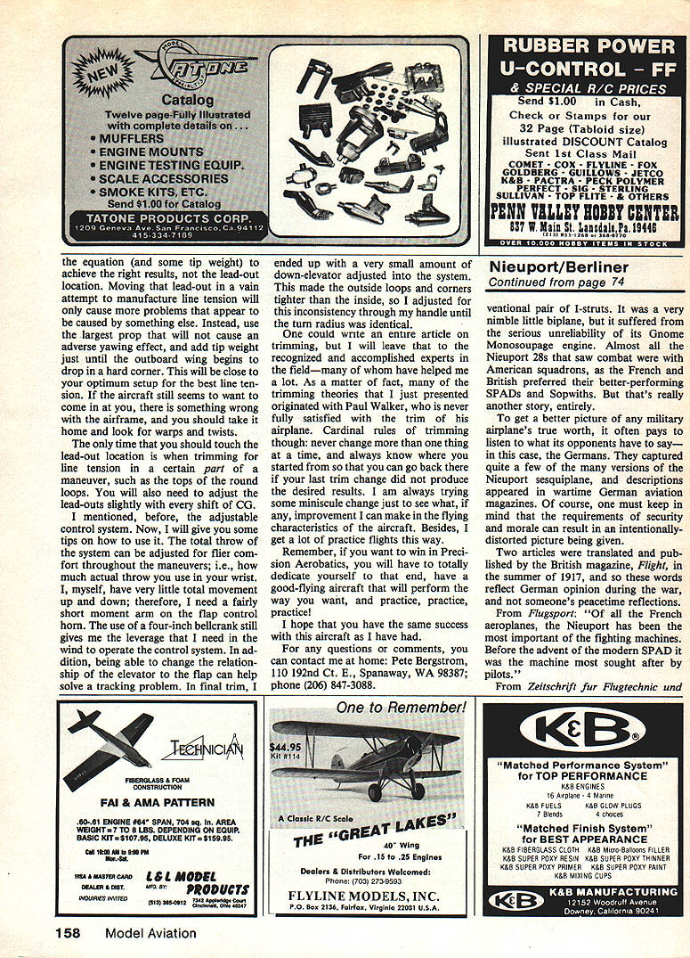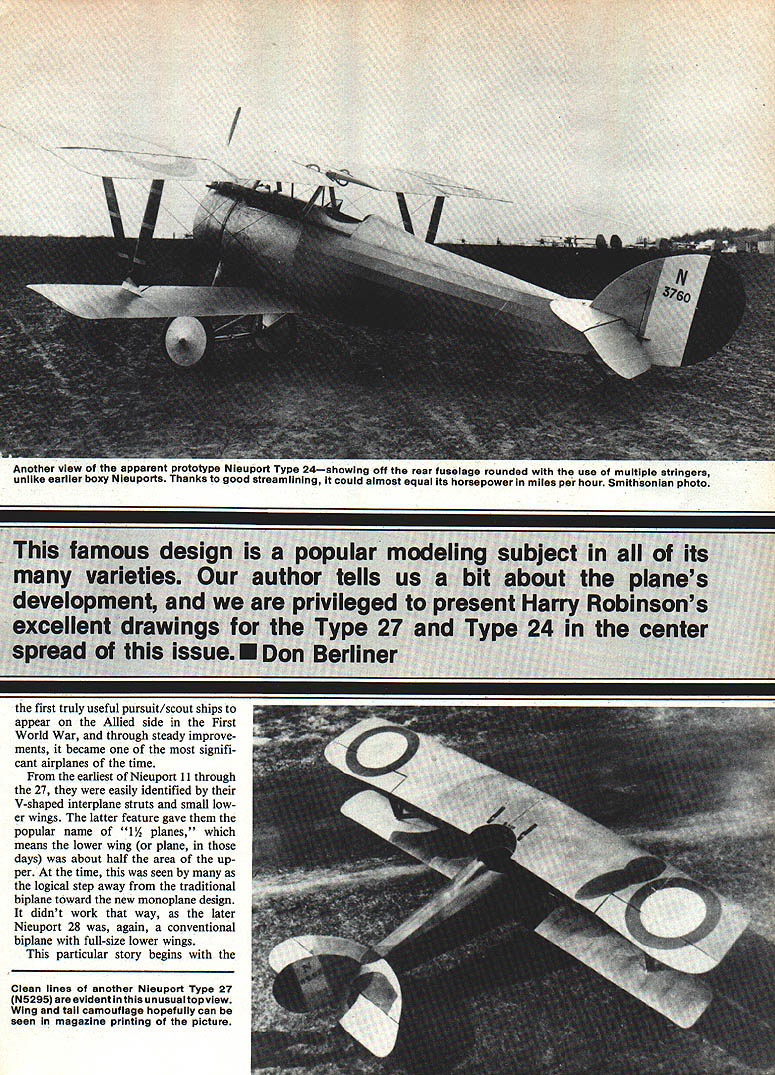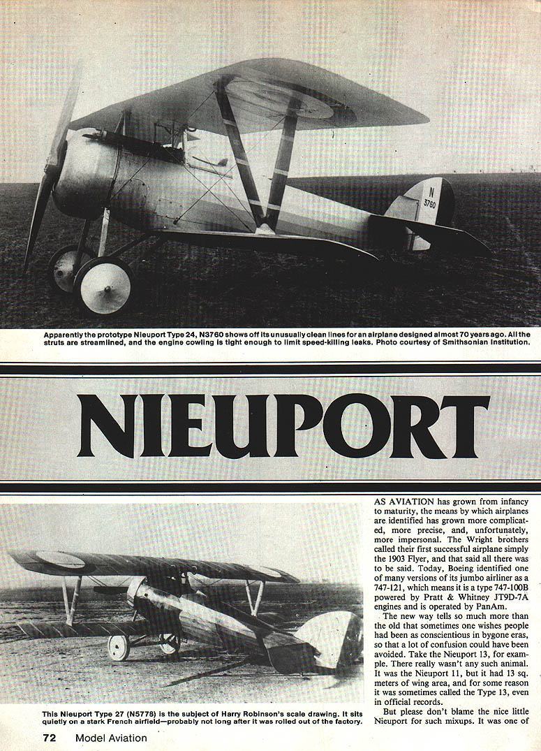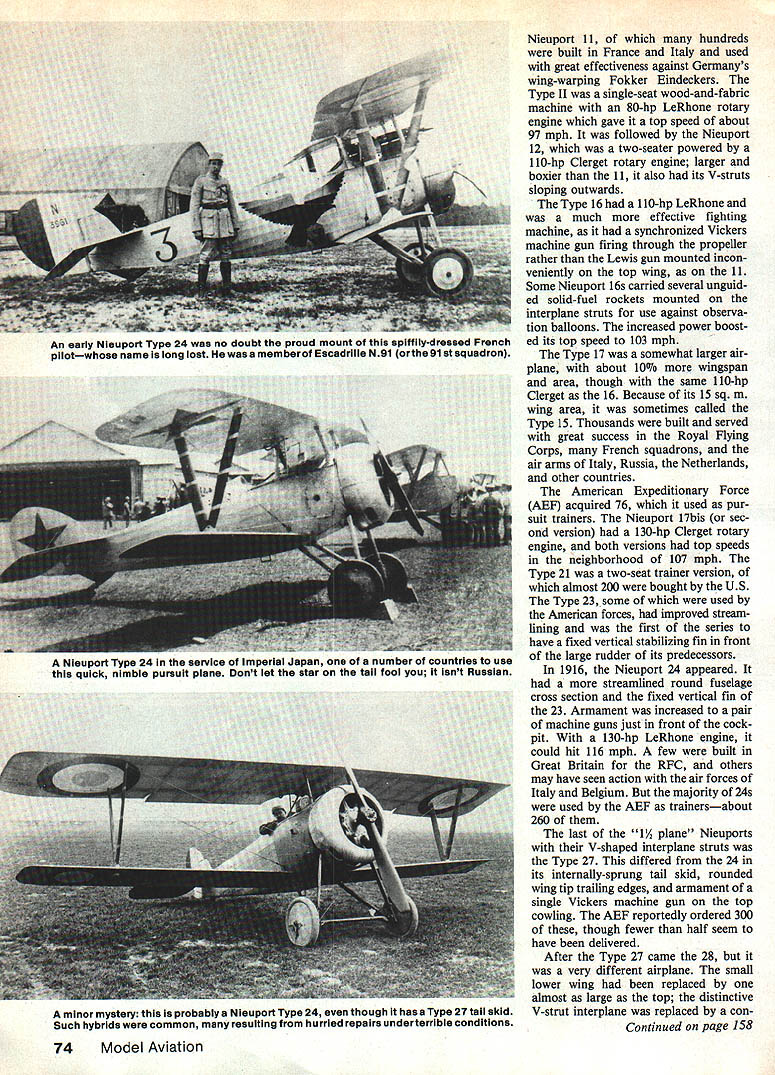 Apparunily prototype Niouport Type 24 N3760 shows off Its unusually clean lines airplane designed almost 70 years ago struts streamlined engine cowling tight enough limit speed-kIlling leaks Photo courtesy Smithsonian institution AVIAIIUIN nas grown trom miancy maturity means airplanes identified has grown complicat ed precise unfortunately impersonal Wright brothers called first successful airplane simply 1903 Flyer said said Today Boeing identified versions its jumbo airliner 747-121 means type 747-bOB powered Pratt & Whitney JT9D-7A engines operated PanAm new way tells much old sometimes wishes people conscientious bygone eras lot confusion could have avoided Take Nieuport 13 exam ple really wasnt such animal Nieuport 11 13 sq meters wing area some reason sometimes called Type 13 official records please dont blame nice little Nienport such mixups 72Model Aviation Nicuport Type 27 N5778 subject Harry Robinsons scale drawing sits quietly stark French airfieldprobably long after rolled out factory Another view 0 apparent prototype Nieuport Type 24showing off rear fuselage rounded use multiple stringers unlike earlier boxy Nleuports Thanks good streamlining could almost equal Its horsepower miles per hour Smithsonian photo first truly useful pursuit/scout ships appear Allied side First World War through steady improve ments became signifi cant airplanes time earliest Nieuport 11 through 27 easily identified V-shaped interplane struts small low er wings latter feature gave popular name 1 1A planes means lower wing plane days about half area up per time seen logical step away traditional biplane toward new monoplane design didnt work way later Nieuport 28 again conventional biplane full-size lower wings particular story begins Clean lines another Nieuport Type 27 N5295 evident unusual topview Wing tail camouflage hopefully can seen magazine printing picture Nieuport 11 hundreds built France Italy used great effectiveness against Germanys wing-warping Fokker Eindeckers Type II single-seat wood-and-fabric machine 80-hp LeRhone rotary engine gave top speed about 97 mph followed Nieuport 12 two-seater powered 110-hp Clerget rotary engine larger boxier 11 also its V-struts sloping outwards Type 16 110-hp LeRhone much effective fighting machine synchronized Vickers machine gun firing through propeller rather Lewis gun mounted incon veniently top wing 11 Some Nieuport 16s carried several unguid ed solid-fuel rockets mounted interplane struts use against observa tion balloons increased power boost ed its top speed 103 mph Type 17 somewhat larger air plane about 10% wingspan area though same 110-hp Clerget 16 Because its 15 sq m wing area sometimes called Type 15 Thousands built served great success Royal Flying Corps French squadrons air arms Italy Russia Netherlands other countries American Expeditionary Force AEF acquired 76 used pur suit trainers Nicuport l7bis sec ond version 130-hp Clerget rotary engine both versions top speeds neighborhood 107 mph Type 21 two-seat trainer version almost 200 bought US Type 23 some used American forces improved stream lining first series have fixed vertical stabilizing fin front large rudder its predecessors 1916 Nieuport 24 appeared streamlined round fuselage cross section fixed vertical fin 23 Armament increased pair machine guns just front cock pit 130-hp LeRhone engine could hit 116 mph few built Great Britain RFC others may have seen action air forces Italy Belgium majority 24s used AEF trainersabout 260 last l/2 plane Nieuports V-shaped interplane struts Type 27 differed 24 its internally-sprung tail skid rounded wing tip trailing edges armament single Vickers machine gun top cowling AEF reportedly ordered 300 though fewer half seem have delivered After Type 27 came 28 very different airplane small lower wing replaced almost large top distinctive V-strut interplane replaced conContinued page 158 74Model Aviation An early Niouport Type 24 no doubt proud mount spiffily-dressed French pilotwhose name iong lost member Escadrille N91 orthe 91st squadron Nisuport Type 24 service 0 imperial Japan OT number countries use quick nimble pursuit plane Dont let star tail fool isnt Russian minor mystery probably Nieuport Type 24 though has Type 27 tail skid Such hybrids common resulting hurried repairs underterribie conditions equation some tip weight achieve right results lead-out location Moving lead-out vain attempt manufacture line tension will cause problems appear caused something else Instead use largest prop will cause adverse yawing effect add tip weight just until outboard wing begins drop hard corner will close optimum setup best line ten sion aircraft still seems want come something wrong airframe should take home look warps twists time should touch lead-out location trimming line tension certain part maneuver such tops round loops will also need adjust lead-outs slightly shift CO mentioned before adjustable control system Now will give some tips use total throw system can adjusted flier com fort throughout maneuvers ie much actual throw use wrist myself have very little total movement up down therefore need fairly short moment arm flap control horn use four-inch bellcrank still gives leverage need wind operate control system ad dition being able change relation ship elevator flap can help solve tracking problem final trim V ended up very small amount down-elevator adjusted system made outside loops corners tighter inside adjusted inconsistency through handle until turn radius identical could write entire article trimming will leave recognized accomplished experts fieldmany have helped lot As matter fact trimming theories just presented originated Paul Walker never fully satisfied trim airplane Cardinal rules trimming though never change thing time always know started can go back last trim change did produce desired results am always trying some miniscule change just see what improvement can make flying characteristics aircraft Besides get lot practice flig