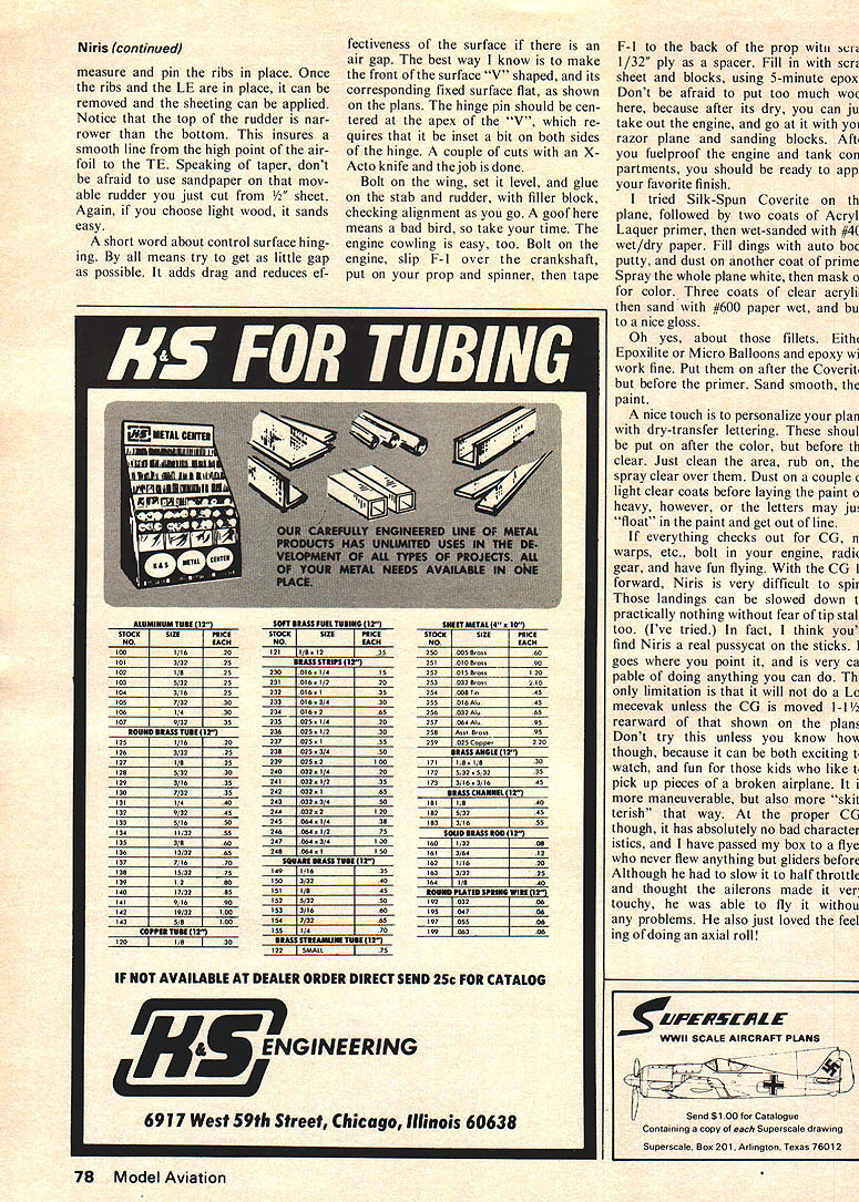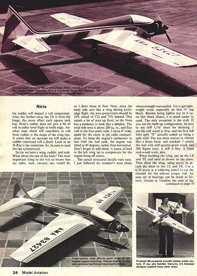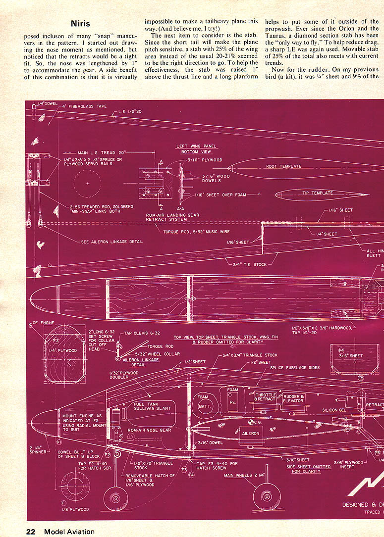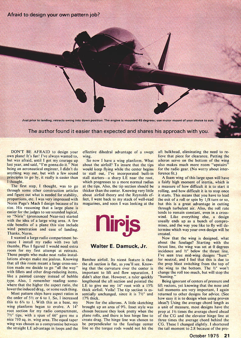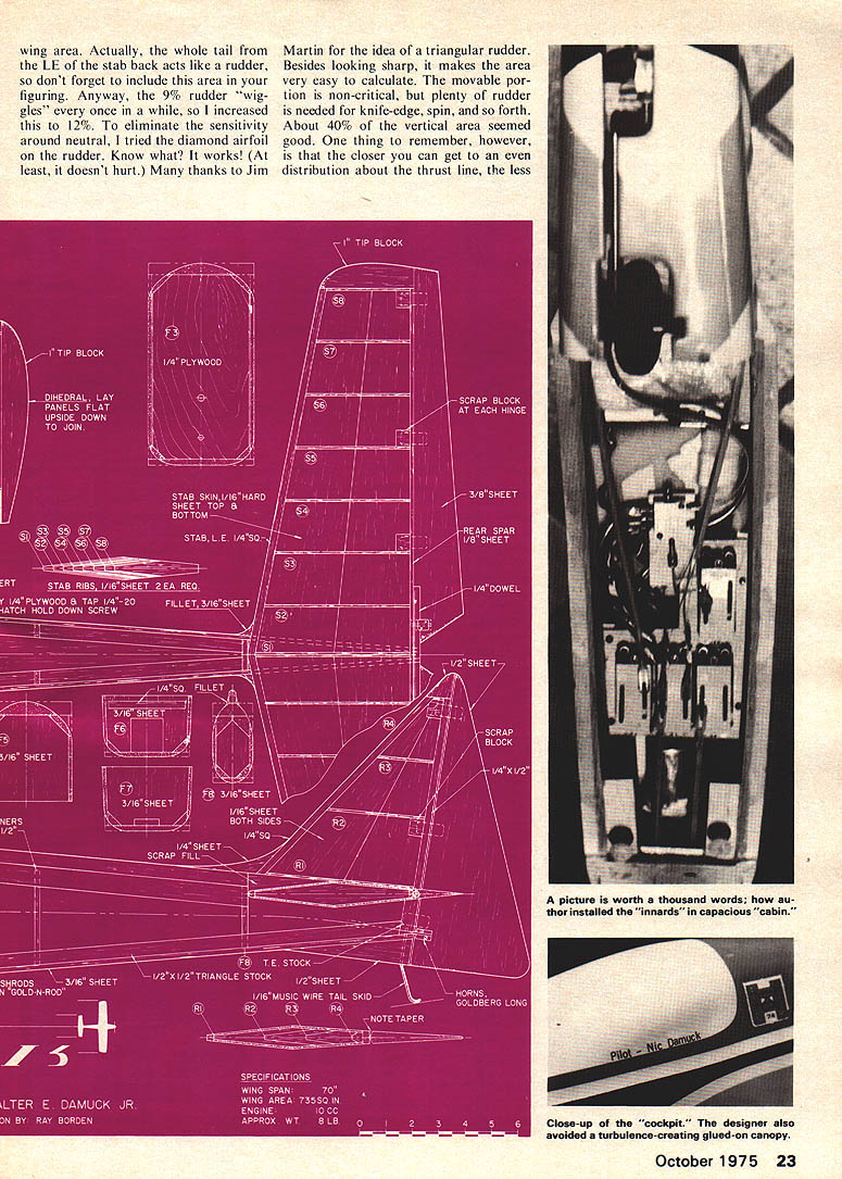 DONT BE AFRAID design own plane Its fun Ive always wanted afraid until got courage up last year said Im gonna being aeronautical engineer didnt anything way out few sound principles go really easier thought first step thought go through some other construction articles figure out what needed stability proportions etc very impressed Norm Pages Mach design because its size reasoning large plane easier judges see sounded logical Niris pronounced Near-iss started idea large wing area few side benefits plane size include wind penetration ease landing Thanks Norm wanted large radio compartment cause install radio two left thumbs Plus figured would need extra room first attempt retracts people make neat radio instal lations always make jealous Knowing room meant large cross-sec tion made decide go way fillets other drag-reducing items like painted canopy instead bubble type Also remember reading some higher aspect ratio lower induced drag some such thing Most pattern ships have aspect ratios order 5 6 So increased 6 base wing planform began evolve 14 root section radio compartment 7/2 tips span 66 gave nice 710 sq wing area equal taper wing chosen compromise between straight LE advantage loops effective dihedral advantage swept wing So now have wing planform What about airfoil insure tips would keep flying center begins stall out Ive incorporated built-in stall starters sharp LE near root progresses normal radius tips Also tip section should thicker center Knowing very little about airfoil theory Reynolds ef fect went back stack well-read magazines soon looking U flirjp Walter E DamuckJr Banshee airfoil Its nicest feature aft section flat youll see Know ing curvature over center important lift flow separation didnt alter However ruler quickly lengthened aft section pointed LE give 14 root 15% thick airfoil Voila tip section es sentially unchanged since 7 17% thick Now ailerons little sketching brought up ares 9% Inset style chosen because look pretty plane rolls less hinge line create drag hinge line chosen perpendicular fuselage center line torque rods would hit aft bulkhead eliminating need re lieve piece clearance Putting aileron servo bottom wing also makes much room upstairs radio gear No worry about inter ference fit foam wing large span will have fairly high moment inertia measure difficult start rolling difficult stop once starts means have lead exit roll spin 1/8 turn great advantage cutting through turbulent air Also roll rate tends remain constant cross wind Like everything else design usually ends up bunch compro mises way like fly will de termine way own design will created Now wing designed what about fuselage Starting thrust line wing set 0 degrees incidence w thrust line Ive seen true mid-wing designs hunt neutral feel due prop blast switching top wing bottom change roll too much will stop hunting Being ignorant centers pressure lift vectors yet knowing nose tail moments very important again returned other designs advice See easy design using proven ideas Using average chord length unit measure designs have prop 1 times average chord ahead CG elevator hinge line three times average chord behind CG changed slightly shortened tail moment 28 because proOctober1975 21 Niris posed incluson snap maneu vers pattern started out draw ing nose moment mentioned noticed retracts would tight fit So nose lengthened accommodate gear side benefit combination virtually impossible make tailbeavy plane way believe try next item consider stab Since short tail will make plane pitch sensitive stab 25% wing area instead usual 20-21% seemed right direction go help effectiveness stab raised 1 above thrust line long planform helps put some outside propwash Ever since Orion Taurus diamond section stab has way fly help reduce drag sharp LE again used Movable stab 25% total also meets current trends Now rudder previous bird kit t 9% 22 Model Aviation wing area Actually whole tail LE stab back acts like rudder dont forget include area figuring Anyway 9% rudder wig gles once increased 12% eliminate sensitivity around neutral tried diamond airfoil rudder Know what works least doesnt hurt thanks Jim Martin idea triangular rudder Besides looking sharp makes area very easy calculate movable por tion non-critical plenty rudder needed knife-edge spin forth About 40% vertical area seemed good thing remember however closer can get distribution about thrust line less October1975 23 picture worth thousand words au thor installed innards capacious cabin Close-up coclcpit designer also avoided turbulence-creating glued-on canopy Niris rudder will impart roll component Also further away TE hinge effect square inch has Niriss rudder does give bit roll either level flight knife edge An other item will contribute roll rudder shape wing tips seems upswept tip will make rudder command roll plane Look H-Rays tips sometime So sure sand tips symmetrical So far have wing rudder stab What about rest body Important thing insure radio tank retracts etc would fit drew first Next since body side acts like wing during knifeedge flight area proportions should 25% ahead CG 75% behind meant lot area up front Niris has tendency look like dolphin total side area about 200 sq flies well four-point rolls chose 4 wide again room radio compart ment keep engines carburetor line fuel tank engine tilted 45 degrees rather horizontal Dont forget add about e lead left wing tip compensate engine being off center actual structural details easy just followed modelers nose about strength needed Try get light weight wood especially block Besides being lighter up 6 oz block alone much easier sand exception stab use built-up configuration sure use stiff 1/16 sheet skinning use soft wood first first full bore split S actually ended up being split stab top sheet started vibrate like drum head cracked rebuilt stab stiff quarter-grain wood 200 flights later still fine foam stab would work also building wing put LE TE sand shown plans sheet wing using epoxy tach 