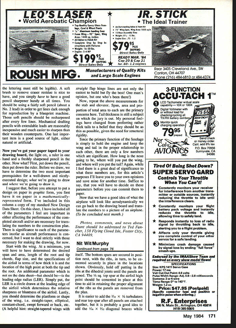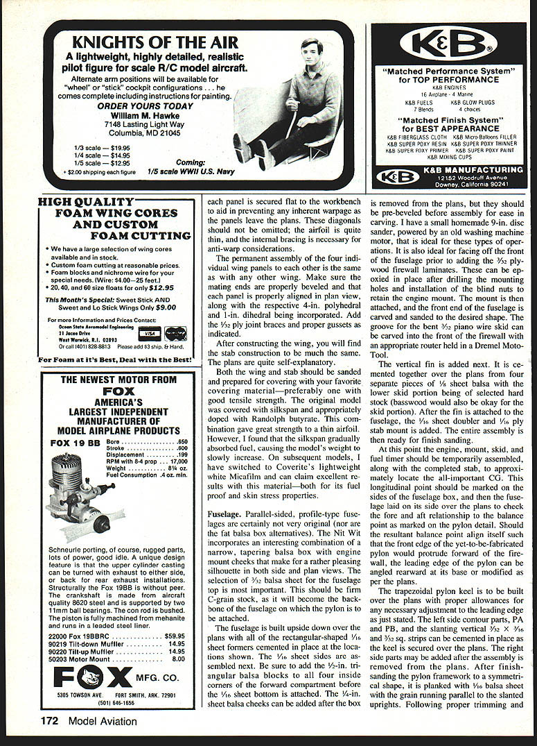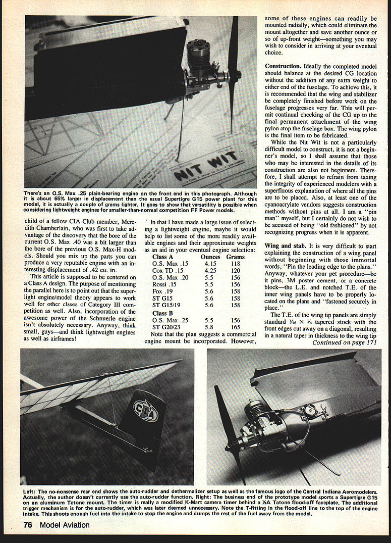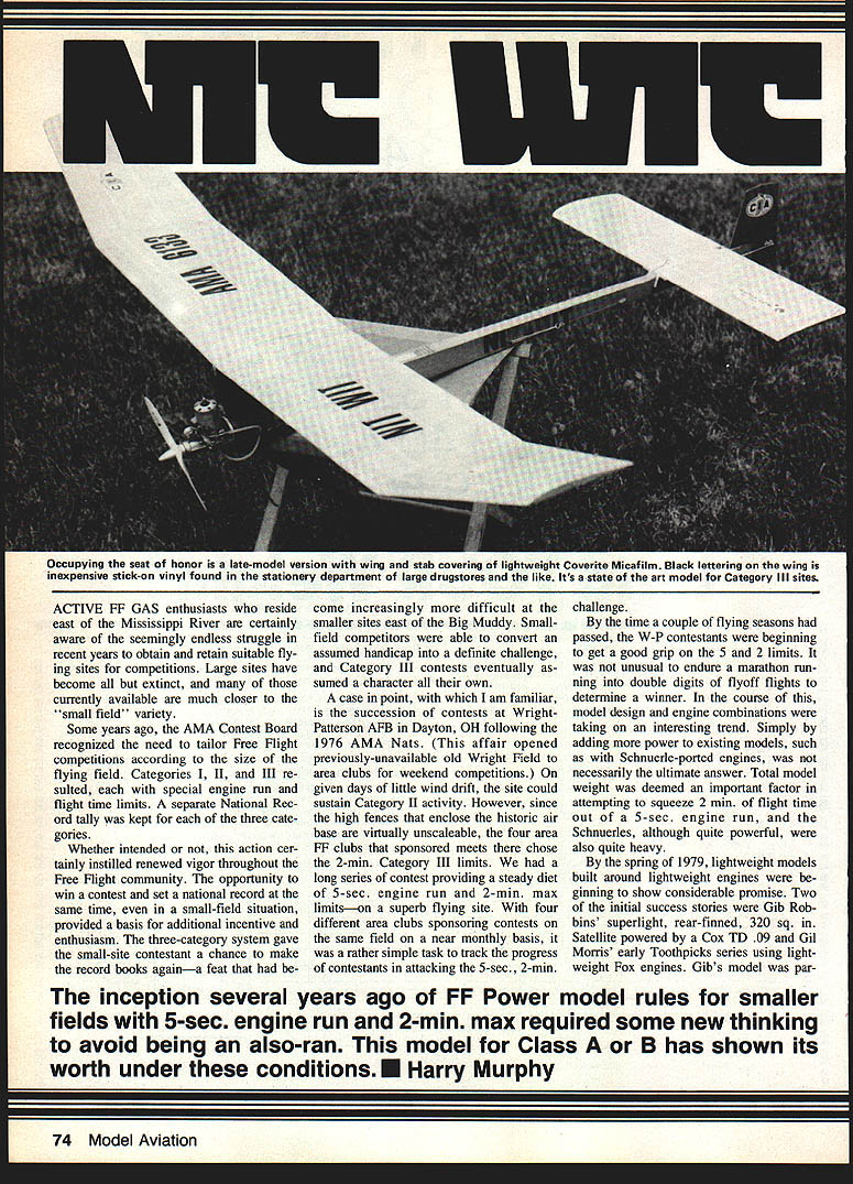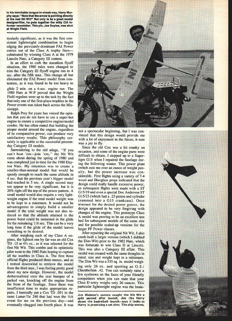 Occupying seat honor late-model version wing stab covering lightweight Coverite Micafilm Black lettering wing inexpensive stick-on vinyl found stationery department large drugstores like Its state art model Category Ill sites ACTIVE FF GAS enthusiasts reside east Mississippi River certainly aware seemingly endless struggle recent years obtain retain suitable fly ing sites competitions Large sites have become extinct currently available much closer small field variety Some years ago AMA Contest Board recognized need tailor Free Flight competitions according size flying field Categories II LII re sulted special engine run flight time limits separate National Rec ord tally kept three cate gones Whether intended action cer tainly instilled renewed vigor throughout Free Flight community opportunity win contest set national record same time small-field situation provided basis additional incentive enthusiasm three-category system gave small-site contestant chance make record books againa feat become increasingly difficult smaller sites east Big Muddy Smallfield competitors able convert assumed handicap definite challenge Category III contests eventually sumed character own case point am familiar succession contests WrightPatterson AFE Dayton OH following 1976 AMA Nats affair opened previously-unavailable old Wright Field area clubs weekend competitions given days little wind drift site could sustain Category II activity However since high fences enclose historic air base virtually unscaleable four area FF clubs sponsored meets chose 2-mm Category III limits long series contest providing steady diet 5-sec engine run 2-mm max limitson superb flying site four different area clubs sponsoring contests same field near monthly basis rather simple task track progress contestants attacking 5-sec 2-mm challenge time couple flying seasons passed W-P contestants beginning get good grip 5 2 limits unusual endure marathon run ning double digits flyoff flights determine winner course model design engine combinations taking interesting trend Simply adding power existing models such Schnuerle-ported engines necessarily ultimate answer Total model weight deemed important factor attempting squeeze 2 mm flight time out 5-sec engine run Schnuerles although quite powerful also quite heavy spring 1979 lightweight models built around lightweight engines ginning show considerable promise Two initial success stories Gib Robbins superlight rear-finned 320 sq Satellite powered Cox TD 09 Gil Morris early Toothpicks series using light weight Fox engines Gibs model parThe inception several years ago FF Power model rules smaller fields 5-sec engine run 2-mm max required some new thinking avoid being also-ran model Class B has shown its worth under conditionsE Harry Murphy 74 Model Aviation inimitable tongue-In-cheek way Harry Mur phy says Note arrow pointing directly real Nit Wit i great model designer/f puts together witty CIA former newsletter plc Joe Guyias shot Wright Fieid ticularly significant first con sistent lightweight combination begin edging previously-dominant FAI Power entries out Class trophy lines culminated winning Class 1979 Lincoln Nats Category III contest effort curb marathon flyoff situation 1980 rules changed trim Category III flyoff engine run 4 sec after fifth max change eliminated FAI Power model con tention found too heavy glide 2 mm 4-sec engine run 1980 Nats W-P proved Wright Field regulars up task fact first-place trophies Power events taken back across Mis sissippi Ralph Prey years has voiced opin ion have use super-hot engine ensure competitive engine/model combo has often stated building proper model around engine regardless its comparative power can produce very satisfactory results philosophy cer tainly applicable successful presentday Category III models Surrendering old adage cant beat emjoin em Nit Wit came about during spring 1980 completed just time 1980 Day ton Nats intention create smaller-than-normal model would speedy enough reach same altitude 4 sec previous years bigger model reached 5 sec single second may appear very significant 20% right off top power pattern small model would also require very light weight engine total model weight kept minimum would advantageous simply build smaller model total weight also re duced altitude attained power burst could sustained glide remaining 116 sec can very long time glide model leaves something desired After weighing Class en gines lightest far old Cox TD 15 4'4 oz selected first Nit Wit combo its optimistic pilot went 1980 Nats hoping capture marbles Class first three official flights produced three maxes trotted downwind retrieve model third max feeling pretty good about new design However model dethermalized onto rear bumper parked van knocking off engine front fuselage Since insufficient time make appropriate re pairs hurriedly put Cox TD 051 same Lunar-Tic 240 won event previous dayand eventually chugged fourth place spectacular beginning con vinced design would provide lot enjoyment future sure joy fly Since old Cox bit cranky occasion some engine parts difficult obtain stepped up Super tigre G 15 repaired fuselage dur ing following winter power plant switch cost over ounce weight pen alty power increase con siderable First flights using variety 7-4 wood fiberglass props indicated design could really handle excessive power subsequent flights made ST G15/19 special Doc Anderson ST G 15/23 23 piston cylinder crammed GLS crankcase Once trimmed desired power groove design appeared very forgiving changes engine prototype Class model proving excellent test bed subsequent models same size possible scaled-up versions larger FF Power classes After repairing original Nit Wit also crash-built larger version dubbed Dim-Wit prior 1982 Nats fortunate win Class D Lincoln also Category III affair model created same thoughts mind size weight kept minimum Dim Wit 535 sq model weigh ing 26 oz sporting OS Chamberlain 42 can certainly raise few eyebrows