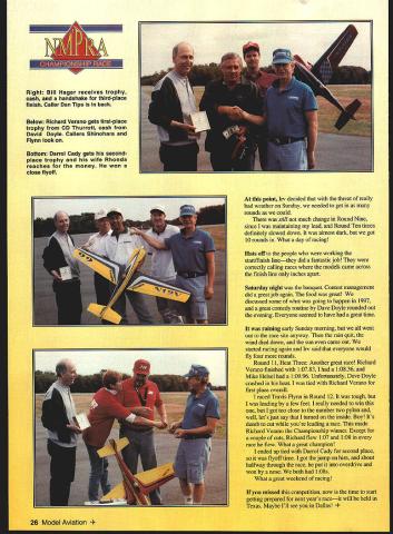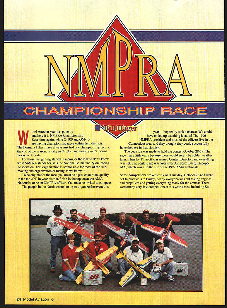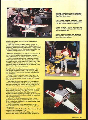 II Wow Another year has gone NMPRA Championship Race time again Q-500 QM-40 having championship races within districts Formula fliers have always just championship race end season usually October usually California Texas Florida just getting started racing dont know what NMPRA stands National Miniature Pylon Racing Association organization responsible rule making organization racing know eligible race must past champion qualify top 20% district finish top ten AMA Nationals NMPRA officer must invited compete people North wanted try organize event yearthey really took chance could have ended up watching snow 1996 NMPRA president officers live Connecticut area thought could successfully have race vicinity decision made hold contest October 28-29 race little early because would surely colder weather later Irv Thurrott named Contest Director everything set contest site Westover Air Force Base Chicopee MA also site 1992 AMA Nationals Some competitors arrived early Thursday October26 went out practice Friday nearly everyone out testing engines propellers getting everything ready contest very fast competitors years race including Ste 24 Model Aviation site Top five/callers Front Cady/Cady Verano/Flynn Back Chapdelaine/Glode Hager/Tips Masi/Petrone Left Former NMPRA president Lloyd Burnham works Kaze some help race Contest Director Thurrott Below Jessica Thurrott borrowed airplane Richard Verano finished 10tha very good flier Bottom Dave Chapdelaine Best Show Tom Cat Dave fInished fourth years Championship Race McAfeehe would look out Saturday morning arrived Friday night final registration scale judging Yes Formula airplanes still judged takeoff order 1-324 pilot tries have best-looking model trophy Best Show whoever wins always takes off first Dave Chapdelaine took top honors beautiful Tom Cat Saturday morning high winds threat rain everyone still got off good start first-round action Mike Masi won first heat Stu McMee second Travis Flynn flameoutthats happened its way start contest Dave Chapdelaine flew 108 win heat Richard Verano won heat refly time 10722 Ivlike Helsel won heat 111 competitors off fast starts fact windy didnt seem bother anyone very much Round Two Lloyd Burnham winning heat time 108 won heat 109 Mike Helsel won Richard Verano cut out heat Mike Masi took another win Richard Verano came back Round Three Heat Four another 107 beat Dave Chapdelaine Ralph Rinaldi flew 109 edge out Travis Flynn got together win heat Mike Helsel great race 10928 just enough win over Lloyd Bumbams 10935 see race believe itIm glad didnt have call still anyones contest win since fast fliers left great race Round Four Sm McMee flew 109 just surpassing Dave Doyles Darrol Cadys 11 1Darrol just tick slower Dave Mike Helsel crashed beautiful Kaze Richard Verano turned 107 same time previous round Jessica Thurrott finally got going flew 107 another win Round Five Lloyd Burnham crashed shame because sure moving Lloyd backup never did get going first place end Round Five just getting started Round Six Richard Verano beat 108 Jessica Thurrott 11133 beaten great race Darrol Cady 11123 Round Seven Sm McMee crashed Richard Verano slowed down finished 108 much change Round Eight close race Travis FlynnI finished ahead him inches April 1997 25 Right Bill Hager receives trophy cash handshake third-place finish Caller Dan Tips back Below Richard Verano gets first-place trophy CD Thurrott cash David Doyle Callers Shinohara Flynn look Bottom Darrol Cady gets secondplace trophy wife Rhonda reaches money won close flyoff point li-v decided threat really bad weather Sunday needed get rounds could still much change Round Nine since maintaining lead Round Ten times definitely slowed down almost dark got 10 rounds What day racing Hats off people working start/finish linethey did fantastic job correctly calling races models came across finish line inches apart Saturday night banquet Contest management did great job again food great discussed some what going happen 1997 great comedy routine Dave Doyle rounded Out evening Everyone seemed have great time raining early Sunday morning went out race site anyway rain quit wind died down sun came out started racing again liv said everyone would fly four rounds Round 11 Heat Three Another great race Richard Verano finished 107831 10836 Mike Helsel 10996 Unfortunately Dave Doyle crashed heat tied Richard Verano first place overall raced Travis Flynn Round 12 tough leading few feet really needed win got too close number two pylon well lets just say turned inside Boy Its dumb cut youre leading race made Richard Verano Championship winner Except couple cuts Richard flew 107 108 race flew What great champion ended up tied Darrol Cady second place soit flyoff time got jump him about halfway through race put overdrive won nose both 1 08s What great weekend racing missed competition now time start getting prepared next years raceit will beheld Texas Maybe Ill see yot Dallas odel Aviation