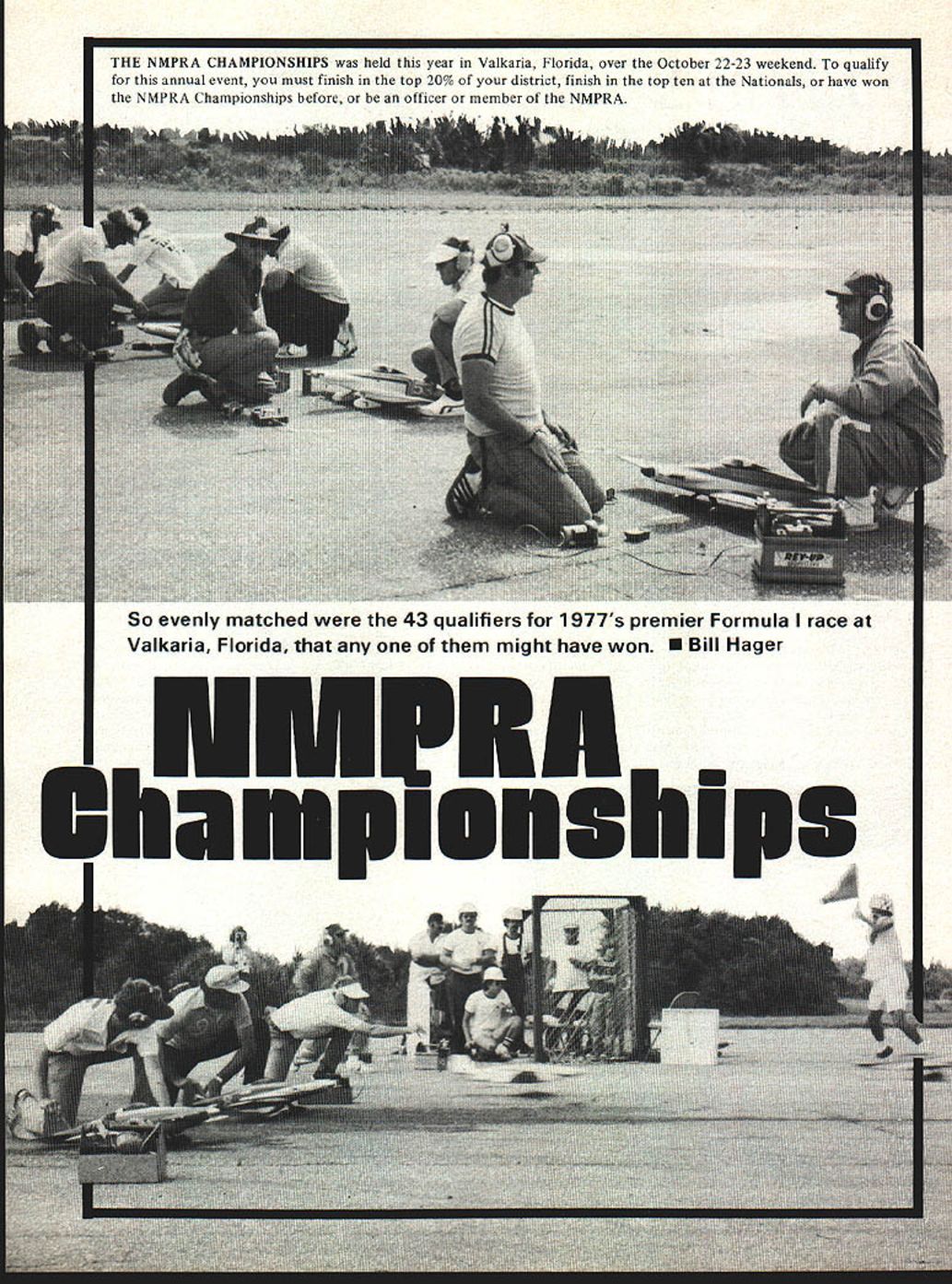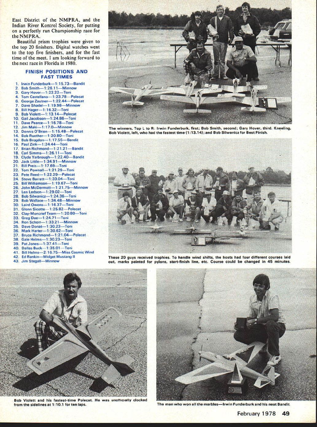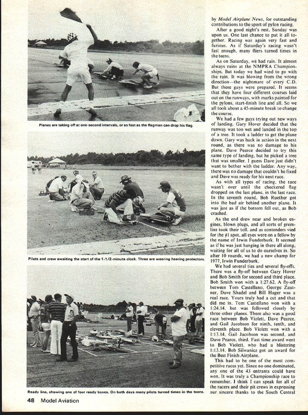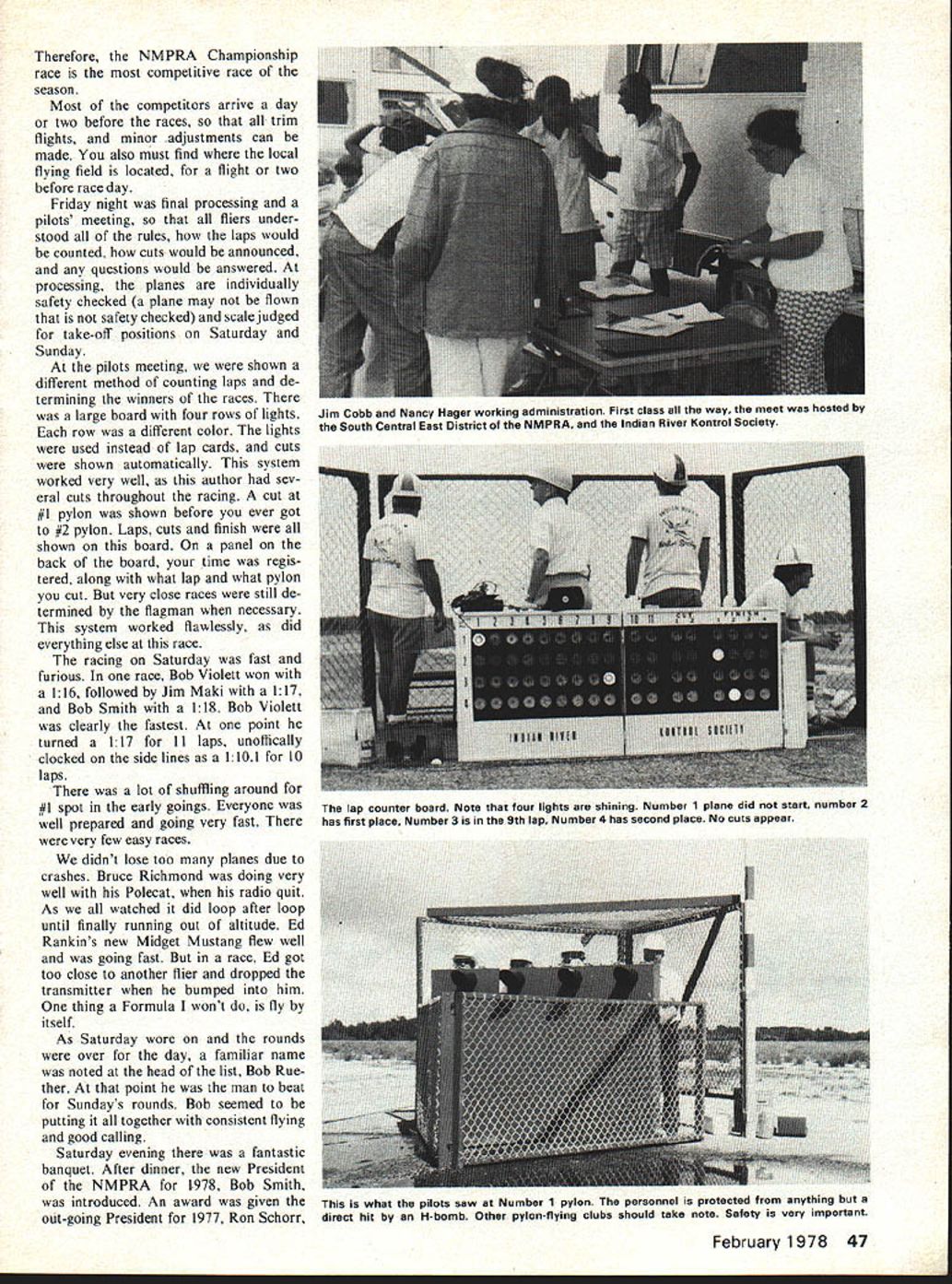 I THE NMPRA CHAMPIONSHIPS held year Valkaria Florida over October 22-23 weekend qualify annual event must finish top 20% district finish top ten Nationals have won NMPRA Championships before officer member NMPRA So evenly matched 43 qualifiers 1977s premier Formula race Valkaria Florida might have won U Bill Hager hip Therefore NMPRA Championship race competitive race season Most competitors arrive day two before races trim flights minor adjustments can made also must find local flying field located flight two before race day Friday night final processing pilots meeting fliers under stood rules laps would counted cuts would announced questions would answered processing planes individually safety checked plane may flown safety checked scale judged take-off positions Saturday Sunday pilots meeting shown different method counting laps de termining winners races large board four rows lights row different color lights used instead lap cards cuts shown automatically system worked very well author sev eral cuts throughout racing cut #1 pylon shown before ever got #2 pylon Laps cuts finish shown board panel back board time regis tered along what lap what pylon cut very close races still de termined flagman necessary system worked flawlessly did everything else race racing Saturday fast furious race Bob Violett won 116 followed Jim Maki 117 Bob Smith 118 Bob Violett clearly fastest point turned 117 II laps unoffically clocked side lines 1101 10 laps lot shuffling around #1 spot early goings Everyone well prepared going very fast very few easy races didnt lose too planes due crashes Bruce Richmond doing very well Polecat radio quit As watched did loop after loop until finally running out altitude Ed Rankins new Midget Mustang flew well going fast race Ed got too close another flier dropped transmitter bumped him thing Formula wont fly itself As Saturday wore rounds over day familiar name noted head list Bob Rue ther point man beat Sundays rounds Bob seemed putting together consistent flying good calling Saturday evening fantastic banquet After dinner new President NMPRA 1978 Bob Smith introduced An award given out-going President 1977 Ron Schorr February 1978 47 Jim Cobb Nancy Hager working administration First class way meet hosted South Central East District NMPRA Indian River Kontrol Society lap counter board Note four lights shining Number 1 plane did start number 2 has first place Number 3 9th lap Number 4 has second place No cuts appear what pilots saw Number 1 pylon personnel protected anything direct hit H-bomb Other pylon-flying clubs should take note Safety very important Model Airplane News outstanding contributions sport pylon racing After good nights rest Sunday upon us last chance put gether Racing again very fast furious As Saturdays racing wasnt fast enough fliers turned times teens As Saturday rain almost always rains NMPRA Champion ships today wind go rain blowing wrong directionthe nightmare CD guys prepared seems have four different courses laid out runways marks painted pylons start-finish line So took about 45-minute break change course few guys trying out new ways landing Gary Hover decided runway too wet landed top tree took ladder get plane down Gary back action next round no damage plane Dave Pearce decided try same type landing picked tree smaller guess Dave just didnt want bother ladder Any way no damage couldnt fixed Dave ready next race As types racing race wasnt over until checkered flag dropped last plane last race seventh round Bob Ruether got bad air behind another plane just bottom fell out Bob crashed As end drew near broken en gines blown plugs sorts grem lins took toll contenders vied #1 spot eyes fellow name Irwin Funderburk seemed just hanging along waiting us ourselves So after 10 rounds new champ 1977 Irwin Funderburk several ties several fly-offs fly-off between Gary Hover Bob Smith second third place Bob Smith won 12762 fly-off between Tom Castellano George Zaut ner Dave Shadel Bill Hager real race Yours truly cut did Tom Castellano won 12414 followed closely three other planes also good race between Bob Violett Dave Pearce Gail Jacobson ninth tenth eleventh place Bob Violett won 11314 Gail Jacobson second Dave Pearce third Fast time award went Bob Violett blistering 11314 Bob Silwanicz got award Best Finish Airplane com petitive races yet Since no dominated 43 entrants could have won truly Championship race remember think can speak racers pit crews expressing sincere thanks South Central 48 Model Aviation Planes taking off onesecond intervals fast flagman can arop nag Pilots crew awaiting start 1-1/2-minuta clock Three wearing hearing protectors Ready line showing four ready boxes both days pilots turned times teens East District NMPRA Indian River Kontrol Society putting perfectly run Championship race NMPRA Beautiful prism trophies given top 20 finishers Digital watches went top five finishers fast time meet am looking forward next race Florida 1980 FINISH POSITIONS AND FAST TIMES 1 Irwin Funderburk1 15 73Bandit 2 Bob Smith126i 1Minnow 3 Gary Hoveri2222Toni 4 Tom Castellano12378Polecat 6 George Zautner 1 2244Polecat 7 Dave Shadel1 1 99BMinnow B Bill Hageri1632Toni 9 Bob Violett 11314Polecat 10 Gail Jacobsoni 2486Toni ii Dave Pearcei 1678Toni 12 Jim Maki1 170Minnow 13 Dennis OBrien11548Polecat 14 Bob Ruether12080Toni 15 Bob Brogdoni1755Bandit 16 Paul Zink1 2444Toni 17 Brian Richmondi2121Bandit 18 Carl Simmsi26i 1Toni 19 Clyde Yarbrough1 2240Bandit 20 Jack Little134 91Minnow 21 Bill Preisi1769-Toni 22 Tom Pownall1 2129Toni 23 Pete Reedi 2229Polecat 24 Steve Barretti3304Toni 25 Bill Williamsoni 1967Toni 26 John McDermotti 21 75Minnow 27 Len Ledson12902Toni 28 Bob Silwanicz12436Toni 29 Bob Wallacei 3448Minnow 30 Laird Owensi1637Toni 31 Glenn Sicotte 12582Polecat 32 Clay-Moncrief Teami 2080Toni 33 Greg Doei247 1Toni 34 Ron Schorr13321Minnow 35 Dave Donat13023Toni 36 Mark Harter13062Toni 37 Bruce Richmond12 104Polecat 38 Gale Helmsi 3023Toni 39 PatJones1374