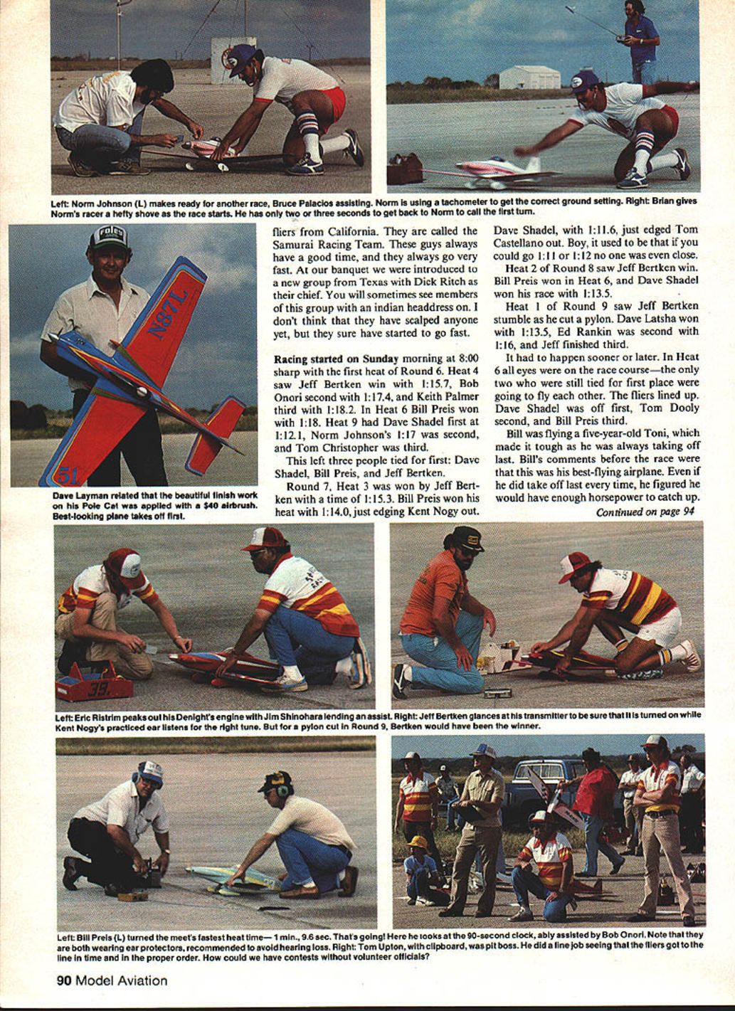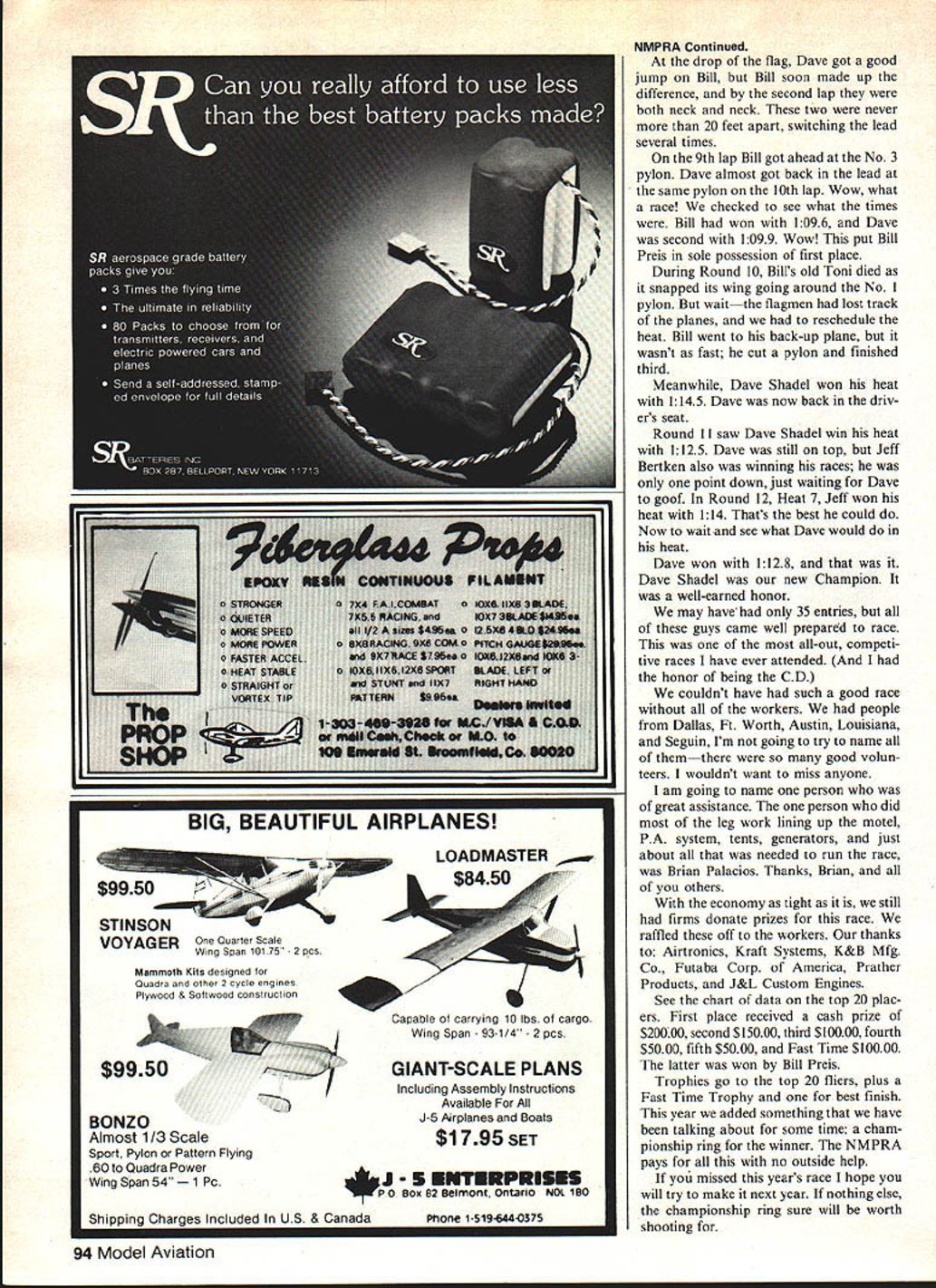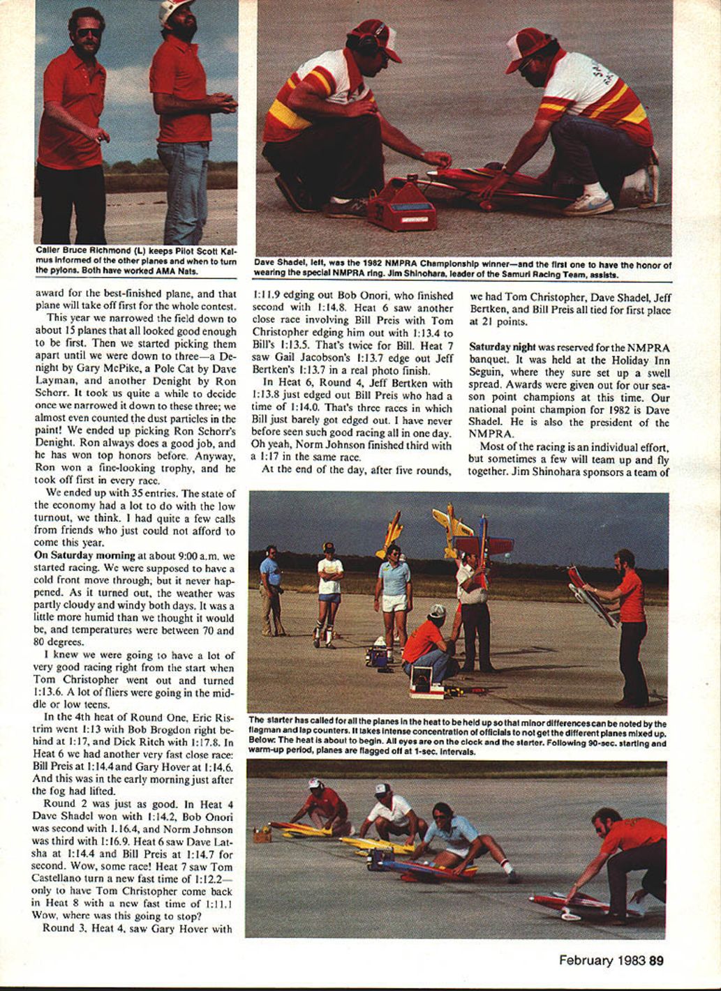 I 4 I' uv Latshas magnificent Pole Cat gets held aloft Gall Jacobson Identification scatter pylon flagmanan important rItual THE NMPRA Championship Race 1982 held October 30 31 Seguin TX managed talk US Air Force letting us use same auxil iary airfield used 1981 Nationals must qualify participate race addition belonging NMPRA must either finish top 20 percent NMPRA district finish top 10 Nationals officer NMPRA past NMPRA champion So top fliers attend race year no exception Friday October 29 field open practice day well used people over country race smart flier will usually come day two ahead time sort out best combination prop engine fuel 600 pm opened registration planes checked safetyservo con nections hinges clevis connections etc give planes pretty thorough examina tion planes also checked con formity specifications size weight rules hardest job pro cessing Formula racers scale appearance judging Most planes looked very well finished takeoff order determined airplane judged best-looking plane taking off first also have special 88 Model Aviation award best-finished plane plane will take off first whole contest year narrowed field down about 15 planes looked good enough first started picking apart until down threea De night Gary McPike Pole Cat Dave Layman another Denight Ron Schorr took us quite decide once narrowed down three almost counted dust particles paint ended up picking Ron Schorrs Denight Ron always does good job has won top honors before Anyway Ron won fine-looking trophy took off first race ended up 35 entries state economy lot low turnout think quite few calls friends just could afford come year Saturday morning about 900 am started racing supposed have cold front move through never hap pened As turned out weather partly cloudy windy both days little humid thought would temperatures between 70 80 degrees knew going have lot very good racing right start Tom Christopher went out turned 1136 lot fliers going mid dle low teens 4th heat Round Eric Ris trim went 113 Bob Brogdon right hind 117 Dick Ritch 1178 Heat 6 another very fast close race Bill Preis 1144 Gary Hover 1146 early morning just after fog lifted Round 2 just good Heat 4 Dave Shadel won 1142 Bob Onori second 1164 Norm Johnson third 1169 Heat 6 saw Dave Lat sha 1144 Bill Preis 1147 second Wow some race Heat 7 saw Tom Castellano turn new fast time 1122 have Tom Christopher come back Heat 8 new fast time 1111 Wow going stop Round 3 Heat 4 saw Gary Hover 1119 edging out Bob Onori finished second 1148 Heat 6 saw another close race involving Bill Preis Tom Christopher edging him out 1134 Bills 1135 Thats twice Bill Heat 7 saw Gail Jacobsons 1137 edge out Jeff Bertkens 1137 real photo finish Heat 6 Round 4 Jeff Bertken 1138 just edged out Bill Preis time 1140 Thats three races Bill just barely got edged out have never before seen such good racing day Oh yeah Norm Johnson finished third 117 same race end day after five rounds Tom Christopher Dave Shadel Jeff Bertken Bill Preis tied first place 21 points Saturday night reserved NMPRA banquet held Holiday Inn Seguin sure set up swell spread Awards given out sea son point champions time national point champion 1982 Dave Shadel also president NMPRA Most racing individual effort sometimes few will team up fly together Jim Shinohara sponsors team February 1983 89 mus Informed other planes ns Both have worked AMA Nats amplonshlp winnerand first have honor wearing inc specisi NMPHA nng Jim Shinohara leader Samuri Racing Team asaists ne siarier nas c r planes heat held up tnai minor aiyyerences canoe noted flagman lap counters takes Intense concentration officials get different planes mixed up Below heat about begin eyes clock starter Following 90-sec starting warm-up period planes flagged off sf1-sac intervals fliers California called Samurai Racing Team guys always have good time always go very fast banquet introduced new group Texas Dick Ritch chief will sometimes see members group indian headdress dont think have scalped anyone yet sure have started go fast Racing started Sunday morning 800 sharp first heat Round 6 Heat 4 saw Jeff Bertken win 1157 Bob Onori second 1174 Keith Palmer third 1182 Heat 6 Bill Preis won 118 Heat 9 Dave Shadel first 1121 Norm Johnsons 117 second Tom Christopher third left three people tied first Davc Shadel Bill Preus Jeff Bertken Round 7 Heat 3 won Jeff Bertken time 1153 Bill Preis won heat 1140 just edging Kent Nonv out Dave Shadel 1116 just edged Tom Castellano out Boy used could go 111 112 no close Heat 2 Round 8 saw Jeff Bertken win Bill Preis won Heat 6 Dave Shadel won race 1135 Heat Round 9 saw Jeff Bertken stumble cut pylon Dave Latsha won 1135 Ed Rankin second 116 Jeff finished third happen sooner later Heat 6 eyes race coursethe two still tied first place going fly other fliers lined up Dave Shadel off first Tom Dooly second Bill Preis third Bill flying five-year-old Toni made tough always taking off last Bills comments before race best-flying airplane did take off last time figured would have enough horsepower catch up Continued page 94 90 Model Aviation Left Norm Johnson CL makes ready tor another race Bruce Palaclos assisting Norm using tachometer get correct ground setting Right Brtan givea Norms racer hefty shove race starts has two three seconds get back Norm call first turn Dave Layman retated beautiful finish work hIs Pole Cat appiled $40 airbrush Best-looidna aisne takes off first Left tflm peaKs OL nignus engine wun 1mm onmnunma anu.v a.. t Jeff Bertken glances transmitter sure tumeO wnlle Kent Nnnv practiced ear listens riGht tune pylon cut Round ld have winner turnea meets masnest neat time mm ts goingt looks 90-second clock ably assistea b Bob UnOfl note tnat tney both wearing ear protectors recommended avoid hearing toss Right Tom Upton clipboard pit boss did fine job seeing fliers got line time proper order could have contests volunteer officials $9950-~ STINSON VOYAGEROne Quarter Scale Wing Span 10175 -2 pcs Mammoth Kits de