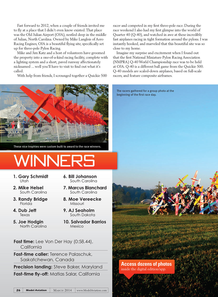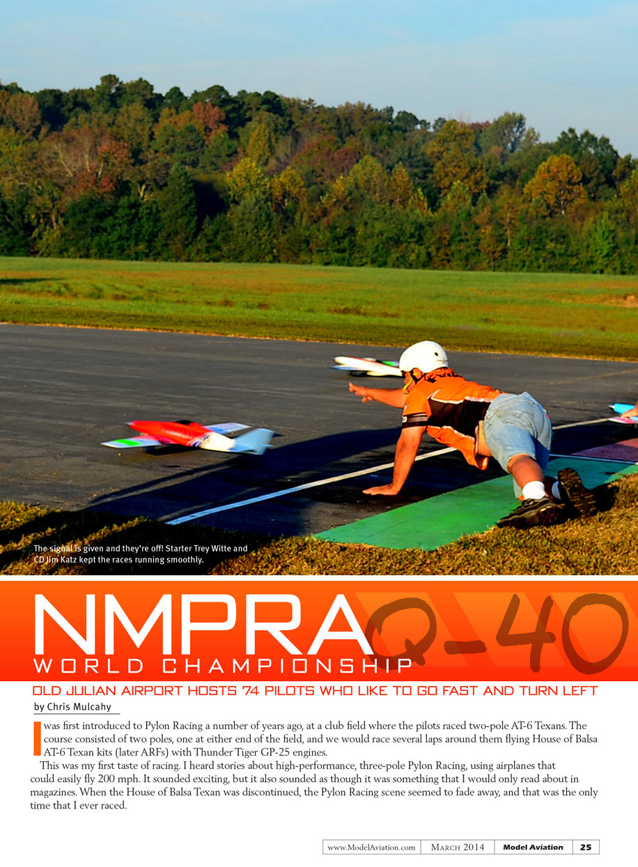 Imagine my surprise and excitement when I found out that the first National Miniature Pylon Racing Association (NMPRA) Q-40 World Championship race was to be held at OJA. Q-40 is a different ball game from the Quickie 500. Q-40 models are scaled-down airplanes, based on full-scale racers, and feature composite airframes.
