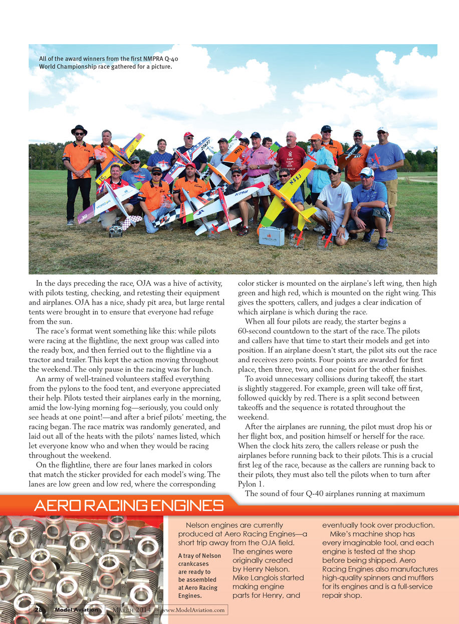 Nelson engines are currently produced at Aero Racing Engines, only a short trip away from the OJA field. The engine was originally created by Henry Nelson. Mike Langlois started making engine parts for Henry, and eventually took over production.