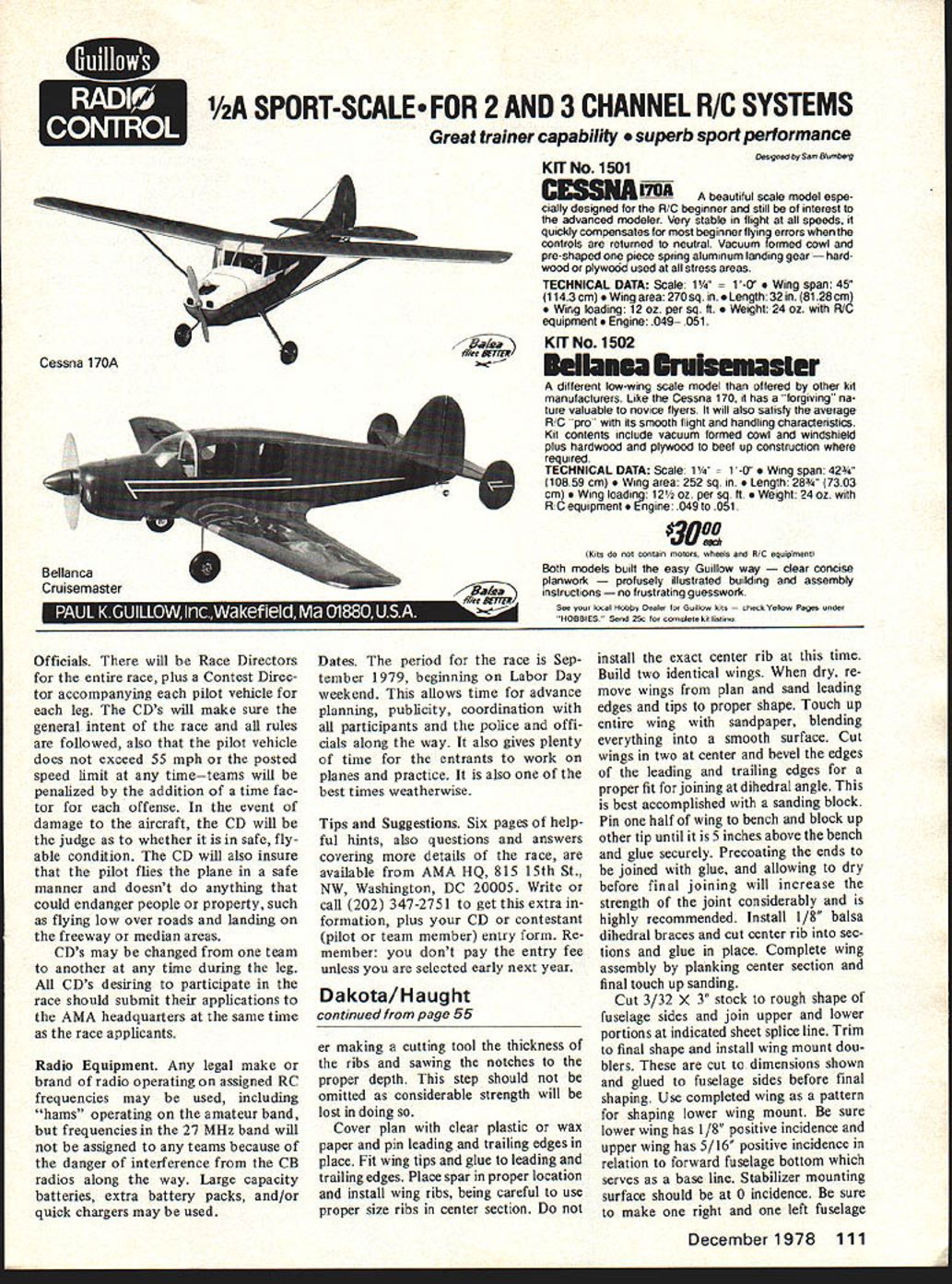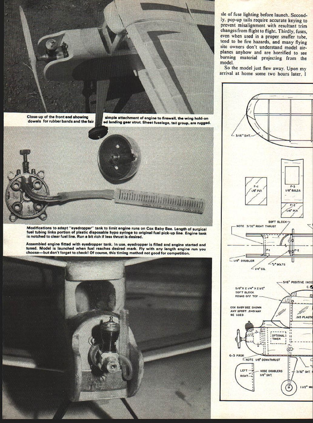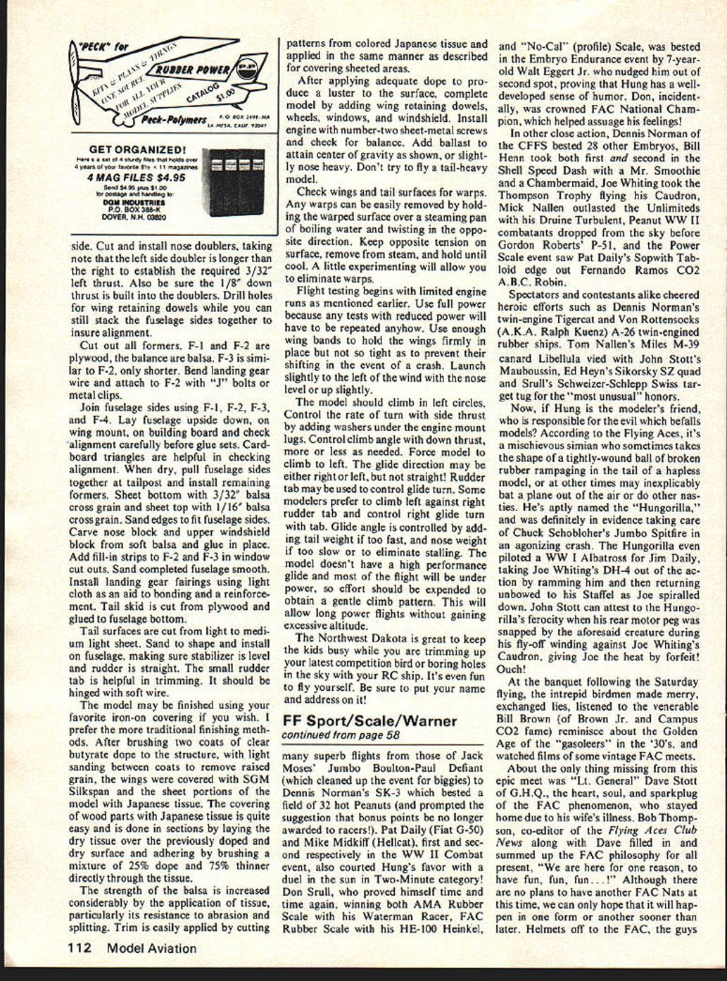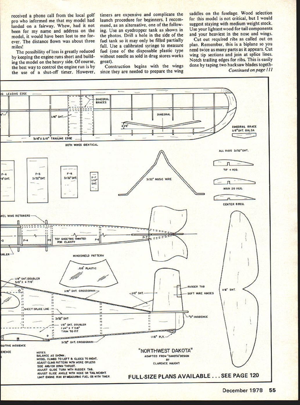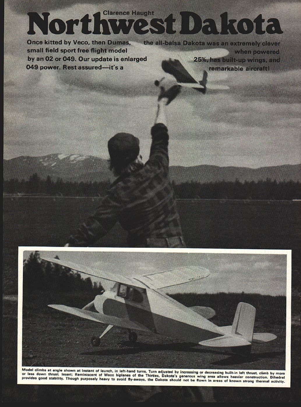 Model climus angie snown Instant launch left-hand turns Turn adjusted mursasing aecreasing built-in left thrust climb less down thrust Insert Reminiscent Waco biplanes Thirties Dakotas generous wing area allows heavier construction Dihedral provides good stability Though purposely heavy avoid fly-aways Dakota should flown areas known strong thermal activity EVEN IF youve modeling short time probably have soft spot m heart special model models may have first fiftieth model some models just turn out special Maybe way flew perhaps classical appearance Whatever case may lingers mind such model Dakota cabin biplane reminiscent old Waco cabins Dakota designed Infant engines emerged post World War II years Construction balsa exception few plywood parts making rugged durable model Designed sport flying little 24-inch span model would put very ac ceptable flights relatively low powered engines day recently acquired kit old de sign went together couple evenings have some changes powerplant design once ade quate 049 has now become far too much power Dakota kit model fitted Cox Pee Wee 020 proved ample power view abundance Cox Baby Bee 049 McCoy 049 engines now retired brief careers plastic readyto-fly control-line models seemed modernized version Dakota would fill need sport free flight model young old alike Scaling up design 25% would result 30-inch wing span Built-up wings attached rubber bands would provide better glide less chance damage rigidly attached sheet wings original Such model should about right power output Baby Bee few evenings later new version ready testing Hand gliding model type reveals little other pro nounced stalling diving tendencies After couple tosses satisfy curios ity engine started tuned allowed run out fuel small amount fuel measured syringe placed tank engine restarted safest power pattern model type left model launched just left wind wanted go right climb too steep Corrections applied next short hop looked great Since field large wind minimal next fuel allowance rather generous ship climbed up quite high until engine quit began gentle spiral down Suddenly wings began rock nose perked up model began ascend strong lift Five minutes later edge field model now just speck sky disappeared view No dethermalizer incorporated design three reasons First wanted simplicity operation design would appeal young inex perienced fliers just getting free flight novice doesnt need hasDecember 1978 53 Comparison original all-wood Dakota updated Northwest Dakota New ship built-up wings efficient glide 25% larger utilize power modern 049s Wings rubber-banded shift damage event hard landings striking obstructions Name address wing may neip muosi iind its way home after fly-awaybut care control ling engine run should avoid difficulty glide angle can adjusted nose tail weight required though suggested favor bit fast glide sle fuse lighting before launch Second ly pop-up tails require accurate keying prevent misalignment resultant trim changes flight flight Thirdly fuses used proper snuffer tube tend fire hazards flying site owners dont understand model air planes anyhow horrified see burning material projecting model So model just flew away Upon arrival home some two hours later i//f F-S /5 BALSA F-S /8 PLY SOFT BLOCK NOTE 3/32 RSHT THRUST I--I P1P2 Modifications adapt eyedropper ian 10 iimit engine runs uox Baby Hee Length surgical fuel tubing links portion plastic disposable hypo syringe original fuel pick-up line Engine tank notched clear fuel line Run bit rich less thrust desired Assembled engine fitted eyedropper tank use eyedropper filled engine started tuned Model launched fuel reaches desired mark Fly length engine run choosebut dont forget check course timina method aood comnetition received phone call local golf pro informed model landed fairway Whew name address model would have lost ever distance flown about three miles possibility loss greatly reduced keeping engine runs short build ing model heavy side course best way control engine run use shut-off timer However timers expensive complicate launch procedure beginners recom mend alternative follow ing Use eyedropper tank shown photos Drill hole side fuel tank may filled partially full Use calibrated syringe measure fuel disposable plastic type needle sold drug stores works great Construction begins wings since needed prepare wing saddles fuselage Wood selection model critical would suggest staying medium weight stock Use lightest wood tail components heaviest nose wings Cut out required ribs called out plan Remember biplane need twice parts appears Cut wing tip sections join splice lines Notch trailing edges ribs easily done taping two hacksaw blades togeth Con tinued page 111 0 LEADING EDGE 1/16 SHT 31BXS/8 TRAIUNG EDGE DIHEDRAL BRACES BB DIHEDRAL IIKI N DIHEDRAL BRACE I/BSHT BALSA BOTH WINGS IDENTICAL PS 3/32 SHT 35 SIft IEL WING RETAINERSI n fl [v32][b-1-10-1-10]]1S IIIISI IIIII--- 3F-4p TOP SHEETING OMIATEDF-6 FOR CLARITY JBLERWINDSHIELD PATTERN 015 ASTIC 1/8 SHT DOUBLER7 5/BX 47/B 0 [ RUDDER TAB II 111/16 SHT CROSSGRAIN HI/B SHT II- -SOFT WIRE HINGES AII II II ___1SHEET SPLICE LINE IIflIIII"0 INCIDENCE II3/3ZSHT IIIII Ii1/8 SHT DOUBLERII II/4X77/B IITRIM TO FlT 0r I1/16 PLY" 3/32 SNT CROSSGRAIN NOTES BALANCE AS SHOWN MODEL CLIMBS TO LEFT B GLIDES TO RIGHT ADJUST OJMB PATTERN WITh MORE ORLESS SIDE ANI/OR DOWN THRUST ADJUST GLIDE TURN WITH RUDDER TAB ADJUST GLIDE ANGLE WITH NOSE OR TAL WEIGHT UNIT ENGINE RUN BYISEASURBIG FUEL 08 WITH TIMER ALL RIBS 3/3SHT LZIZi~ TIP 4 RED LZIHiZiL MAIN 20 REQ CENTER B REQ I/B SHT December1978 55 F-4 B SHT SITIvE INCIDENCE RENCE NORTHWEST DAKOTA ADAPTED FROM DAKOTADESIGN BY CLARENCE NAUGHT FULL-SIZE PLANS AVAILABLE . SEE PAGE 120 SPORT-SCALE FOR 2 AND 3 CHANNEL RIC SYSTEMS Great trainer capability rb sport performance Oeoigred Satn Btuetbetg KIT No1501 CESS3LA 170A beautiful scale model espe cially designed RIG beginner still interest advanced modeler Very stable flight speeds quickly compensate