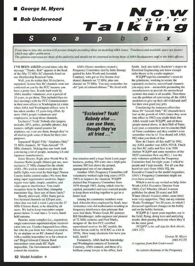 George M Myers Bob Underwood M w Fe time time section will present thought-provoking ideas modeling/AMA issues Timeliness available space factors may affect publication opinions expressed authors should construed being AMA Headquarters staff AMA officers IVE BEEN ASKED several times message Thanks Bob appears head fifty 72 MHz RC channels listed Membership Renewal Form Well realize 50 exclusive separated license-free RC channels conferred FCC because have pretty face took hard work AMA member volunteers over period 10 years get included face-toface meetings FCC Commissioners own offices Washington time AMA Washington offices too has taken another 15 years-long effort AMA people volunteers employees keep channels Exclusive Yeah Nobody else pagers taxicabs EPA police portable phones dog trainers inflight sound systems airplanes etc can use though theyve tried grab some own purposes Separated Right Fifty Airplanes Only 72 MHz channels 30 Non-Aircraft 75 MHz channels Making work took convincing lot people including US Japanese manufacturers Some History Right after World War II Amateur Radio people Hams got nonexclusive 27 MHz channel whole AMA used crash time traffic lights reset then-legal Nassau County traffic control radio using super-regenerative receivers Super regens light simple sensitive wide-open interference could recognize blue triangular transmitter flag Seen lately Shortly afterward AMA Hams got us five licensed channels $20 per year half weeks pay 27 MHz Citizens Band shared users keep transmitter output power below 3/4 watt 1/4 wave handheld antenna Heavier complex ie expensive single-conversion superheterodyne receivers came use Crashes happened less often think lost tried fly airplane RC channel shared mobile transmitter boat car Illegal kilowatt Citizens Band transmitters soon made RC flight impossible Government couldnt control situation AMA Hams members created Frequency Committee led John Strong guided John Worth Jeremiah Courtney got us five license-free shared channels 72 MHz plus channel 75 MHz may remember old pair colored ribbons lived situation until large Saint Louis pager business, putting 300 watts high-gain antenna 300 feet above ground appropriated channels Another AMA Frequency Committee volunteers worked eight long years 19751983 improve situation W2QPP chaired Frequency Committee 1979 through 1983 during time cajoled persuaded yes coerced people keep working together get us better deal Among committee members Jack Albrecht employed Kraft later Airtronics did mathematics resulting frequency interference data printouts feet thick Walter Good RC pioneer Bill Hershberger radio engineer pioneer 72 MHz systems Fred Marks designer first FCC-certified narrowband receiver RC models Silver Seven sold ACE R/C kit 1979 electronic kits have built lately Fortunately AMA knowledge Washington contacts Jeremiah Courtney AMA counsel brilliant young lawyer office Jack Smith Jack also held Bachelors degree Electrical Engineering knew enough radio theory radio engineer W2QPP kept committees noses grindstone working secure separated exclusive narrowband channels enjoy nowmeanwhile persuading manufacturers provide narrowband systems make useable problem convincing AMA modelers give up old wideband stuff own good job Considering immense effect 50 Aircraft Only RC channels have growth AMA since went effect 1982 might think AMA would want W2QPP people named above Hall Fame Last year committee met consider Hall Fame candidates couldnt remember should tell AMA HQ what think know stuff 1941 AMA number AMA 193 IR built first RC radio flew 1950 before W2QPP some members HOT committee flew RC volunteer publicist Frequency Committee eight years talked people kept records heard saw AMA HQ Executive Council model magazines AMAs Frequency Committee might have existed Which say no help John Worth AMA Executive Director 1965 Carl Wheeley Model Aviation publisher about 20 years Bill Winter Model Aviation editor same time very supportive ran column Radio Technique 20 years discussed significant changes hobby hobby horizon W2QPP & spent years together out field flying doing tests analyzing results passing out theyd good W2QPP call sign Bob Aberle AMA 215 George M Myers AMA #1370 response Bob Underwood As current chairman Frequency 52 Model Aviation