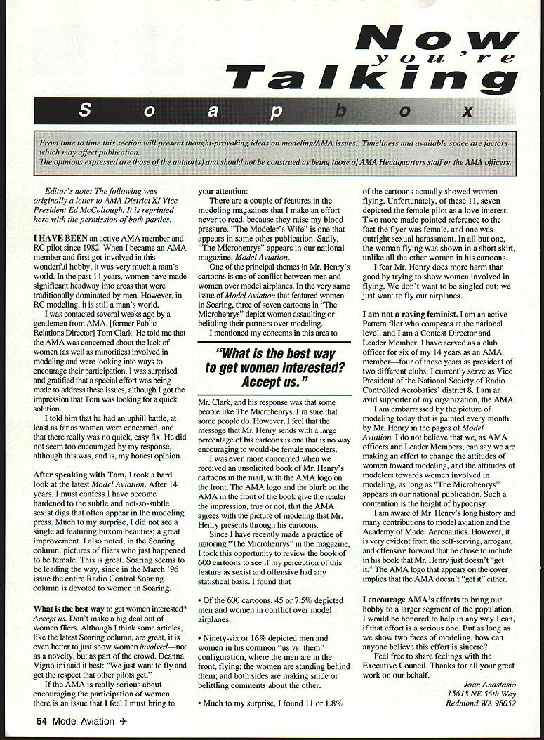N J C Ta Ikiri g construe Editors note following originally letter AMA District XI Vice President Ed McCollough reprinted permission both parties HAVE BEEN active AMA member RC pilot since 1982 became AMA member first got involved wonderful hobby very much mans world past 14 years women have made significant headway areas traditionally dominated men However RC modeling still mans world contacted several weeks ago gentlemen AMA [former Public Relations Director] Tom Clark told AMA concemed about lack women well minorities involved modeling looking ways encourage participation surprised gratified special effort being made address issues although got impression Tom looking quick solution told him uphill battle least far women concerned really no quick easy fix did seem too encouraged response although honest opinion After speaking Tom took ahard look latest Model Aviation After 14 years must confess have become hardened subtle not-so-subtle sexist digs often appear modeling press Much surprise did see single ad featuring buxom beauties great improvement also noted Soaring column pictures fliers just happened female great Soaring seems leading way since March 96 issue entire Radio Control Soaring column devoted women Soaring What best way get women interested Accept us Dont make big deal out women fliers Although think some articles like latest Soaring column great better just show women involvednot novelty part crowd Deanna Vignolini said best just want fly get respect other pilots get AMA really serious about encouraging participation women issue feel must bring attention couple features modeling magazines make effort never read because raise blood pressure Modelers Wife appears some other publication Sadly Microhenrys appears national magazine Model Aviation principal themes Mr Henrys cartoons conflict between men women over model airplanes very same issue Model Aviation featured women Soaring three seven cartoons Microhenrys depict women assaulting belittling partners over modeling mentioned concerns area What best way get women interested Accept us Mr Clark response some people like Microhenrys Im sure some people However feel message Mr Henry sends large percentage cartoons no way encouraging would-be female modelers concerned received unsolicited book Mr Henrys cartoons mail AMA logo front AMA logo blurb AMA front book give reader impression true AIVIA agrees picture modeling Mr Henry presents through cartoons Since have recently made practice ignoring Microhenrys magazine took opportunity review book 600 cartoons see perception feature sexist offensive statistical basis found 600 cartoons 45 75% depicted men women conflict over model airplanes Ninety-six 16% depicted men women common us vs configuration men front flying women standing behind both sides making snide belittling comments about other Much surprise found 11 18% cartoons actually showed women flying Unfortunately 11 seven depicted female pilot love interest Two made pointed reference fact flyer female outright sexual harassment woman flying shown short skirt unlike other women cartoons fear Mr Henry does harm good trying show women involved flying dont want singled out just want fly airplanes am raving feminist am active Pattern flier competes national level am Contest Director Leader Member have served club officer six 14 years AMA memberfour years president two different clubs currently serve Vice President National Society Radio Controlled Aerobatics district 8 am avid supporter organization AMA am embarrassed picture modeling today painted month Mr Henry pages Model Aviation believe AMA officers Leader Members can say making effort change attitudes women toward modeling attitudes modelers towards women involved modeling long Microhenrys appears national publication Such contention height hypocrisy Jam aware Mr Henrys long history contributions model aviation Academy Model Aeronautics However very evident self-serving arrogant offensive forward chose include book Mr Henry just doesnt get AMA logo appears cover implies AIvIA doesnt get either encourage AMAs efforts bring hobby larger segment population would honored help way can effort serious long show two faces modeling can anyone believe effort sincere Feel free share feelings Executive Council Thanks great work behalf Joan Anastasio 15618NE56th Way Redmond WA 98052 54 Model Aviation io rtpublicat expresset mode vailable aff the