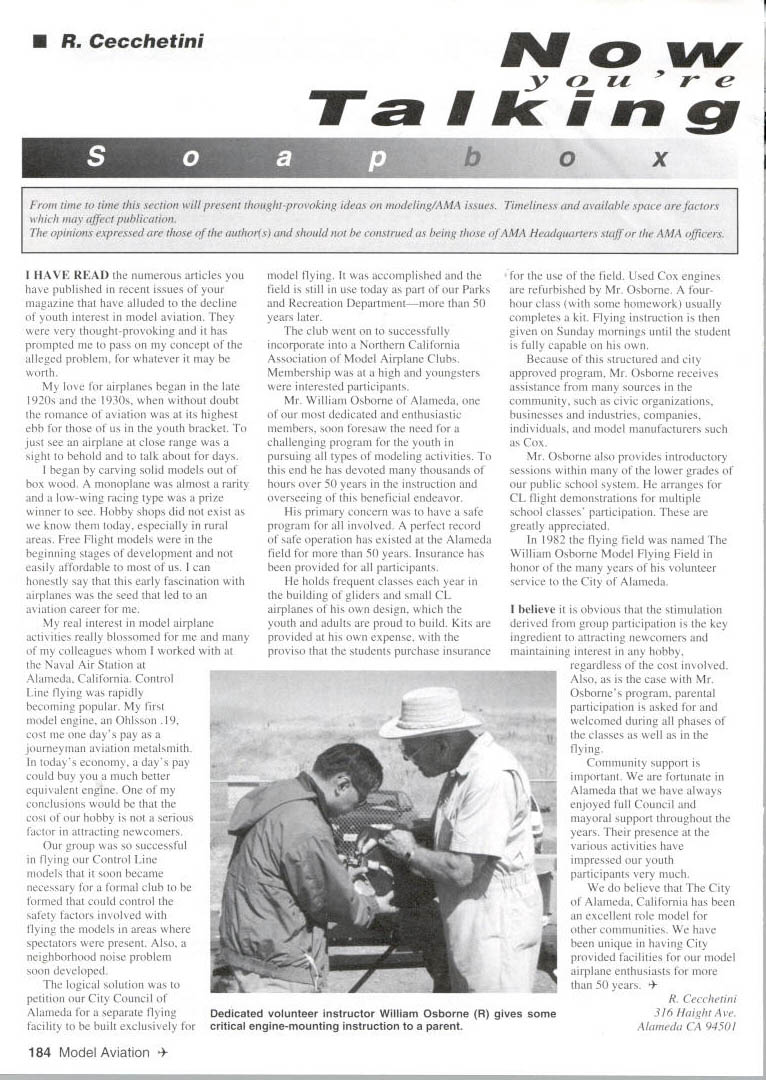 U R Cecchetini M w Ti II g HAVE READ numerous articles have published recent issues magazine have alluded decline youth interest model aviation very thought-provoking has prompted pass concept alleged problem whatever may worth love airplanes began late 1920s 1930s doubt romance aviation its highest ebb us youth bracket just see airplane close range sight behold talk about days began carving solid models out box wood monoplane almost rarity low-wing racing type prize winner see Hobby shops did exist know today especially rural areas Free Flight models beginning stages development easily affordable us can honestly say early fascination airplanes seed led aviation career real interest model airplane activities really blossomed colleagues worked Naval Air Station Alameda California Control Line flying rapidly becoming popular first model engine Ohlsson 19 cost days pay journeyman aviation metalsmith todays economy days pay could buy much better equivalent engine conclusions would cost hobby serious factor attracting newcomers group successful flying Control Line models soon became necessary formal club formed could control safety factors involved flying models areas spectators present Also neighborhood noise problem soon developed logical solution petition City Council Alameda separate flying facility built exclusively model flying accomplished field still use today part Parks Recreation Departmentmore 50 years later club went successfully incorporate Northern California Association Model Airplane Clubs Membership high youngsters interested participants Mr William Osborne Alameda dedicated enthusiastic members soon foresaw need challenging program youth pursuing types modeling activities end has devoted thousands hours over 50 years instruction overseeing beneficial endeavor primary concern have safe program involved perfect record safe operation has existed Alameda field 50 years Insurance has provided participants holds frequent classes year building gliders small CL airplanes own design youth adults proud build Kits provided own expense proviso students purchase insurance use field Used Cox engines refurbished Mr Osborne fourhour class some homework usually completes kit Flying instruction given Sunday mornings until student fully capable own Because structured city approved program Mr Osborne receives assistance sources community such civic organizations businesses industries companies individuals model manufacturers such Cox Mr Osborne also provides introductory sessions within lower grades public school system arranges CL flight demonstrations multiple school classes participation greatly appreciated 1982 flying field named William Osborne Model Flying Field honor years volunteer service City Alameda believe obvious stimulation derived group participation key ingredient attracting newcomers maintaining interest hobby regardless cost involved Also case Mr Osbornes program parental participation asked welcomed during phases classes well flying Community support important fortunate Alameda have always enjoyed full Council mayoral support throughout years presence various activities have impressed youth participants very much believe City Alameda California has excellent role model other communities have unique having City provided facilities model airplane enthusiasts 50 years cchetini 316 Haight Ave Alameda CA 94501 184 Model Aviation time section will present thought-provoking ideas modeling/AMA issues Timeliness available space factors may affect publication opinions expressed authors should construed being AMA Headquarters staff AMA officers Dedicated volunteer instructor William Osborne R gives some critical engine-mounting instruction parent