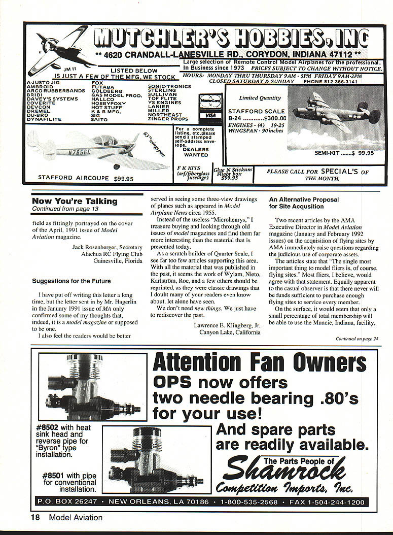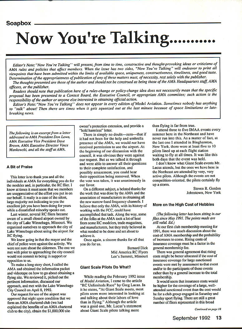 Soapbox Now Youre Talking..... Bit Praise letter thank individuals AMA everything modeler particular RC flier know times must seem members unappreciative effort put behalf really case silent large majority indicating excellent job have doing years dissatisfied minority speaks Out Last winter several RC fliers became aware small closed airport owned city Lake Winnebago Missouri organized ourselves approach city Lake Winnebago about using airport RC flying knew going mayor chief police against activity sure about aldermen met prior approaching city council would commit being support opposition us make long story short called AMA obtained information packet videotape go about obtaining flying site reviewed picked out pertinent information discussed approach met Lake Winnebago City Council April 8 1992 request use airport approved night upon condition form AMA chartered club explained benefits AMA chartered club city obtain $1000000 site owners protection extension provide hold harmless letter simply no doubtzerothat help umbrella presence AMA would have received permission use airport beginning discussion council obvious against request talked through able answer questions complete satisfaction possibly amazement could hear opposition being removed vote taken unanimously favor different subject belated thanks work done AMA association manufacturers obtaining new narrow-band frequency channels believe AMA its history working FCC could have accomplished task Along way some folks AMA took lot heat some RC modelers trade magazines manufacturers truly believed what needed done set about achieve Once again sincere thanks us Bernard Dick Mid America RC Flyers Lees Summit Missouri Giant Scale Pilots What reading February 1992 issue Model Aviation came article RC Unlimiteds Race Greg Lucas states Giant Scale meets pilots seem interested looking talking about labors love flying Although article good Mr Lucass statement about Giant Scale pilots talking flying far true attend three five IMAA events summer Northeast have never run As matter fact last attended Binghamton New York least five 10 pilots lined up flight station waiting fly times like both days event held dont know what Giant Scale events Mr Lucas attends ones have Northeast attended very very active pilots Although events competition-oriented pilots certainly fly up storm Steven R Gordon Johnstown New York High Cost Hobbies following letter has sitting files since May 1991 points made still valid Ed first club membership meeting 1991 much discussion about cost AMA membership probability increases come Rising costs insurance coverage must factor general membership fee general agreement rising costs might better allocated cost insurance coverage large sanctioned events met assessment event and/or participants events rather general increase total membership would seem insurance costs would higher coverage large wellattended sanctioned event cost would club group engaged Saturday Sunday sport flying still great number fliers represented broad Continued page 18 September 1992 13 Editors Note Now Youre Talking will present time time constructive thought-provoking ideas criticisms AMA rules policies affect members issue has two sides Now Youre Talking will endeavor print viewpoints have submitted within limits available space uniqueness constructiveness timeliness good taste Determination appropriateness publication of matters must necessity rest solely publisher thoughts presented author should construed being AMA Headquarters staff AMA officers publisher Readers should note publication rules-change policy-change idea does necessarily mean spec4fic proposal has presented Contest Board Executive Council appropriate AMA committee such action responsibility author anyone else interested obtaining official action Editors Note Now Youre Talking does appear edition Model Aviation Sometimes nobody has anything talk about times gets squeezed out last minute because space limitations latebreaking news following excerpt letter addressed AMA President Don Lowe AMA Executive Vice President Dave Brown AMA Executive Director Vince Mankowski staff AMA ILIjF \,k1 U ** 4620 CR ~7jMILISTED BELOW IS JUST FEW OF THE MFG WE STOCK A-JUSTO 110 AMS RaID ARCO RUBBERBANDS BRIDI DAVEYS SYSTEMS COVE RITE DEVCON DR EM EL DU-BRO DYNAFILITE FOX FUTABA GOLDBERG GAS MODEL PROD HALLCO HOBBYPOXY HOT STUFF K & B MPG SIG SA ITO Now Youre Talking Continued page 13 field fittingly portrayed cover April 1991 issue Model Aviation magazine Jack Rosenberger Secretary Alachua RC Flying Club Gainesville Florida Suggestions Future have put off writing letter long time letter sent Mr Hagerlin January 1991 issue MA confirmed some thoughts indeed model magazine supposed also feel readers would better served seeing some three-view drawings planes such appeared Model Airplane News circa 1955 Instead useless Microhenrys treasure buying looking through old issues model magazines find far interesting material presented today As scratch builder Quarter Scale see far too few articles supporting area material published past seems work Wylam Nieto Karlstriim Roe few others should reprinted classic drawings doubt readers know about let alone have seen dont need new things just have rediscover past Lawrence E Klingberg Jr Canyon Lake California An Alternative Proposal Site Acqusition Two recent articles AMA Executive Director Model Aviation magazine January February 1992 issues acquisition flying sites AMA immediately raise questions regarding judicious use corporate assets articles state single important thing model fliers course flying sites Most fliers believe would agree statement Equally apparent casual observer never will funds sufficient purchase enough flying sites service member surface would seem small percentage total membership will able use Muncie Indiana facility Continued page 24 #8502 heat sink head reverse pe installation #8501 pipe conventional installation Attention Fan Owners OPS now of