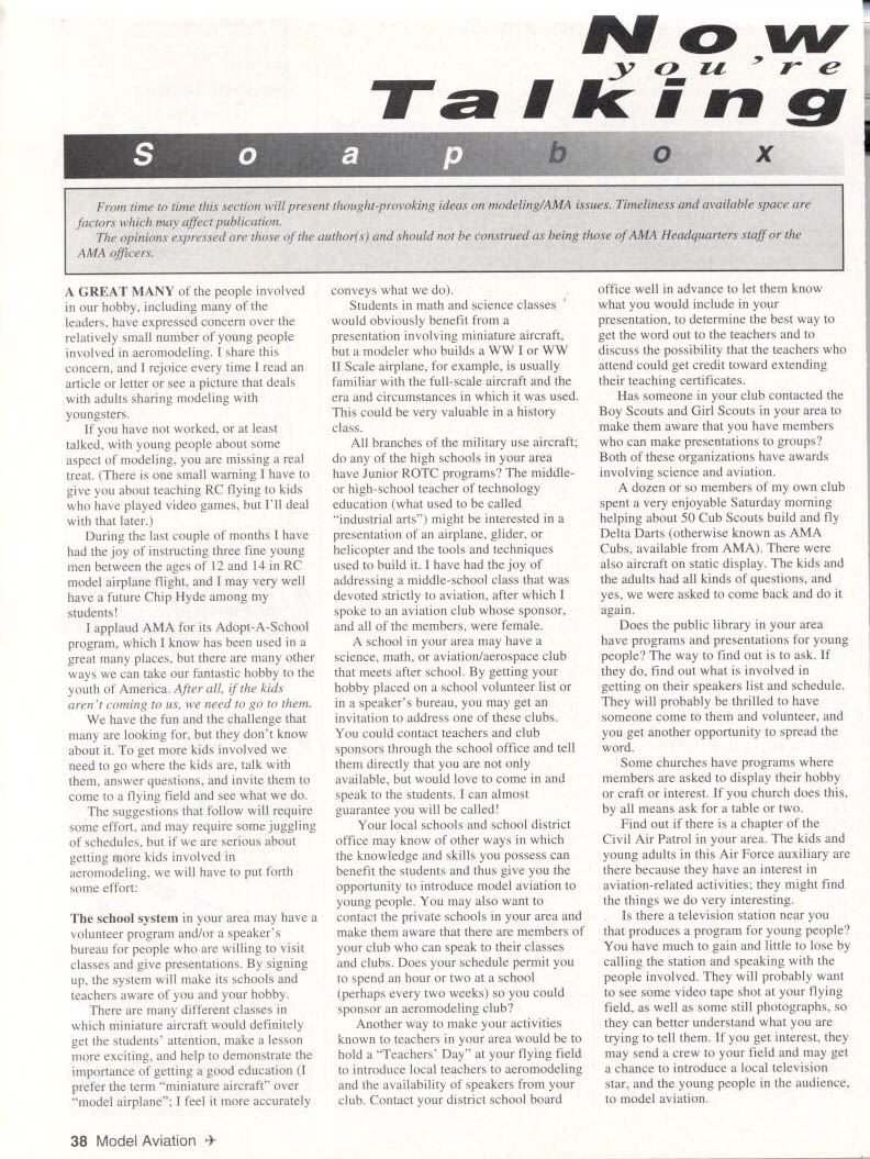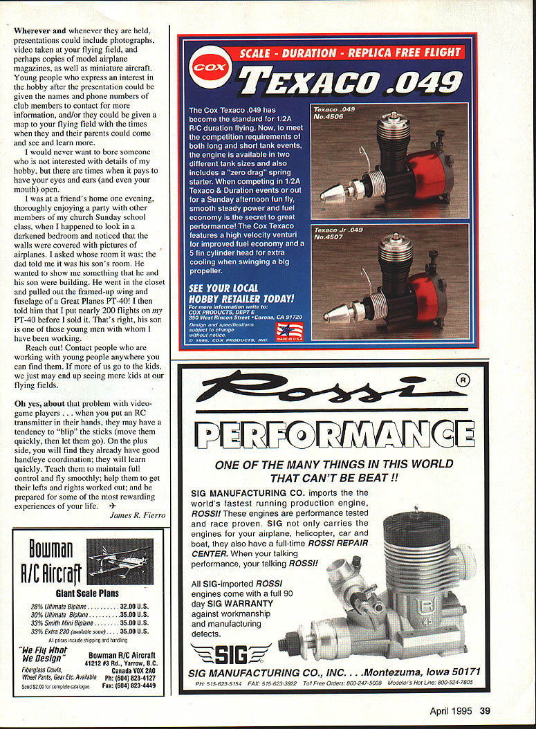 A GREAT MANY people involved hobby including leaders have expressed concern over relatively small number young people involved aeromodeling share concern rejoice time read article letter see picture deals adults sharing modeling youngsters have worked least talked young people about some aspect modeling missing real treat small warning have give about teaching RC flying kids have played video games Ill deal later During last couple months have joy instructing three fine young men between ages 12 14 RC model airplane flight may very well have future Chip Hyde among students applaud AMA its Adopt-A-School program know has used great places other ways can take fantastic hobby youth America After kids arent coming us need go have fun challenge looking dont know about get kids involved need go kids talk answer questions invite come flying field see what suggestions follow will require some effort may require some juggling schedules serious about getting kids involved aeromodeling will have put forth some effort school system area may have volunteer program and/or speakers bureau people willing visit classes give presentations signing up system will make its schools teachers aware hobby different classes miniature aircraft would definitely get students attention make lesson exciting help demonstrate importance getting good education prefer term miniature aircraft over model airplane feel accurately w 7EW Iliri conveys what Students math science classes would obviously benefit presentation involving miniature aircraft modeler builds WW WW II Scale airplane example usually familiar full-scale aircraft era circumstances used could very valuable history class branches military use aircraft high schools area have Junior ROTC programs middleor high-school teacher technology education what used called industrial arts might interested presentation airplane glider helicopter tools techniques used build have joy addressing middle-school class devoted strictly aviation after spoke aviation club sponsor members female school area may have science math aviation/aerospace club meets after school getting hobby placed school volunteer list speakers bureau may get invitation address clubs could contact teachers club sponsors through school office tell directly available would love come speak students can almost guarantee will called local schools school district office may know other ways knowledge skills possess can benefit students thus give opportunity introduce model aviation young people may also want contact private schools area make aware members club can speak classes clubs Does schedule permit spend hour two school perhaps two weeks could sponsor aeromodeling club Another way make activities known teachers area would hold Teachers Day flying field introduce local teachers aeromodeling availability speakers club Contact district school board office well advance let know what would include presentation determine best way get word out teachers discuss possibility teachers attend could get credit toward extending teaching certificates Has someone club contacted Boy Scouts Girl Scouts area make aware have members can make presentations groups Both organizations have awards involving science aviation dozen members own club spent very enjoyable Saturday morning helping about 50 Cub Scouts build fly Delta Darts otherwise known AMA Cubs available AMA also aircraft static display kids adults kinds questions yes asked come back again Does public library area have programs presentations young people way find out ask find out what involved getting speakers list schedule will probably thrilled have someone come volunteer get another opportunity spread word Some churches have programs members asked display hobby craft interest church does means ask table two Find out chapter Civil Air Patrol area kids young adults Air Force auxiliary because have interest aviation-related activities might find things very interesting television station near produces program young people have much gain little lose calling station speaking people involved will probably want see some video tape shot flying field well some still photographs can better understand what trying tell get interest may send crew field may get chance introduce local television star young people audience model aviation 38 Model Aviation tim factors mayc opinions e AMA officers ovoking idea rhoidd Wherever whenever held presentations could include photographs video taken flying field perhaps copies model airplane magazines well miniature aircraft Young people express interest hobby after presentation could given names phone numbers club members contact information and/or could given map flying field times parents could come see learn would never want bore someone interested details hobby times pays have eyes ears mouth open friends home evening thoroughly enjoying party other members church Sunday school class happened look darkened bedroom noticed walls covered pictures airplanes asked room dad told sons room wanted show something son building went closet pulled out framed-up wing fuselage Great Planes PT-40 told him put nearly 200 flights PT-40 before sold Thats right son young men have working Reach out Contact people working young people anywhere can find us go kids just may end up seeing kids flying fields Oh yes about problem videogame players. put RC transmitter hands may have tendency blip sticks move quickly let go plus side will find already have good hand/eye coordination will learn quickly Teach maintain full control fly smoothly help get lefts rights worked out prepared some rewarding experiences life 4James R Fierro April 1995 39 LEUL%1GEE ONE OF THE MANY THINGS IN THIS WORLD THAT CANT BE BEAT! SIG MANUFACTURING CO imports the worlds fastest running production engine ROSS engines performance tested race proven SIG carries engines airplane helicopter car boat also have full-time ROSS REPAIR CENTER talking performance talking ROSS SIG-imported ROSS en
