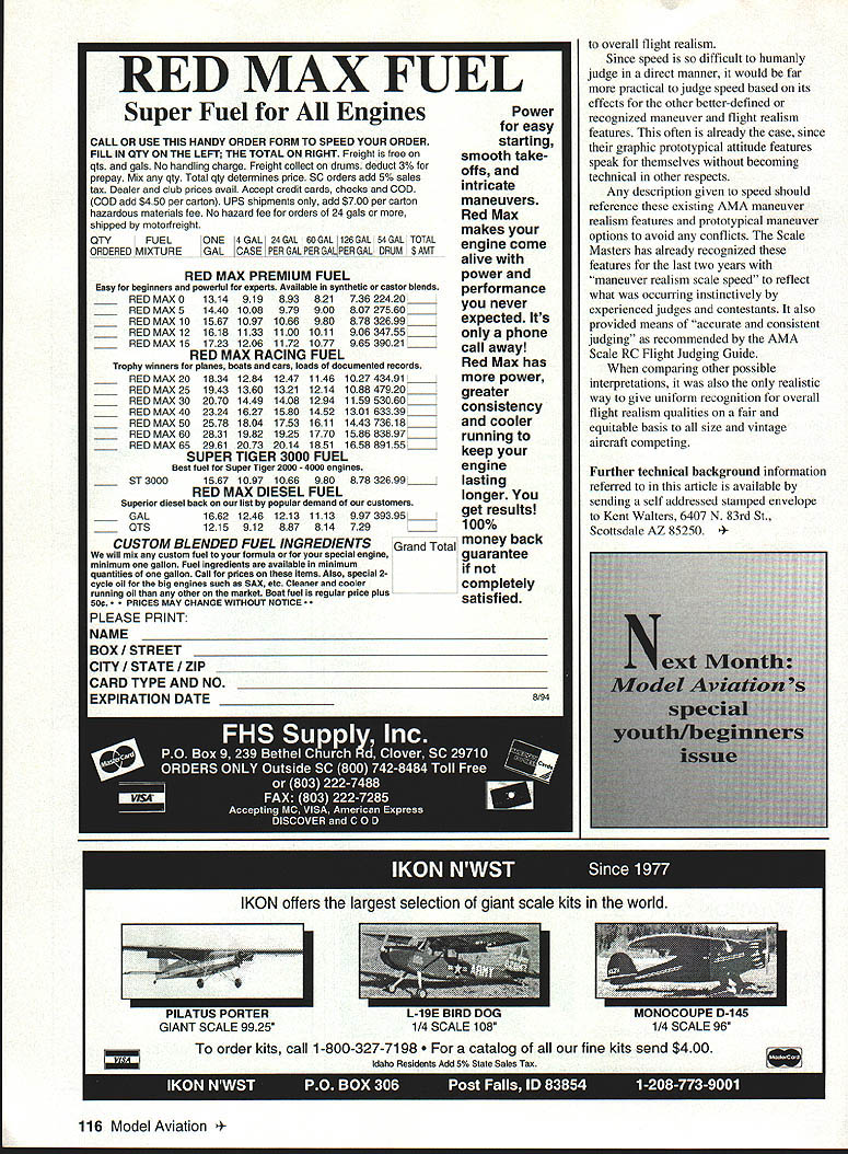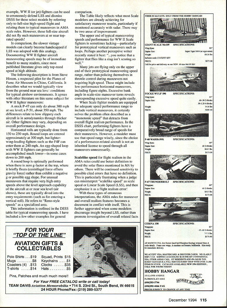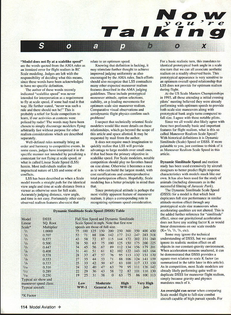 Mc w fun g Model does fly scalelike speed words quoted AMA rules itemized error flight realism RC Scale modeling Judges left responsibility deciding what means since words have acknowledged have no specific definition author words recently indicated scalelike speed never intended interpretation requirement fly scale speed some read way further stated never such rule should probably relief Scale competitors learn activities contests policed radar words may have chosen simply discourage modelers flying arbitrarily fast purpose other realism considerations described separately Well-defined rules normally bring order harmony competitive events some cases judges have interpreted specific manner intended penalizing contestant flying scale speed what called Linear Scale Speed LSS herein Most individuals realize impractical nature LSS some its conflicts LSS has described Scale model travels straight path identical view angle time scale distance viewer otherwise seen full scale Accurately judging distance view angle time easy Fortunately other easily observed realism features also exist relate optimum speed Knowing definition lacking may stimulate further thought achieve improved judging uniformity also encouraged AMA rules Such efforts should also recognize LSS contradicts other expected maneuver realism features described AMA judging guidelines include prototypical maneuver attitude option selections stability g-loading movements optimum scale size maneuver realism Comparative visual observations aerodynamic flight physics confirm such problems suspect technically oriented Scale modelers would like details relationships go beyond scope article space allotted may requested mail author does require much imagination quickly realize LSS will provide advantage large models over small ones primary objective scalelike speed Scale modelers notable competition should play no favorites based size alone Otherwise becomes race can build largest model cost ramifications counterproductive total participation effects Hopefully Scale modeling has better principle mind Since prototypical attitude perhaps visibly apparent feature maneuver realism plays corresponding role recognizing optimum speed consideration basic realistic turn translates identical prototypical bank angle scale size turn can associate aesthetic realism readily observed basis prototypical appearance very sensitive optimum overall speed relationship LSS does provide optimum realism during flight US Scale Masters Championships 1993 attending initial evening pilots meeting believed already performing optimum speeds provide both scale size maneuvers along prototypical bank angle turns compared full size agree notable pilots Since would also likely agree two profoundly basic important features flight realism what called Maneuver Realism Scale Speed historical definitions Dynamic Similitude Scale Speed DSSS palatable just continue think Maneuver Realism Scale Speed article Dynamic Similitude Speed motion study has used extensively aircraft designers better predict flight response characteristics models much like own has also used study animals including dinosaurs successful filming Jurassic Park Dynamic Similitude Scale Speed DSSS model best duplicates full size performance similar attitude-motion effect through prototypical scale size maneuvers accelerating qualities altered added further reference similitude effect since gravitational acceleration does have scaling factor K would linear dimensions scale models K 1/4 1/5 /6 etc Some may ignore technical understanding DSSS cannot ignore its realistic motion effect objects constant-gravity environment acceleration remains unaltered can demonstrated DSSS provides square-root relation scale K factor summarized table later article As competition Scale modelers already likely performing quite well duplicate DSSS maneuver flight realism simply because gravity physics mandates much An oversight can occur comparing Scale model flight full-size combat aircraft capable high pursuit speeds 114 Model Aviation ple WW II jet fighters can used erroneously defend LSS dismiss DSSS select models referring full-size high-speed flight relating typical maneuvers AMA scale rules However full-size aircraft did fly such maneuvers near toprated speeds comparison slower vintage models can clearly become handicapped LSS adopted analogy Documenting WW II fighter aircraft maneuvering speeds may immediate benefit readers since published literature gives top-rated speed high altitude following description Steve Hinton respected pilot Planes Fame Air Museum Chino California describes what would typically view ground near sea leve conditions typical airshow environments agrees other literature same subject WW II fighter maneuvers stock P-47 can about 300 mph sea level P-S 1 about 350 mph differences relate slippery aircraft aerodynamics through thicker air Other fighters may vary depending overall performance design Horizontal rolls typically done 150 250 mph Round loops entered approximately 300 mph lighterwing-loading fighters such F4F can enter 240 mph An egg-shaped loop WW II fighters can generally accomplished much lowerin some cases down 200 mph round loop optimally performed zero g-factor top briefly floats centrifugal force offsets gravity force rather exhibit negative g possible egg shape unusual maneuvers require very high entry speeds above level approach capability aircraft near sea level air shows typically dived entry requirements such entering vertical roll refers Reno-style speeds specialized area information outlined DSSS table typical maneuvering speeds have included few other examples general FOR YOUR TOP OF THE LINE AVIATION GIFTS & COLLECTABLES Polo Shirts . $19 Mugs$8 Coasters 4$13 T-shirts$14 Squad Prints $15 Keychains . Clocks$35 Hats$5 Pins Patches much much more! comparison Table likely reflects what Scale modelers already achieving satisfactory maneuver results particularly monitored accurately radar may 