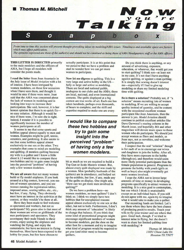 U Thomas M Mitchell M LiJ kiri onivailable space THIS LETTER IS DIRECTED primarily male modelers officers AMA hope modelers will consider points made read letter Joan Anastasio July issue Model Aviation lot interest have intrigued women modelers few occasions have seen thought would nice Joan said AMA concerned about lack women modeling looking ways increase participation said however honest opinion no quick fix no easy solution Although would nice Im sure right Indeed wonder possible significantly increase number women participants seems some sports hobbies appeal almost equally men women Examples might golf tennis ceramics gardening also seems some hobbies appeal almost exclusively sex other Two examples come mind modeling quilting mention quilting because wife quilter know little about would like compare two hobbies try gain some insight perceived problem having few women modelers aware women build fly model airplanes look around big contest however see lots women spectators see women running registration tables impound areas scoring tables etc etc few flying obviously must have interest activities contest wouldnt Have made feel welcome spectators workers participants guess also women wives girlfriends men participants spectators accompany male friends events enjoy seeing airplanes watching flying enjoy camaraderie have no interest flying themselves Most have exposed hobby years few have chosen actually participate point perceive have problem start wonder can get women participate Now let digress quilting very large active hobby US fully large active modeling local national guilds analogous clubs AMA local national international contests quilts displayed big contest true works art has taken hundreds perhaps thousands hours complete skill expertise required make would like compare two hobbies try gain some insight perceived problem having few women modelers bit much required build Top Gun Scale Masters winner almost quilt displayed made woman Men probably husbands quilters attendance helped set up exhibits few made quilts display might ask can get men involved quilting have problem hereno women modelers no men quilters dont think think simply have two hobbies unexplained reasons appeal almost exclusively sex other both Furthermore dont think amount education likely change balance think some kind promotional program might encourage significant numbers women become modelers put shoe other foot moment try imagine what kind program would required get other men become quilters think anything amount advertising exposure education whatever would get start quilting think notat least case Its have anything against quilting against man quilting simply sewing doesnt interest meespecially give up modeling share limited modeling time quilting So solution Probably solution means recruiting lots women modeling willing accept quality instead quantity content occasional excellent woman participant like Joan Anastasio answer yes Model Aviation should continue publish excellent articles like Dave Garwoods soaring column March issue hopefully MA other magazines will devote space women participate should just accept women fliers models Joan says novelties welcome participation suspect real solution though us encourage wives daughters join hobby After have exposure hobby through us therefore would seem likely potential participants female population general Programs promote hobby youth girls well boys also might eventually get women involved urge AMA invest large amounts time money developing programs specifically attract women modeling nice goal contemplate think unattainable except individual basis still agree again try imagine what would take make quilter recruiting funds limited Lets use have best chance producing positive results Teach wife fly trainer see goes Good luck though Ive tried interest flying doesnt want share limited quilting time modeling as M Mitchell 11831 Chase Lake Dr Houston IX 77077 46 Model Aviation time time s may affect public opinions expressedbe consti sstaffortlu