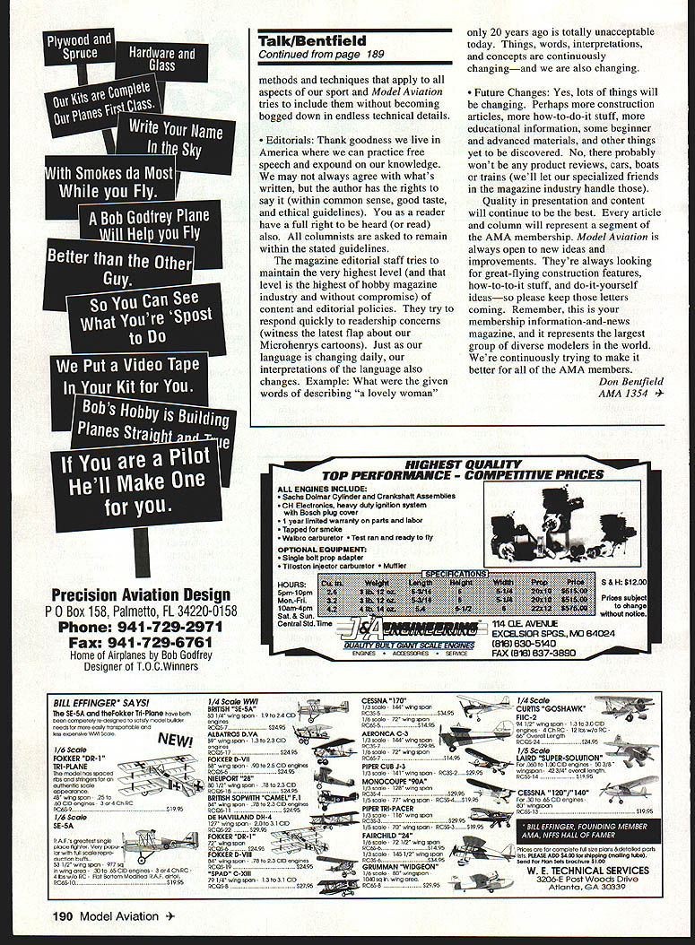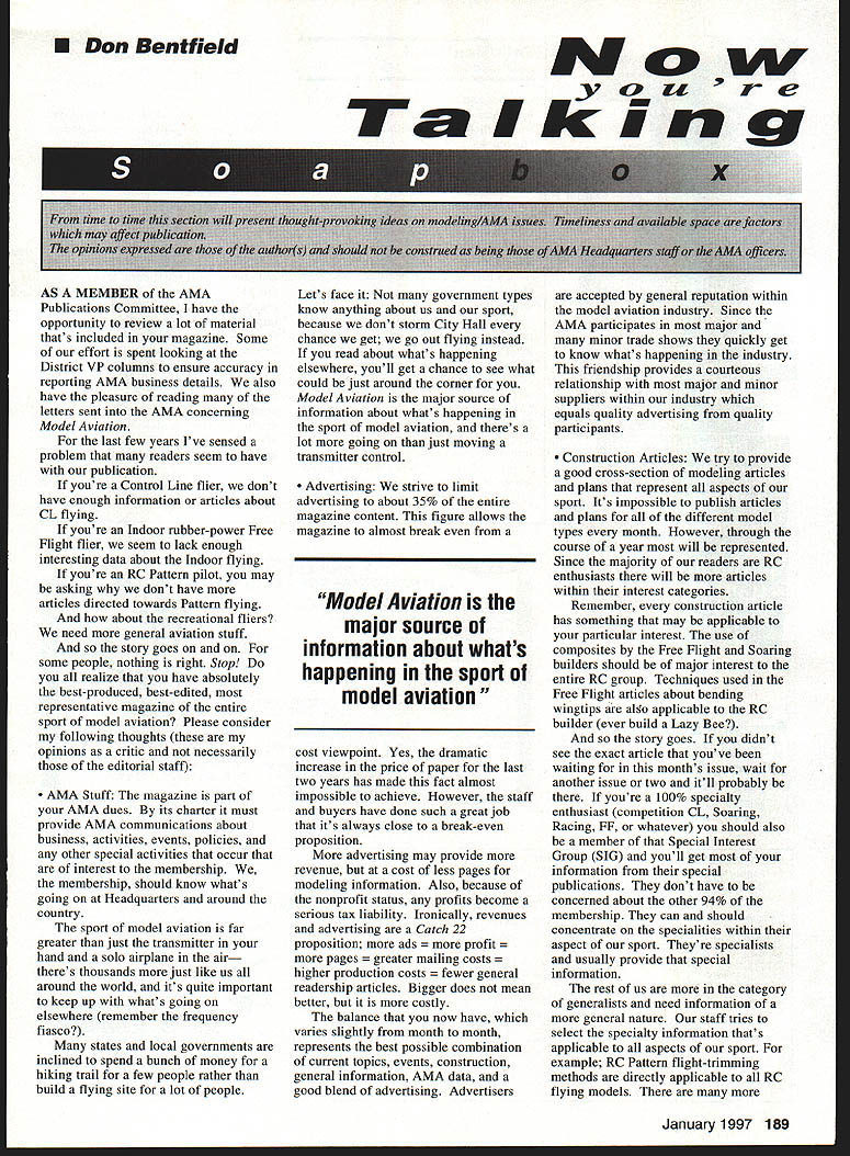 U Don Bent field N C Ikii EMBER AMA Publications Committee have opportunity review lot material thats included magazine Some effort spent looking District VP columns ensure accuracy reporting AMA business details also have pleasure reading letters sent AMA concerning Model Aviation last few years Ive sensed problem readers seem have publication youre Control Line flier dont have enough information articles about CL flying youre Indoor rubber-power Free Flight flier seem lack enough interesting data about Indoor flying youre RC Pattern pilot may asking dont have articles directed towards Pattern flying about recreational fliers need general aviation stuff story goes on some people nothing right Stop realize have absolutely best-produced best-edited representative magazine entire sport model aviation Please consider following thoughts opinions critic necessarily editorial staff AMA Stuff magazine part AMA dues its charter must provide AMA communications about business activities events policies other special activities occur interest membership membership should know whats going Headquarters around country sport model aviation far greater just transmitter hand solo airplane air theres thousands just like us around world its quite important keep up whats going elsewhere remember frequency fiasco states local governments inclined spend bunch money hiking trail few people rather build flying site lot people Lets face government types know anything about us sport because dont storm City Hall chance get go out flying instead read about whats happening elsewhere youll get chance see what could just around corner Model Aviation major source information about whats happening sport model aviation theres lot going just moving transmitter control Advertising strive limit advertising about 35% entire magazine content figure allows magazine almost break Model Aviation major source information about whats happening sport model aviation cost viewpoint Yes dramatic increase price paper last two years has made fact almost impossible achieve However staff buyers have done such great job its always close break-even proposition advertising may provide revenue cost less pages modeling information Also because nonprofit status profits become serious tax liability Ironically revenues advertising Catch 22 proposition ads it s ter mailing costs er production costs r general readership articles Bigger does mean better costly balance now have varies slightly month month represents best possible combination current topics events construction general information AMA data good blend advertising Advertisers accepted general reputation within model aviation industry Since AMA participates major minor trade shows quickly get know whats happening industry friendship provides courteous relationship major minor suppliers within industry equals quality advertising quality participants Construction Articles try provide good cross-section modeling articles plans represent aspects sport Its impossible publish articles plans different model types month However through course year will represented Since majority readers RC enthusiasts will articles within interest categories Remember construction article has something may applicable particular interest use composites Free Flight Soaring builders should major interest entire RC group Techniques used Free Flight articles about bending wingtips alSo applicable RC builder ever build Lazy Bee story goes didnt see exact article youve waiting months issue wait another issue two itll probably youre 100% specialty enthusiast competition CL Soaring Racing FF whatever should also member Special Interest Group SIG youll get information special publications dont have concerned about other 94% membership can should concentrate specialities within aspect sport Theyre specialists usually provide special information rest us category generalists need information general nature staff tries select specialty information thats applicable aspects sport example RC Pattern flight-trimming methods directly applicable RC flying models January1997 189 TalklBentfield Continued page 189 methods techniques apply aspects sport Model Aviation tries include becoming bogged down endless technical details Editorials Thank goodness live America can practice free speech expound knowledge may always agree whats written author has rights say within common sense good taste ethical guidelines reader have full right heard read also columnists asked remain within stated guidelines magazine editorial staff tries maintain very highest level level highest hobby magazine industry compromise content editorial policies try respond quickly readership concerns witness latest flap about Microhenrys cartoons Just language changing daily interpretations language also changes Example What given words describing lovely woman 20 years ago totally unacceptable today Things words interpretations concepts continuously changingand also changing Future Changes Yes lots things will changing Perhaps construction articles how-to-do-it stuff educational information some beginner advanced materials other things yet discovered No probably wont product reviews cars boats trains well let specialized friends magazine industry handle Quality presentation content will continue best article column will represent segment AMA membership Model Aviation always open new ideas improvements Theyre always looking great-flying construction features how-to-to-it stuff do-it-yourself ideasso please keep letters coming Remember membership information-and-news magazine represents largest group diverse modelers world continuously trying make better AMA members Don Bentfield AMA 1354 EST QUALITY TOP PERFORMANCE COMPETiTIVE PRICES ALL ENGINES INCLUDE Sacha Doimar Cylinder Crankshaft Assemblies CH Electronics heavy duty ignition system Bosch piug cowr 1 year limited warraniy pans labor Tapped smoke Waro carburetor ran end ready fly EQUIPMENT ooe prop adapter ml .& .. hi 