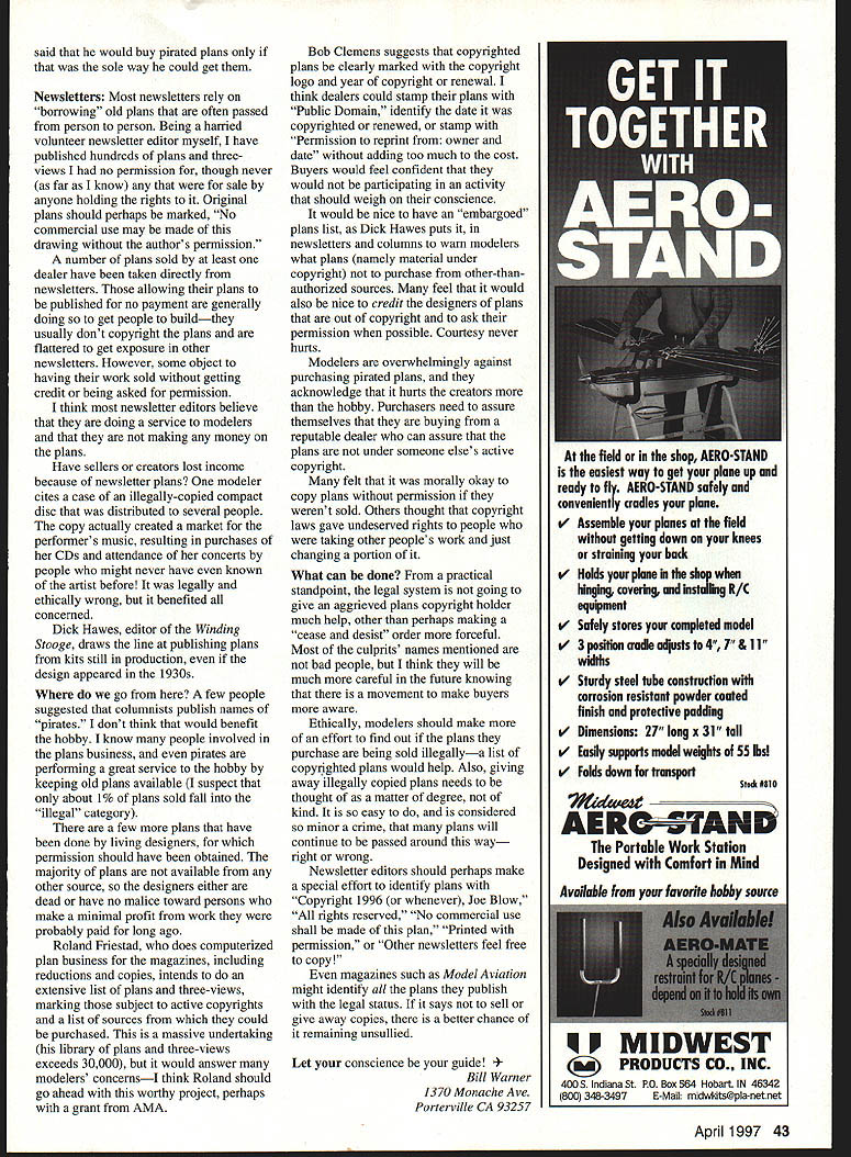 U Bill Warner time may aftec opinions exj M w fun RECEIVED LETTER old friend model plans dealer has opened up topic modelers want think about piracy Some plans selling legally being copied sold much leave subject already mind conversation last year Ed Packard venerable Cleveland Model Supply has complained same thing years put piracy issue out discussion via FF Sport & Scale column received landslide feedback much quite emotional term can worms used number respondents chastised exposing issue thoughtful comments poured concerned plans dealers buyers designers newsletter editors stripped capabilities deal issue within confines column pirates question will remain namelessthe process important players know few persons accused honorable men have done hobby modelers ever will issue remains Piracy has two aspects legal moral legal part about simple gets creator set plans person entity purchasing rights plans has exclusive right profit duration copyright has secured Persons copy sell copyrighted plans permission breaking law can sued although has never happened because expense process would exceed amount money might recovered Works published prior January 1 1978 could copyrighted 28 years renewable another 47 years Some plans like Clevelands copyrighted copyrights renewed some plans magazines now-defunct model companies Plans copyrighted since 1978 protected creators lifetime plus 50 years prospective buyer sees no copyright date set plans know generally assumed someone selling materials has rights always true people engage piracy cause loss income copyright owner legally buy set plans enlarge copier own use trouble make copy give sell friend strict interpretation copyright law states friend deprived copyright owner income could reasonably argue recipient would have purchased plans own no ones income would affected either way law law It is generally assumed someone selling materials has rights always true Considering number people record songs radio record movies television US population should behind bars depriving copyright owners what would have gotten works purchased market law although side copyright holder useless several reasons difficulty documenting loss income ease copies can made widespread nature practice prohibitive legal costs involved makes possible pin down two flagrant violators Perhaps main issue individual modeler ethical Consider point view persons involved Plan Creator Designer Vein Clements top creators around has created plans hundreds hours hard work full-size Gee Bees have successfully built flown sale plans significant part income someone copies sells directly affected Legendary designers such Bill Winter Earl Stahl late Wait Mooney have countless models published magazines plans readily available deaiers some have sought designers permission some have magazine intending sell copies plans prints will hold rights no special arrangements have entered creator plan printed one-shot basis will have rights retained creator Since authors consider work good hobby plans business always upset someone wants add plan selling list realize margin profit usually smail paying royaities would too much burden dealer Earl Stahl says bothered piracy plans gets annoyed someone makes changes person leaves [Stahls] name Bill Winter says . feels pleased honored somebody runs something may older family prolific Wait Mooney used say main interest get people build didnt care passed plans around An interesting piracy scenario brought up Suppose person makes three-view drawing outlines fullsized aircraft way has taken work airplanes designer someone uses three-view model planthis person has taken two previous creations paying Jim Walkers patented bellcrank idea used would three someone takes model plans changes few lines sells different set plans under own name plans dealer makes unauthorized copy adds line much leave anyone gets complicated Plans Seller Does own plans sells Some dont much create modify plans sell often improving 38 Model Aviation 4ideas iot con availal putting several magazine pages together sheet adding missing part outlines original kit adding missing wing half etc changes have made before no longer original plan have rights plans sell result financial transaction though did draw Cleveland Models example Finally sellers have obtained plans copy sell virtually drawn either permission designer copyright holder Fran Ptaskiewicz holds copyright release sell Harold deBolts plans tells guy returned plans just purchased asking exchange Fran recognized plans pirated sent guy explanation request reimbursed postage has never heard back him Now weve added discourtesy illegal unethical Most sellers know giving up day jobs provide valuable service fellow modelers rescuing plans intents purposes lost us have made available reasonable cost large percentage sellers make effort get proper permission plan designer owner rights still alive identified some respondents pirates sell plans part controversial magazines print tiny plans small models sell full-sized copies opposed Golden Age model magazine printed full-sized build-on plans issue Some like Aeromodeller still provide fold-out plans Two persons said resent practice because discourages beginners think would applaud someone enlarged magazine presentation illegally passed around though would deprive magazine income Quite often plans appearing magazines property creator technically take plans magazine newsletter enlarge sell piracyeven give plans away Average Modeler 80% wrote said would buy plan knew pirated Pete Kerezman sums up dominant attitude sically its wrong steal both seller buyer diminished participating such activity respondents noted however FF Scale movement would have seriously impeded plans pirated available via small dealers newsletters Quite few said no way knowing plan legally copied excellent point modeler protested legal owner line plans did create owned copyright charging too much made him real pirate another person used t