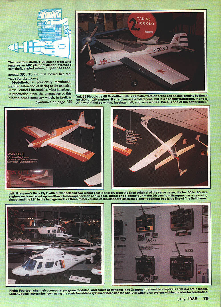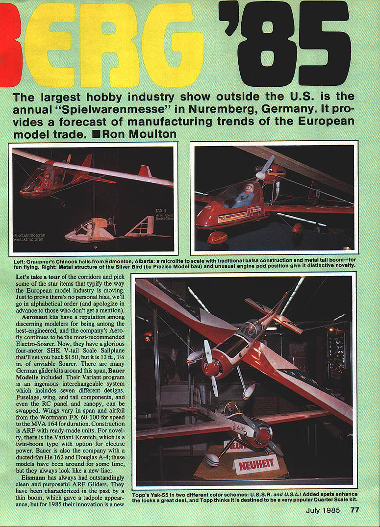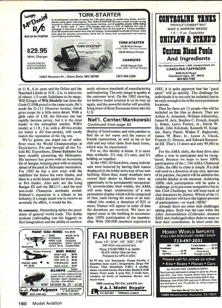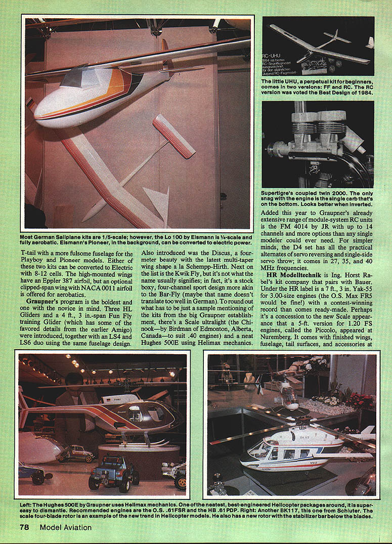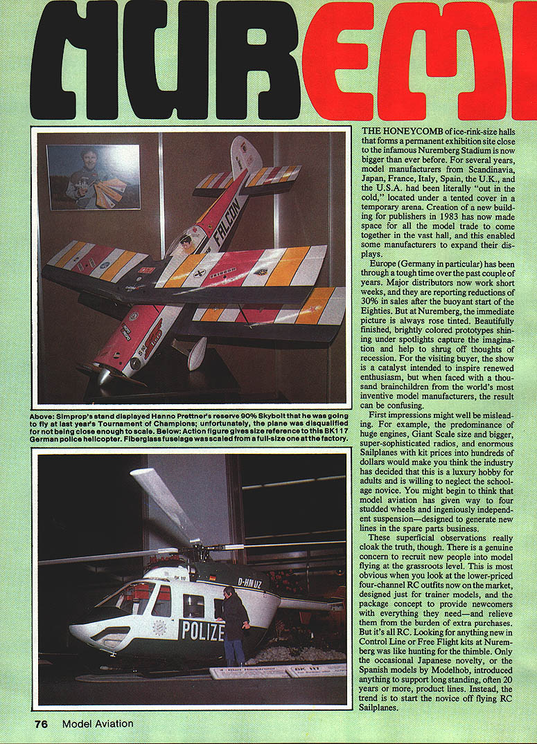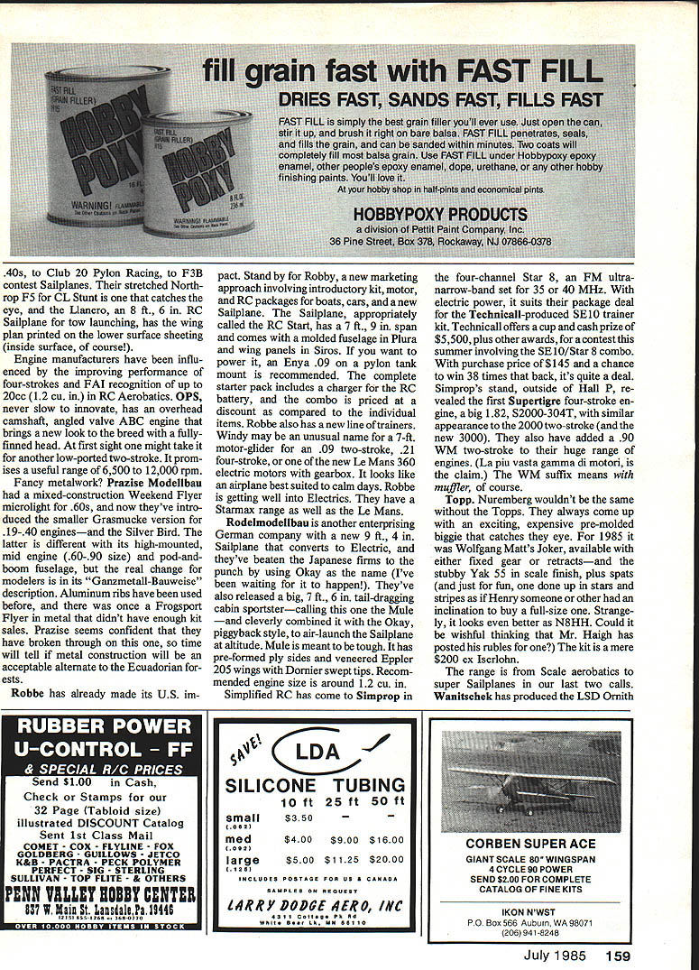 NEYC anei r ocrore eturers fr Italy Sp lii under ia Crenti era rmany pa time ove tributoi DiC OU remberg rose tinte colored w I0 thei tintenc 1 butwi Lchlldrenthe won model manuracturers t b Skybollessions might w - plarample pr flCGiant Scale illcoated radio maze uillingti annel dius 70 Model Aviation NO OCR TEXT JHUa two ye rag vote 0 U1 j The 0nI cambthats Inverted _____________________________byJR Elema optioiia tian sonverted tI r need set baa d waa th4o verainai ea Sch idea ikFlydeilteeha gnifiea iimuany t nel sport lab raucrnv1 a US rau nted vice ready ft. ai new Scale version sanof Pie 40 comes using surfaces ____ NO OCR TEXT * * Long Engine Life * * Use BRU LINE Air Cleaner Completely Fuel Proof Nylon Rubber Parts Cat No 102 Air Cleaner Coarse Cat No 202 Air Cleaner Fine Replacement Inserts Cat No 104 Pkl2 Inserts Coarse Cat No204 Pk/2 lnsertsFine FITS MOST ENGINES 25and UP SEE YOUR LOCAL HOBBY DEALER IF UNAVAILABLE LOCALLY SEND TO lAdd 75C shippingMichigan residents add 4% sales tax Bru Line Industries Inc PO Box 3786 center Line Michigan 48015 PLUS Wing Kit Updates NOVICE 4 Channel SPORTSMAN Are Ready DEALER & DISTRIBUTOR INQUIRIES IN VI TED GRAPHICS STRIPING TAPE 60 feet price 36 L&L MODEL PRODUCTS Introduces $225 $225 $195 $195 -THETRAINING 3 Channel SimplicityAerobatic Ailerons Flat Bottom wing Forgiving Maximum Stability L S L MODEL PRODUCTS 7342 Appleridge Ct Cincinnati Ohio 45247 Phone 513/385-0912 L&L SPARLOCK Wing Construction Featured Both Kits 55 Wing Span29-40 Engine 3 sizes package -/6 /8 -e--- /4 /1 RsbRHoPA sembly Also add 1/16 x -in cap strips leading edge rounded very blunt curve planked area After planking cap strips dry comes fun part adding lightness want R have its maximum per formance potential step must omit Incredible may seem properly done adding lightness can re sult finished model being much sturdier often-disregarded principle overlooked Mark limits area removed soft pencil carve sand LE spars TE final contours After warps steamed out use coarse sandpaper thin TE approximately 1/16 plans show what can best understood general strategy concentrating models struc tural mass center tapering structure toward wing tips stab stab tips engine mount such way approximate strength needed point withstand variable stress pat terns can occur result vertical dive ground maximize probability structural survival impact forces recommended outboard wing tip weight box made length in-dia rocket tube Carve -in piece balsa plug aft end epoxy tube place wingtip Shape front end tube sanding block match airfoil section lead weight should pointed front end wrapped sponge rubber snug fit tube Cover open end tube transparent tape until have arrived final trimmed weight needed put patch MonoKote over glory scheme tip weight can bash its way through tape/covering event crash its mass will break structure could glued place Cover wing iron-on plastic film Chrome Mono Kote top prevents hot sunlight warping things Sources rocket tubes few hobby shops model rocketry supplies may carry separate rocket tubes stock Other wise local level youll have buy model rocket kits get tubes can bit patient willing order mail can get catalogs prices either Flight Sys tems Inc 9300 E 68th St Raytown MO 64133very crush-resistant tubes sizes available finished bond paper better gluing $1 catalog Estes Industries Penrose CO 81240tubes thin lightweight glassine finished free catalog continued Nuremberg/Moulton Continued page 79 indicative growth Spanish indus try kits neat nearly scale true scale range FAI Combat RC Tucano 158 Model Aviation NEW MK 2 H & K SUPER STARTERS Look before leap original still best Has new larger clutch fully supported applications 90 day warranty new lower prices MODEL 1 0-35 0-50 ZENOAH ROPER MODEL 2Super Hustler MAG II MODEL 3Tartan Twin Super Twin Glow Manufactured Distributed P K Products PO Box 62260 Hayward CA 945400 415 581-4277 Add Si 50 postage handling $2495 $3295 $3995 Dealers inquiries invited AMERICAN JUNIOR 9A-i Fireball unas have pies available Imihe famous A-J Fleebaii Plans show ali sis production variants pius FOUR modified designs including Fireball Bipe heautilul Sportster set also includes Fireball Finats instructions afew other nice surprises Orderyour Fireball Plan Pak TODAY andstartbuildingyoarownA-IAIRFORcE cOLLEcTION Price includes Maiiiag Tube First class UPS deiivey charges price complete $25 74 GIidcSItl POt1595 74 3Pak140JIIW'5 lal eulde Kit095AIttCttAflCO 4a4ARF1595P0 euxisto 4a4 RTF1795PotSand oe ms5 J Fun Pak 40s Club 20 Pylon Racing F3B contest Sailpianes stretched North rop F5 CL Stunt catches eye Lianero 8 ft 6 RC Sailplane tow launching has wing plan printed lower surface sheeting inside surface course Engine manufacturers have influ enced improving performance four-strokes FAI recognition up 20cc 12 cu in RC Aerobatics OPS never slow innovate has overhead camshaft angled valve ABC engine brings new look breed fullyfinned head first sight might take another low-ported two-stroke prom ises useful range 6500 12000 rpm Fancy metalwork Prazise Modellbau mixed-construction Weekend Flyer microlight 60s now theyve intro duced smaller Grasmucke version 1 9-40 enginesand Silver Bird latter different its high-mounted mid engine 60-90 size pod-andboom fuselage real change modelers its Ganzmetall-Bauweise description Aluminum ribs have used before once Frogsport Flyer metal didnt have enough kit sales Prazise seems confident have broken through time will tell metal construction will acceptable alternate Ecuadorian ests Robbe has already made its US im pact Stand Robby new marketing approach involving introductory kit motor RC packages boats cars new Sailplane Sailplane appropriately called RC Start has 7 ft 9 span comes molded fuselage Plura wing panels Siros want power Enya 09 pylon tank mount recommended complete starter pack includes charger RC battery combo priced discount compared individual items Robbe also has new line oftrainers Windy may unusua