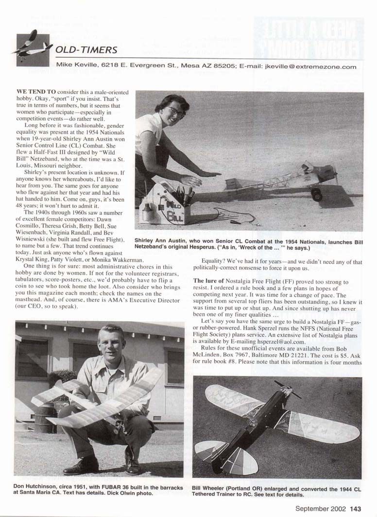 WE TEND TO consider this a male-oriented hobby. Okay, "sport" if you insist. That's true in terms of numbers, but it seems that women who participate—especially in competition events—do rather well. Long before it was fashionable, gender equality was present at the 1954 Nationals when 19-year-old Shirley Ann Austin won Senior Control Line (CL) Combat. She flew a Half-Fast III designed by "Wild Bill" Netzeband, who at the time was a St. Louis. Missouri neighbor. Shirley's present location is unknown. If anyone knows her whereabouts, I'd like to hear from you. The same goes for anyone who flew against her that year and had his hat handed to him. Come on, guys, it's been 48 years; it won't hurt to admit it. The 1940s through 1960s saw a number of excellent female competitors: Dawn Cosmillo, Theresa Grish, Betty Bell, Sue Wiesenbach, Virginia Randall, and Bev Wisniewski (she built and flew Free Flight), to name but a few. That trend continues today. Just ask anyone who's flown against Krystal King. Patty Violett, or Monika Wakkerman. One thing is for sure: most administrative chores in this hobby are done by women. If not for the volunteer registrars, tabulators, score-posters, etc., we'd probably have to flip a coin to see who took home the loot. Also consider who brings you this magazine each month; check the names on the masthead. And, of course, there is AMA's Executive Director (our CEO, so to speak). Shirley Ann Austin, Netzeband's original who won Senior CL Combat at the 1954 Nationals, launches Bill Hesperus. ("As in, 'Wreck of the ...'" he says.) Equality? We've had it for years—and we didn't need any of that politically-correct nonsense to force it upon us. The lure of Nostalgia Free Flight (FF) proved too strong to resist. I ordered a rule book and a few plans in hopes of competing next year. It was time for a change of pace. The support from several top fliers has been outstanding, so I knew it was time to put up or shut up. And since shutting up has never been one of my finer qualities ... Let's say you have the same urge to build a Nostalgia FF—gas-or rubber-powered. Hank Sperzel runs the NFFS (National Free Flight Society) plans service. An extensive list of Nostalgia plans is available by E-mailing hsperzel@aol.com. Rules for these unofficial events are available from Bob McLinden. Box 7967, Baltimore MD 21221. The cost is $5. Ask for rule book #8. Please note that this information is four months Don Hutchinson, circa 1951, with FUBAR 36 built in the barracks at Santa Maria CA. Text has details. Dick Olwin photo. Bill Wheeler (Portland OR) enlarged and converted the 1944 CL Tethered Trainer to RC. See text for details. old. I assume it is current, but I can't guarantee that. Don Hutchinson is one of those rare types who excels in more than one category. At one time he held the Open AMA national record in F1 A. then known as A/2 Nordic Towline Glider. Today he's an accomplished CL Stunt competitor, with frequent wins in the Old-Time event using spark-ignition engines. You may recall his near-scale Stearman CL Stunt model in a construction article that was published in Flying Models. In 1951, while a member of the Minnesota Air National Guard. Don was called to active duty and was shipped to an aircraft-mechanic school in Santa Maria. California. He soon discovered a newsstand in town that carried a few model supplies. As he recalls: "I bought a Firebaby/Wasp .049 which I flew between the barracks. When I got tired of that I bought a Free Flight kit. a FUBAR 36. |For the uninitiated, FUBAR is an unofficial military acronym meaning Fouled-Up Beyond All Recognition —sort of.] "Since the school had no facilities for model building, I did that while sitting on my bunk in the barracks. I removed the drawer from my small dresser, turned it over in my lap and pinned the surfaces to it. The model was covered with Japanese tissue and doped in the barracks. No one complained; probably because the dope fumes smelled better than the cigars smoked by the guy in the top bunk. "The school was located on a small, little-used airport so I flew the model on Sundays. One of my barracks mates wanted to see it fly, suggesting that we launch it off the top of a hangar 'so it would fly better.' 1 replied that I didn't think that would be necessary, and as it turned out 1 was correct. A terrific climber, it hooked a thermal and was last seen heading southeast and very high. No dethermalizer of course, so it went AWOL. "Today that school is known as Hancock College and of course the airfield is long gone. The photo was taken by Dick Olwin, who stopped by to visit while en route to Korea." Retired from TRW, Don moved from California to Texas a few years back and is now a leading sparkplug (pun intended) in Dallas-Fort Worth area CL activities. If any of Don's former Minneapolis club members would like to contact him, he's at 4 Mistywood Ct., Mansfield TX 76063, or E-mail dhutch2@earthlink.net. (We'll go to any lengths, won't we? I once built a Cleveland Nieuport 17 on the lid of an Army footlocker at Fort Senning, Georgia. It pains me to admit that it was rudely dumped in a trashcan when I was shipping out for Vietnam in 1965.) I really started something with that photo of Floyd Carter's CL Tethered Trainer in the November 2001 column. An Earl Cayton design originally published in the 1944 Air Trails Annual, the response has been incredible. Floyd says he's been swamped with plans requests (at $4 postage-paid from 2029 Crist Dr., Los Altos CA 94024; E-mail: AeroPlyCo@ aol .com). Now comes word of a Radio Control (RC) version. Bill Wheeler of Portland, Oregon, writes: "That picture really got my attention. Here is a photo of one I built in 1946 when I was 16. It has a long history as a hangar queen, maybe a world record. A few months ago I took it out of the attic intending to throw it out, but I like the design so much that I couldn't bring myself to trash it, even though it was in really sad 