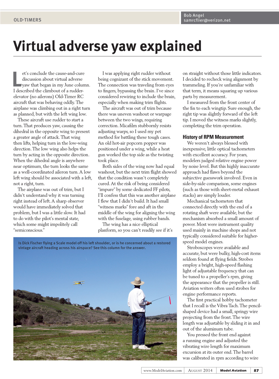 Let’s conclude the cause-and-cure discussion about virtual adverse yaw that began in the June column. I described the climbout of a rudder-elevator (no ailerons) Old-Timer RC aircraft that was behaving oddly. The airplane was climbing out in a right turn as planned, but with the left wing low.