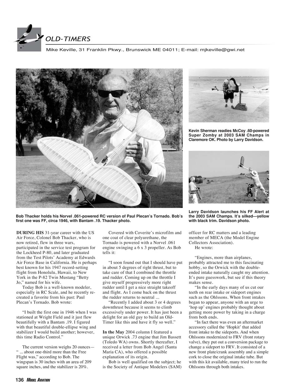 Bob Thacker holds his Norvel .061-powered RC version of Paul Plecan’s Tornado. Bob’s