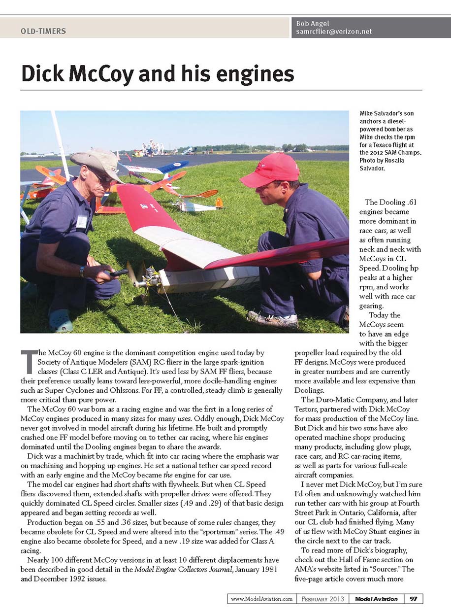 Dick McCoy and his enginesT he McCoy 60 engine is the dominant competition engine used today by Society of Antique Modelers (SAM) RC fliers in the large spark-ignition classes (Class C LER and Antique). It’s used less by SAM FF fliers, because their preference usually leans toward less-powerful, more docile-handling engines such as Super Cyclones and Ohlssons. For FF, a controlled, steady climb is generally more critical than pure power. The McCoy 60 was born as a racing engine and was the first in a long series of McCoy engines produced in many sizes for many uses. Oddly enough, Dick McCoy never got involved in model aircraft during his lifetime. He built and promptly crashed one FF model before moving on to tether car racing, where his engines dominated until the Dooling engines began to share the awards. Dick was a machinist by trade, which fit into car racing where the emphasis was on machining and hopping up engines. He set a national tether car speed record with an early engine and the McCoy became the engine for car use. The model car engines had short shafts with flywheels. But when CL Speed fliers discovered them, extended shafts with propeller drives were offered. They quickly dominated CL Speed circles. Smaller sizes (.49 and .29) of that basic design appeared and began setting records as well. Production began on .55 and .36 sizes, but because of some rules changes, they became obsolete for CL Speed and were altered into the “sportsman” series. The .49 engine also became obsolete for Speed, and a new .19 size was added for Class A racing. Nearly 100 different McCoy versions in at least 10 different displacements have been described in good detail in the Model Engine Collectors Journal, January 1981 and December 1992 issues.Mike Salvador’s son anchors a diesel-powered bomber as Mike checks the rpm for a Texaco flight at the 2012 SAM Champs. Photo by Rosalia Salvador. The Dooling .61 engines became more dominant in race cars, as well as often running neck and neck with McCoys in CL Speed. Dooling hp peaks at a higher rpm, and works well with race car gearing. Today the McCoys seem to have an edge with the bigger propeller load required by the old FF designs. McCoys were produced in greater numbers and are currently more available and less expensive than Doolings. The Duro-Matic Company, and later Testors, partnered with Dick McCoy for mass production of the McCoy line. But Dick and his two sons have also operated machine shops producing many products, including glow plugs, race cars, and RC car-racing items, as well as parts for various full-scale aircraft companies. I never met Dick McCoy, but I’m sure I’d often and unknowingly watched him run tether cars with his group at Fourth Street Park in Ontario, California, after our CL club had finished flying. Many of us flew with McCoy Stunt engines in the circle next to the car track. To read more of Dick’s biography, check out the Hall of Fame section on AMA’s website listed in “Sources.” The five-page article covers much more 97Model Aviation February 2013www.ModelAviation.comOLD-TIMERSBob Angelsamrcflier@verizon.net097