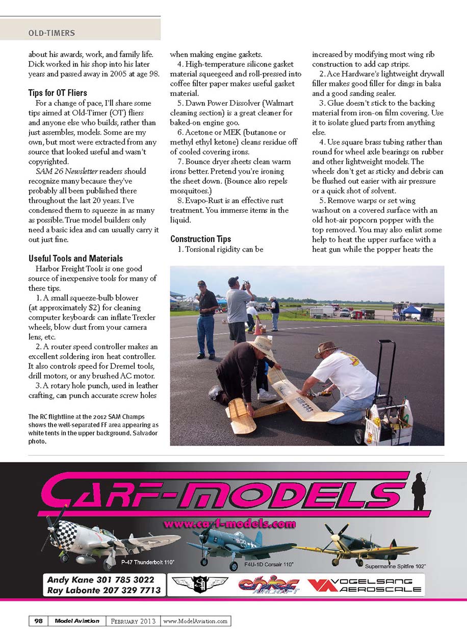 about his awards, work, and family life. Dick worked in his shop into his later years and passed away in 2005 at age 98. Tips for OT Fliers For a change of pace, I’ll share some tips aimed at Old-Timer (OT) fliers and anyone else who builds, rather than just assembles, models. Some are my own, but most were extracted from any source that looked useful and wasn’t copyrighted. SAM 26 Newsletter readers should recognize many because they’ve probably all been published there throughout the last 20 years. I’ve condensed them to squeeze in as many as possible. True model builders only need a basic idea and can usually carry it out just fine. Useful Tools and Materials Harbor Freight Tools is one good source of inexpensive tools for many of these tips. 1. A small squeeze-bulb blower (at approximately $2) for cleaning computer keyboards can inflate Trexler wheels, blow dust from your camera lens, etc. 2. A router speed controller makes an excellent soldering iron heat controller. It also controls speed for Dremel tools, drill motors, or any brushed AC motor. 3. A rotary hole punch, used in leather crafting, can punch accurate screw holes when making engine gaskets. 4. High-temperature silicone gasket material squeegeed and roll-pressed into coffee filter paper makes useful gasket material. 5. Dawn Power Dissolver (Walmart cleaning section) is a great cleaner for baked-on engine goo. 6. Acetone or MEK (butanone or methyl ethyl ketone) cleans residue off of cooled covering irons. 7. Bounce dryer sheets clean warm irons better. Pretend you’re ironing the sheet down. (Bounce also repels mosquitoes.) 8. Evapo-Rust is an effective rust treatment. You immerse items in the liquid. Construction Tips 1. Torsional rigidity can be increased by modifying most wing rib construction to add cap strips. 2. Ace Hardware’s lightweight drywall filler makes good filler for dings in balsa and a good sanding sealer. 3. Glue doesn’t stick to the backing material from iron-on film covering. Use it to isolate glued parts from anything else. 4. Use square brass tubing rather than round for wheel axle bearings on rubber and other lightweight models. The wheels don’t get as sticky and debris can be flushed out easier with air pressure or a quick shot of solvent. 5. Remove warps or set wing washout on a covered surface with an old hot-air popcorn popper with the top removed. You may also enlist some help to heat the upper surface with a heat gun while the popper heats the The RC flightline at the 2012 SAM Champs shows the well-separated FF area appearing as white tents in the upper background. Salvador photo.98Model Aviation February 2013www.ModelAviation.comOLD-TIMERS097
