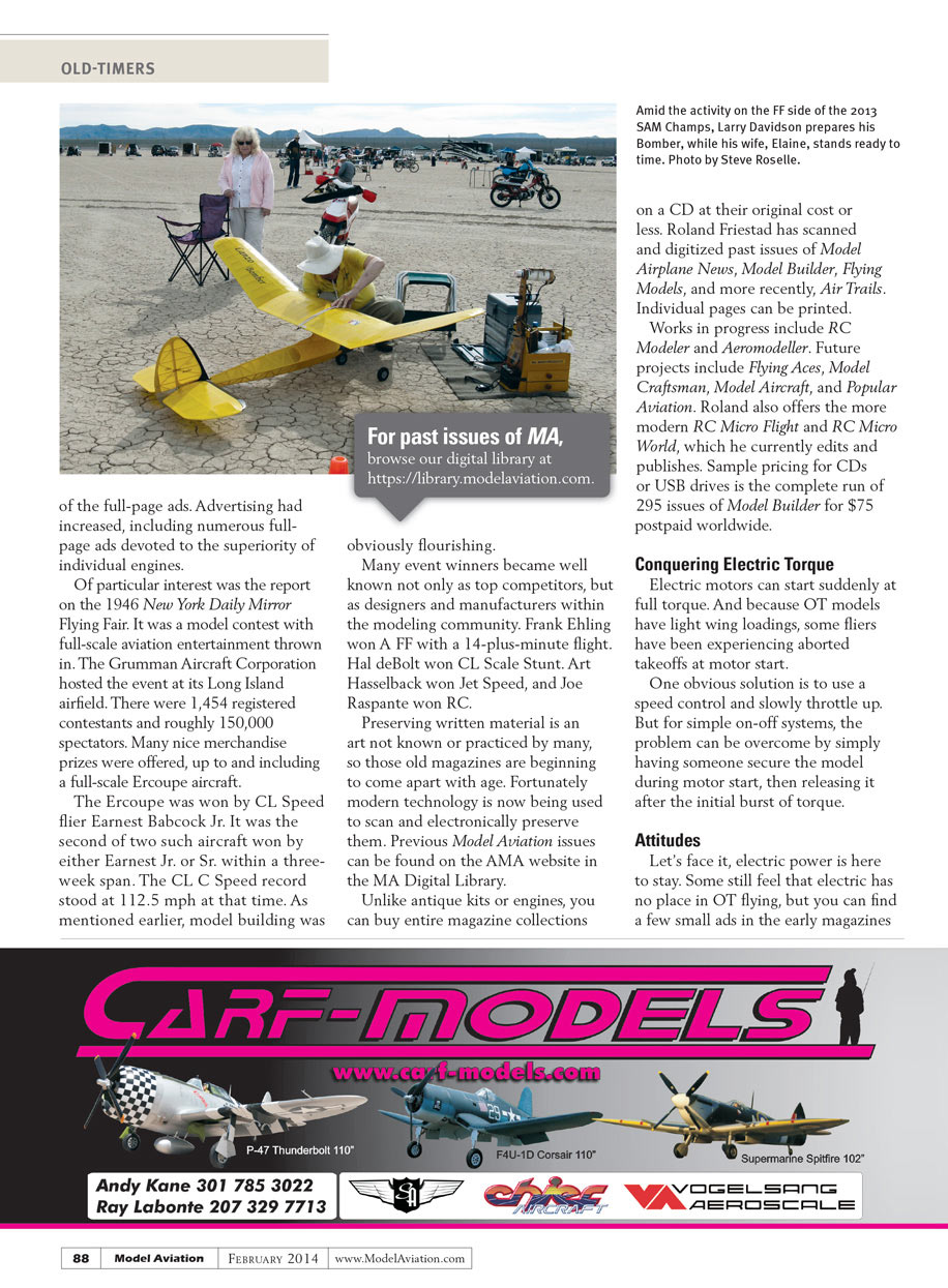 Preserving written material is an art not known or practiced by many, so those old magazines are beginning to come apart with age. Fortunately modern technology is now being used to scan and preserve them electronically. Previous Model Aviation issues can be found on the AMA website in the MA Digital Library.