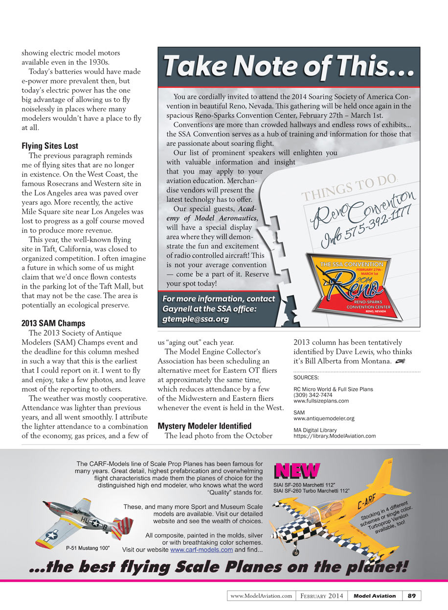 The 2013 Society of Antique Modelers (SAM) Champs event and the deadline for this column meshed in such a way that this is the earliest that I could report on it. I went to fly and enjoy, take a few photos, and leave the main reporting to others.