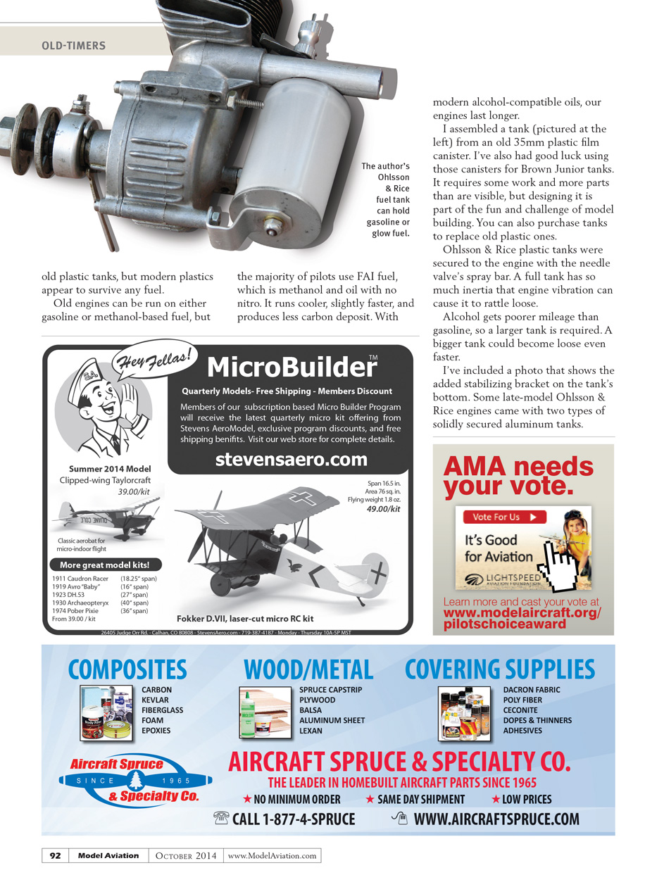 Ohlsson & Rice plastic tanks were secured to the engine with the needle valve’s spray bar. A full tank has enough inertia that engine vibration can cause the tank to rattle loose. Alcohol gets poorer mileage than gasoline, so a larger tank is required. A bigger tank could become loose even faster.