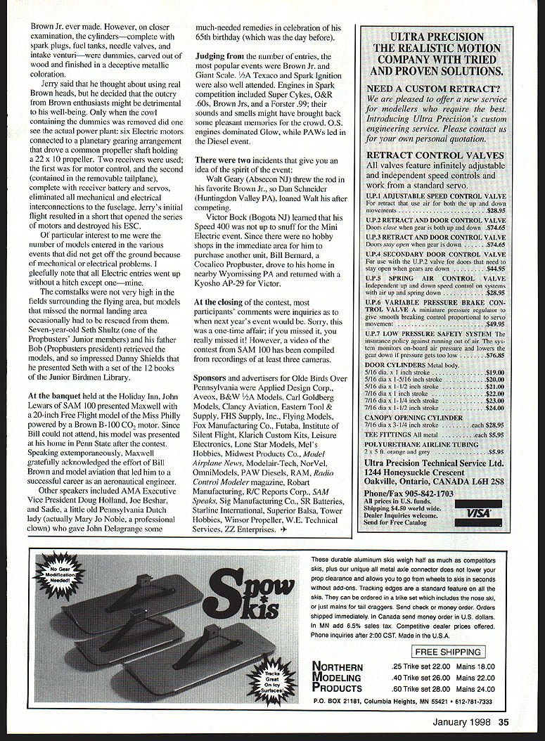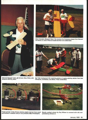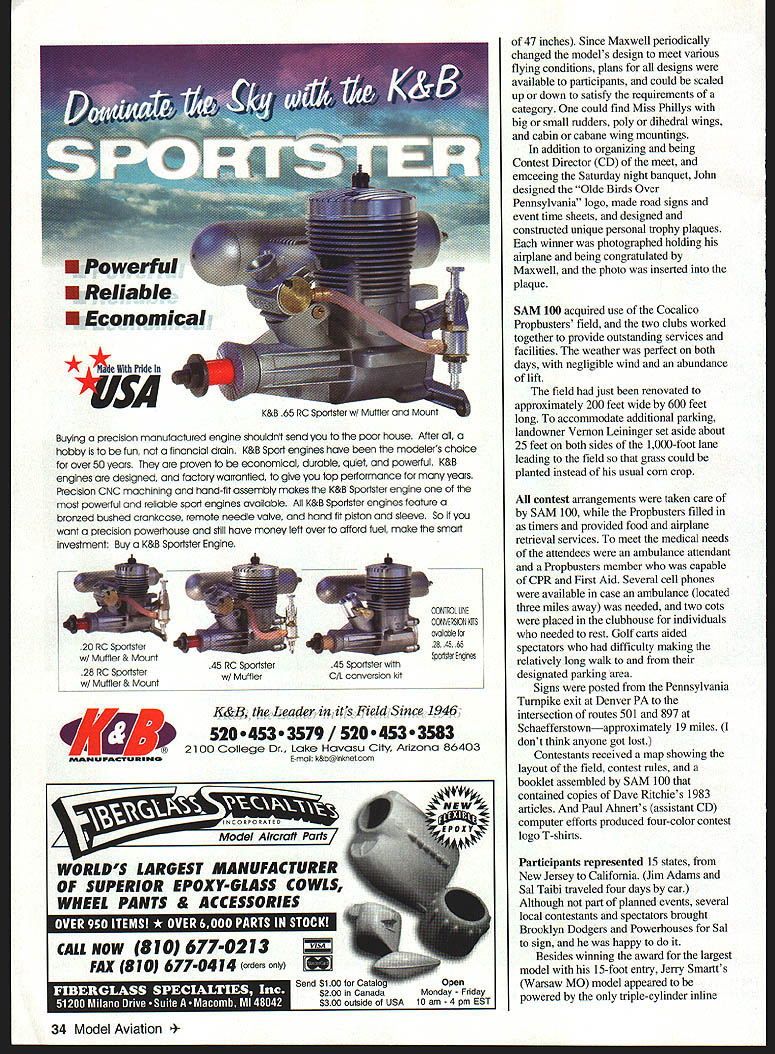 ON JUNE 28-29 1997 Second Chance Squadron SAM Society Antique Modelers 100 Lancaster PA held what some contestants called best-run friendliest most-fun affair ever attendedOlde Birds Over Pennsylvania contest held near Reinholds PA new improved Cocalico Propbusters field weather perfect field great shape organization top-drawer honorees Maxwell Bassett Bill Brown 1932 two men changed modeling forever winning contest gasoline-powered airplane later named Miss Philadelphia Maxwell designed victorious model Bill designed built its engine results contest negated competition between rubber- gasoline-powered model aircraft detailed information about efforts Dave Ritchies three-part article starts September 1983 Model Aviation concept Olde Birds Over Pennsylvania originated John Delagrange president SAM 100 commemorate original event honor Maxwell Bill making guests contest design limited modelMiss Philly Bill supposed have participated other events suffered stroke few weeks before contest John wisdom maximize enjoyment event simplified SAM rules eliminate weight other restrictions fuel battery requirements necessary presenting contestants level playing field Several events defined Giant Scale anything wingspan 84 inches Brown Jr Spark Ignition Diesel 05 Electric Mini Electric limited wingspan maximum 32 Model Aviation 4Bob Kennedy didnt quite get Miss Philly done time event Photos nrrnirlad ttIA author Jerry Smartts 15-foot Miss Philly note triple cylinder in-line Brown dummy engine Go kart wheels dwarf 47-inch Texaco Miss Philly placed between Maxwell Bassett holds gift 20-inch Miss Philly Sal Taibi Lakewood CA receiving plenty engine-starting advice Bob Brown B-100 CO2 motor Champine Joe Beshar others Timer unidentified Triple-cylinder in-line Brown dummy engine carved wood Beauty contest winner Roy Wilson covered silk and finished metallic color Jerry Smartts Miss Philadelphia powered Brown Jr January1998 33 Bob Champine Newport News VA receives first-place plaque Maxwell Brown Jr event Photo model flier added later Buying precision manufactured engine shouldnt send poor house After hobby fun nato financial drain K&B Sport engines have modelers choice over 50 years proven economical durable quiet powerful K&B engines designed factory warrantied give top performance years Precision CNC machining hand-fit assembly makes K&B Sporfster engine powerful reliable sport engines available K&B Sportster engines feature bronzed bushed crankcase remote needle valve hand fit piston sleeve So wont precision powerhouse still have money left over afford tuel make smart investment Buy K&B Sportster Engine 4W CONTROL [NE CONVERSION fES avarloe 2845 65 Spotiter Engines K&J Leader its Field Since 1946 520045303579/520045303583 2100 College Dr Lake Havasu Cit Arizona 86403 mail k&bolnkne4 cam 47 inches Since Maxwell periodically changed models design meet various flying conditions pians designs available participants could scaled up down satisfy requirements category could find Miss Phillys big small rudders poly dihedral wings cabin cabane wing mountings addition organizing being Contest Director CD meet emceeing Saturday night banquet John designed Olde Birds Over Pennsylvania logo made road signs event time sheets designed constructed unique personal trophy plaques winner photographed holding airplane being congratulated Maxwell photo inserted plaque SAM 100 acquired use Cocalico Propbusters field two clubs worked together provide outstanding services facilities weather perfect both days negligible wind abundance lift field just renovated approximately 200 feet wide 600 feet long accommodate additional parking landowner Vernon Leininger set aside about 25 feet both sides 1000-foot lane leading field grass could planted instead usual corn crop contest arrangements taken care SAM 100 Propbusters filled timers provided food airplane retrieval services meet medical needs attendees ambulance attendant Propbusters member capable CPR First Aid Several cell phones available case ambulance located three miles away needed two cots placed clubhouse individuals needed rest Golf carts aided spectators difficulty making relatively long walk designated parking area Signs posted Pennsylvania Turnpike exit Denver PA intersection routes 501 897 Schaefferstownapproximately 19 miles dont think anyone got lost Contestants received map showing layout field contest rules booklet assembled SAM 100 contained copies Dave Ritchies 1983 articles Paul Ahnerts assistant CD computer efforts produced four-color contest logo T-shirts Participants represented 15 states New Jersey California Jim Adams Sal Taibi traveled four days car Although part planned events several local contestants spectators brought Brooklyn Dodgers Powerhouses Sal sign happy Besides winning award largest model 15-foot entry Jeny Smartts Warsaw MO model appeared powered triple-cylinder inline 34 Model Aviation 4K&B 65 RC Spornoer wI Muffler Mourn 20 RC Sporfiter w/ Muftier & Mount 28 RC Sportsler WI Muffler & Mount 45 RC Sporfster45 Sporfster esI MufflerOIL conversion kit INCORPORATED Model Aircraft Parts WORLDS LARGEST MANUFACTURER OF SUPERIOR EPOXY-GLASS COWLS WHEEL PANTS SSORIES CALL NOW 810 677-0213 FAX 810 677-0414 forders Send $100 C' n $200 inMonday- Friday $300 outside USA 10 4 pm EST Brown Jr ever made However closer examination cylinderscomplete spark plugs fuel tanks needle valves intake venturiwere dummies carved out wood finished deceptive metallic coloration Jeny said thought about using real Brown heads decided outcry Brown enthusiasts might detrimental well-being Only cowl containing dummies removed did see actual power plant six Electric motors connected planetary gearing arrangement drove common propeller shaft holding 22 x 10 propeller Two receivers used first motor control second contained removable tailplane complete receiver battery servos eliminated mechanical electrical interconnections fuselage Jerrys initial flight resulted short opened series