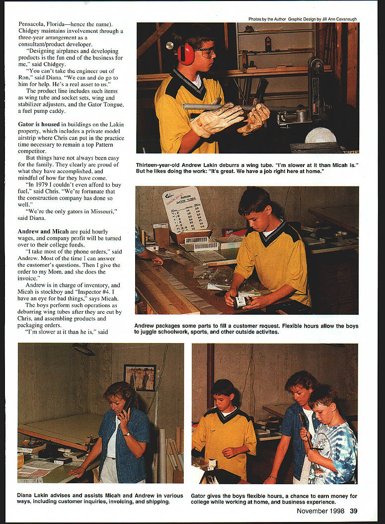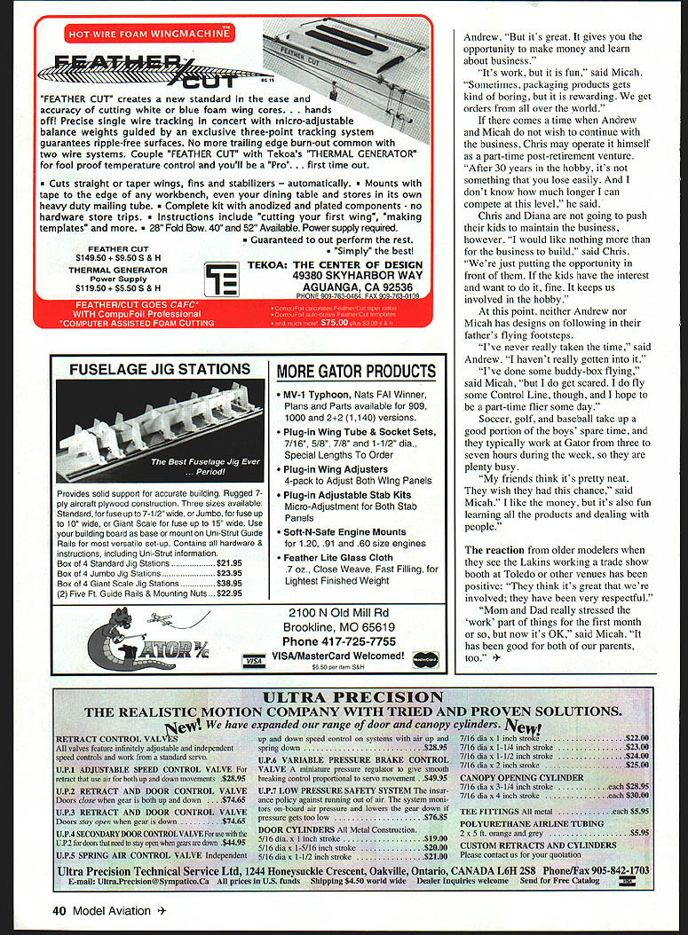 The OnI______ Gators Missouri U Jim Naught SOUTHWESTERN MISSOURI may seem unlikely spot find alligators rural community Brookline Station near Springfield headquarters Gator RC run Chris Diana Lakin sons Micah age 11 Andrew age 13 Chris familiar top-level RC Pattern competitor participant Tournament Champions Hes also owner Professional Builders construction company remodels retail stores looked side business said Chris perfect outlet kids able work home Lakins acquired Gator original proprietor Ron Chidgey wellknown Pattern flier administrator Heres Chris Lakin familiar environment preparing flight Pattern 1998 Nats finished seventh FAI class manually operated tool designed Eleven-year-old Micah Lakin cuts bag material wing tube sets Its work isby Chris father bend proper angle fun cant wait until get raise Hes also stockboy Inspector #4into Gator Tongue fuel pump caddies 38 Model Aviation OR% Pensacola Floridahence name Chidgey maintains involvement through three-year arrangement consultant/product developer Designing airplanes developing products fun end business said Chidgey cant take engineer out Ron said Diana can go him help Hes real asset us product line includes such items wing tube socket sets wing stabilizer adjusters Gator Tongue fuel pump caddy Gator housed buildings Lakin property includes private model airstrip Chris can put practice time necessary remain top Pattern competitor things have always easy family clearly proud what have accomplished mindful far have come 1979 couldnt afford buy fuel said Chris fortunate construction company has done well gators Missouri said Diana Andrew Micah paid hourly wages company profit will turned over college funds take phone orders said Andrew Most time can answer customers questions give order Mom does invoice Andrew charge inventory Micah stockboy Inspector #4 have eye bad things says Micab boys perform such operations deburring wing tubes after cut Chris assembling products packaging orders Im slower said November1998 39 Thirteen-year-old Andrew Lakin deburrs wing tube Im slower Micah likes doing work Its great have job right home Andrew packages some parts fill customer request Flexible hours allow boys juggle schoolwork sports other outside activites Diana Lakin advises assists Micah Andrew various Gator gives boys flexible hours chance earn money ways including customer inquiries invoicing shipping college working home business experience ~ATW FEATHER CUT creates new standard ease accuracy cutting white blue foam wing cores ds offl Precise single wire tracking concert micro-adjustable balance weights guided exclusive three-point tracking system guarantees ripple-free surfaces No trailing edge burn-out common two wire systems Couple FEATHER CUT Tekoas THERMAL GENERATOR fool proof temperature control youll Pro st time out Cuts straight taper wings fins stabilizers matically Mounts tape edge workbench dining table stores its own heavy duty mailing tube lete kit anodized plated components no hardware store trips ructions include cutting first wing making templates u 28 Fdd Bow 40 52 Available Power supply required Guaranteed out perform rest Simply best TEKOA THE CENTER OF DESIGN 49380 SKYHARBOR WAY 1 FEATHER CUT $14950 S & H THERMAL GENERATOR Power Supply $11950 S & H Provides solid support accurate building Rugged 7ply aircraft plywood construction Three sizes available Standard fuse up 7-1/2 wide orJumbo fuse up 10 wide Giant Scale fuse up 15 wide Use building board base mount Uni-Strut Guide Rails versatile set-up Contains hardware & instructions including Uni-Strut information Box 4 Standard Jig Stations $2195 Box 4 Jumbo Jig Stations 2395 Box 4 Giant Scale Jig Stations $3895 2 Five Ft Guide Rails & Mounting Nuts . $2295 MV-i Typhoon Nats FAI Winner Plans Parts available 909 1000 22 1140 versions Plug-in Wing Tube & Socket Sets 7/16 5/8 7/8 1-1/2 dia Special Lengths Order Plug-in Wing Adjusters 4-pack Adjust Both Wing Panels Plug-in Adjustable Stab Kits Micro-Adjustment Both Stab Panels Soft-N-Safe Engine Mounts 120 91 60 size engines Feather Lite Glass Cloth 7 oz Close Weave Fast Filling Lightest Finished Weight 2100 N Old Mill Rd Brookline MO 65619 Phone 417-725-7755 VlSAlMasterCard Welcomed VISA $6 50 per tern 5&H Andrew its great gives opportunity make money learn about business Its work fun said Micah Sometimes packaging products gets kind boring rewarding get orders over world comes time Andrew Micah wish continue business Chris may operate himself part-time post-retirement venture After 30 years hobby its something lose easily dont know much longer can compete level said Chris Diana going push kids maintain business however would like nothing business build said Chris just putting opportunity front kids have interest want fine keeps us involved hobby point neither Andrew nor Micah has designs following fathers flying footsteps Ive never really taken time said Andrew havent really gotten Ive done some buddy-box flying said Micah get scared fly some Control Line though hope pan-time flier some day Soccer golf baseball take up good portion boys spare time typically work Gator three seven hours during week plenty busy friends think its pretty neat wish chance said Micah like money its also fun learning products dealing people reaction older modelers see Lakins working trade show booth Toledo other venues has positive think its great involved have very respectful Mom Dad really stressed work part things first month now its OK said Micah has good both parents too odel Aviation 4FUSELAGE JIG STATIONS MORE GATOR PRODUCTS