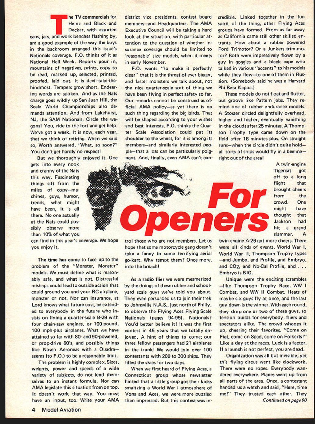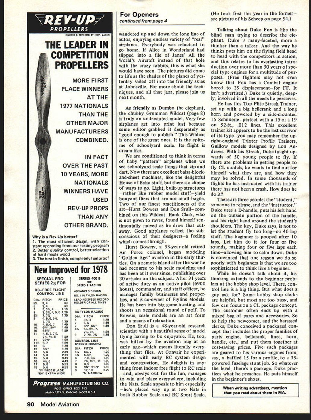 The TV commercials Heinz Black Decker assorted cans jars work benches flashing good example way boys backroom arranged issues Nationals coverage FO thinks National Hell Week Reports pour mountains negatives prints copy read marked up selected printed proofed laid out devil-take-thehindmost Tempers grow short Endear ing words spoken Nats charge goes wildly up San Juan Hill Scale World Championships also de mands attention Lakehurst NJ SAM Nationals Circle wa gonsl ride fort get help Weve got week now year think retiring said Worth answered What soon dont get hardly no respect thoroughly enjoyed gets nook cranny Nats way Fascinating things sift miles copyma chines guys humor trends what might have No actually Nats could pos sibly observe 10% what can find years coverage hope enjoy time has come face up problem Monster Monster models must define what reason ably safe what Distressful mishaps could lead outside action could ground RC airplane monster Nor can insurance Lord knows what future cost extend ed everybody future sists flying quarter-scale 8-29 four chain-saw engines 100-pound 100 mph-plus airplanes What have attained far 80- 90-powered prop-drive 60s possibly things like Nosen Aeroncas Quadra seems FO reasonable limit problem highly complex Sizes weights power speeds wide variety subjects lend selves instant formula Nor can AMA legislate situation top doesnt work way must have input too Write AMA district vice presidents contest board membersand Headquarters AMA Executive Council will taking hard look situation particular tention question whether surance coverage should limited reasonable size models meets early November FO wants make perfectly clear threat ever bigger faster monsters talk about nice quarter-scale sort thing have flying perfect safety far remarks cannot construed ficial AMA policyas yet no such thing regarding big birds will shaped according wishes best interests FO thinks Quar ter Scale Association could put its shoulder wheel among its membersand similarly interested peo plethat loss can particularly poig nant finally AMA cant control members Let us hope some motorcycle gang doesnt take fancy some terrifying aerial go-kart tempt Once breach As radio flier mesmerized doings rubber school yard scale guys weve told about persuaded us join trek Johnsville NAS just north Philly observe Flying Aces Flying Scale Nationals pages 94-95 Nationals Youd better believe first contest 45 years totally en joyed hint things come three fellow passengers 21 airplanes trunk would join over 100 contestants 200 300 ships filled skies two days first heard Flying Aces Connecticut group newsletter hinted little group got kicks smaltzing World War atmosphere Vons Aces puzzled impressed contest incredible Linked together fun spirit thing other Flying Aces groups have formed far away California came still other skilled en trants about rubber powered Ford Trimotor Junkers trim-mo tor Both impressively flown guy goggles black cape talked various accents models flewto Rus sion Somebody said Harvard Phi Beta Kappa models float flutter groove like Pattern jobs re mind rubber endurance models Stosser circled delightfully overhead higher higher eventually vanishing clouds after 25 minutes Thomp son Trophy type came down field after 18 minutes plus straight runswhen circle didnt quite hold sorts ships would fly beeline right out area twin-engine Tigercat got off long flight brought cheers crowd mighthave thought Jackson hit agrand slammer twin engine A-26 got cheers kinds events World War World War II Thompson Trophy types Jumbo Profile Embryo C02 No-Cal Profile Embryo BIG Unique exciting scrambles like Thompson Trophy Race WW Combat WW II Combat Heats maybe six guys fly once last guy down winner round drop two guys tension builds everybody fliers spectators alike crowd whoops up cheering favorites Come Fiat come Spad come Folkerts Like day races Luck factor launch perfect dead Organization invisible yet flying circus went like clockwork no ropes Everybody wan dered everywhere Planes went up parts area Once contestant handed us watch said time trusted other Continued page 90 4 Model Aviation MORE FIRST PLACE WINNERS AT THE 1977 NATIONALS THAN THE OTHER MAJOR MANUFACTURERS COMBINED IN FACT OVER THE PAST 10 YEARS MORE NATIONALS WINNERS HAVE REV-UP PROPS OTHER BRAND USED THAN ANY Rev-Up better 1 The efficient design con stant upgrading testing program 2 Better quality control better selection hard maple wood 3 The best finish completelyfuelproof New Improved 1978 SPECIAL PRO SERIES 2 FOR RCFREE FLIGHT CONTROL LINE DIA PITCHPRICE 534 93489 733%4119 833%4 59129 8%77%139 94599% 77%139 104597149 10ew 8W149 1099W159 114e77% 7A7%8159 11eEWie9 11%97199 129179 12SW179 1359239 1459279 1559349 ie4% a449 1759599 1959999 VS WIDE BLADE EW EXTRA VVIDE SERIES 400 B FOR SPEED NG ADVANCED DESIGN ND 1 IN PYLON RACING LEADING SPEED RECORD HOLDER OF ALL TIMES RC PYLON RAcING GIAPITCHPRICE 53%4129 759149 7SN eN149 e%9%9%7 7%7%189 977%7%199 CONTROL LINE 5PRRD& RACING DIA PITCHPRICE 4/9%7129 4%55%129 9788%149 77%10%11169 889189 89N 9%N189 91213229 N NARROW Openers continued page 4 wandered up down long line autos enjoying endless variety real airplanes Everybody reluctant go home Alice Wonderland slipped file Janes Worlds Aircraft instead hole crazy rabbits what would have seen pictures did come life shades planes yes terday sailed off friendly skies Johnsville about tech niques jazz please join us next month As friendly Dumbo elephant chubby Grumman Wildcat page 8 truly understated model Very few airplanes get print just because some editor grabbed desperately good enough publish Wildcat great ones epito schoolyard scale Its flight dream-like conditioned think terms baby pattern airplanes see schoolyard scale things zip dart Now excellent balsa-blockand-sheet machines like delightful House Balsa stuff choice ways go Light built-up structures rather like rubber model stuffyield bouyant fliers fragile Two finest practitioner