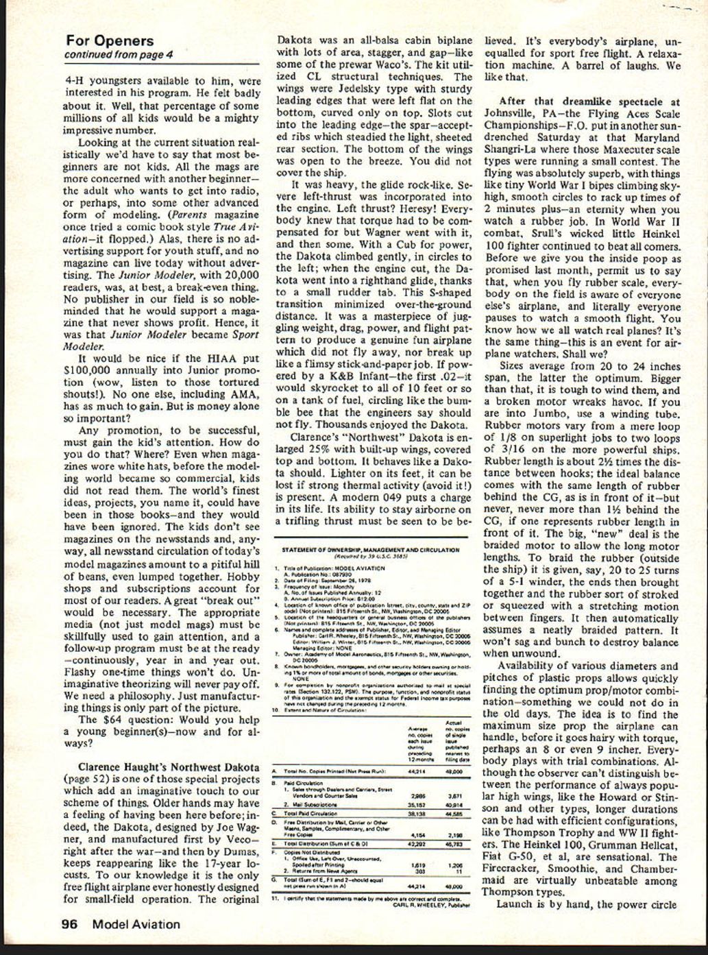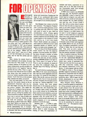 IONJEE3 Editors get glory blessed excellent writersas case Model Aviation cant help look good other peo ple keep spelling lan guage within bounds ride shotgun what everybody says never hear type setters can bring editor up short Like editor cut Bill Barnes no vel decided kill several murders gory tale came proofs printers queries green ink margins did body come read Ye ed eliminated murder right five crimes six bodies Now among people found masthead art editor rates film credit An art ed always tolerant editor nec essary nuisance editor fancies graphics de termine box office germ truth first admit things have looking up ever since resident graphics doctor came aboard Youll find him contents pagebeneath editor course have noted FO has new soap box month thanks art departments discontent mat lingers too long picture tooken reason coming out hiding con stantly confused Join Worth heard guy telling buddies Worth found airplane Being Johns stunt man idea peace quite much too chicken leap off roofs precipices people kept asking us about eyes Before found out FO tended think old mans sternly admonishing him triumph art ed just informed us belonged Salvador Dali cant have melting servos transmitters flowing over edges workbench Wed better sign thing too before other horrors wrought pristine presence Ken Simpson see Letters Edi tor considers Beginner Problem sensitive insight gained actual ly working kids FO agrees what says considerations mitigate against manufacturer simply saying will produce beginner kits thereby make great impact numbers young sters coming up isnt simple Theres doubt whether product itself makes difference since takes leadershippeople teachers spirersto make Junior programs e days Wright brothers model aviation has beginner problem may wander hobby has grown through number cycles created revolutions technology witness ROand may told comprise perhaps 2000000 people ages day guess good also stimulus events timeslike Lindberghs flight Golden Age Air Racing World War II wont mind saying prob ably 90% active hobbyists read model magazines alive FO glued first sticks gether May ask first beginners profici ent now Probably strongest motive have helping beginners altruistic instinct people should share pleasures find hobbybut should wish Though goes unsaid probably much moved feeling could modelers feeling guilt people especially kids turned off failure come up continuous suc cessful programs producing products work magic Simpson said really serious AMA began what visibly serious about good insurance making rules organization contests teams supervision re cords want service innumerable needs strongly feel about beginners AMA spend say $100000 30 years ago Plymouth program cost $250000 year year na tional beginner programone real flesh boneswould holla about dues increase AMA members may say sure Ill give buck year will mutter comes times foot bill beginner pro gram other program however es sential Nowhere does say ginner Program AMA mission want Judging apparent apathy clubs real doubt about people consider vital aspect AMA activity have beginner programs past some well organized funded Before war Rocke feller Foundation maintained suite offices Radio City just pur pose came up series graduated kitsone cannot demonstrate obvious approach effective fact could bad Hob Industry Association America af ter war appropriated $30000 study universityone recommen dation series graduated kits Testors firm act upon four control-line models called Freshman Sophomore Junior Senior program effect FO failed notice old Ameri can Boy magazine vanished Great Depression cooperated AMLA Airplane Model League America publishing plans AMLA began Na tionals perpetuated own AMA focused boys men Stray thoughts swarm Whatever done must first appeal imagination thing someone would want to gain pleasure cannot form ally teach lay down compulsory steps based upon some outdated struggles getting started different world Thus cant expect legislate ar bitrary Junior program would have people willing carry out present seems wed like some something Juniorspro vided isnt us apparent major ity modelers kids will build model airplanes Simpson noted 2A% Continued page 96 4 Model Aviation Openers continued page 4 4-H youngsters available him interested program felt badly about Well percentage some millions kids would mighty impressive number Looking current situation real istically wed have say ginners kids mags concerned another beginner adult wants get radio perhaps some other advanced form modeling Parents magazine once tried comic book style True Avi ationit flopped Alas no ad vertising support youth stuff no magazine can live today adver tising Junior Modeler 20000 readers best break-even thing No publisher field nobleminded would support maga zine never shows profit Hence Junior Modeler became Sport Modeler would nice HIAA put $100000 annually Junior promo tion wow listen tortured shouts No else including AMA has much gain money alone important Any promotion successful must gain kids attention maga zines wore white hats before model ing world became commercial kids did read worlds finest ideas projects name could have booksand would have ignored kids dont see magazines newsstands way newsstand circulation todays model magazines amount pitiful hill beans lumped together Hobby shops subscriptions account readers great break out would necessary appropriate media just model mags must skillfully used gain attention follow-up program must ready continuously year year out Flashy one-time things wont Un imaginative theorizing will never pay off need philosophy Just manufactur ing things part picture $64 question Would help young beginnersnow al ways Clarence Haughts Northwest Dakota page 52 special projects add imaginative touch scheme things Older hands may have feeling having beforein deed Dakota designed Joe Wag ner manufactured first Veco right after warand Dumas keeps reappearing like 17-year lo custs knowledge free fli