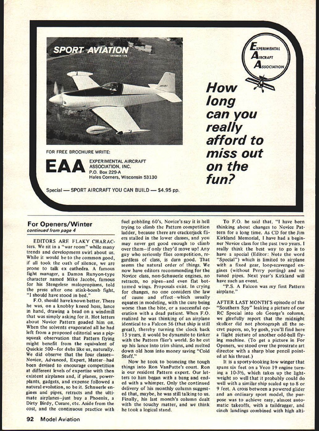 FORLEE3 Photography never strong suit would feel alone crowd Swahili intalk about lens films exposures breeds empathy Biblical hermits lived desert caves first exposure honest-to-good ness pro late great Rudy Ar nold work appeared regularly national magazine covers newspapers field old Air Trails covers centerspreads air-to-air shots AT mind-blowing wing tip P-40 stuck eye resorted Zoom cropped print got close Standby days old Speed Graphic todays older pros light up whenever mentioned Rudy went back days magnesium flares lighting stuff tabloids held trough-like tray overhead hand powdered magnesium went off great whoof blinding light frightening cloud smoke ear sewed back after jar went off hand minus two fingers same occupational haz ard now have motor drive can take five pictures second enough hairy dog stories top months agenda lead articlewith pictures can bring tears eye author Monty Groves puts Practically everybody takes pic tures days natural question cant get decent shots models Montys spectacular action shotsmostly taken beautiful Morgan Hill scale meetshave filled pages pages model mags own backyard John Preston makes seem easy falling off log snap takeoffs flybys landings hypnotize viewer us would love have such pictures us try take thembut results run indifferent bad ponder realize virtually almost 1300 AMA chartered clubs least photographer could serve func tion Encourage him hell love Just see out pocket service mankind missing technique perfected men like Groves Preston So asked Monty tell us does include some hand-picked samples illustrate glories no-nos poor picture Montys eyes could wall mural living room now look forward great pic tures magazine articles have camera Monty telling does can learn too learned fly ailerons didnt together now Cheese THE MAGAZINE YOU HOLD hands commonplace object end product world never see lastinglike engineto used over over like fuelbut has read cover cover scanned riffled through can hope saved perhaps reference hopefully because sense intrinsic value editors level relief labor 30 days goes off printer sees picture no means panorama sees rack upon rack material piles layouts reams copy people rush ing aboutas devil after looks upstream theres glimpse tributaries river information vanishing over hori zon An editor awed quantity material boils down pretty package words pictures can bought store like box oatmeal loaf bread What doing patient reader getting ready George Clapp does deal blithely monumental guys like George Like people synthesize years work what perceive soeasy-to-read printed page George virtual computer bank specialty pursuit history re lates given aircraft type world revolves around Fokker Tn Motors Fairchild FCssee page 54 remark able RC Fokker Model Builder has donated AMAs some day museumalong John Kikers Owen Morris NASA-Houston RC flying test model 747 mated Space Shuttle Andy Shebers onethird scale Pitts etc George starting another Fokker variant Like FO watched first Colo nial Airways Fokkers later Fairchilds fly overhead what guess Newark Montreal run though George saw about hour before after did depending way classics heading spent dozen years researching Fairchild drew himself issue Oldtimers Fairchild museums abroad have verified detailthough modestly says isnt perfect year now George has phone sometimes several times week office home letters fill thick folderwitness coral-reef-building process turning out accurate job best hu man can George fought lit tle thingeven wording plan done early factory draw ing drawing see practically computer enhanced long series steps took produce nice print what really rough pen cil Dont ask us months arti cle plan appetizer Next month its glory George presents greatest ever RC scale pro jects two huge drawingsthe Fair child FC-2 reason FO survived years head-to-head perfection ist George own great love Fairchild built rubberfrom 36 inches six feetand performance truly superb tunate have miracle modern reliable radio put such dreams majestically sky So FO awed sum total individual efforts add up package like humble March sue Consider Fred Pearce rubber Kuhnles work autogiro etc man-years work things What holding pinheadupon angels have danced Continued page 92 4 Model Aviation FOR FREE BROCHURE WRITE EXPERIMENTAL AIRCRAFT ASSOCIATION INC PO Box 229-A Hales Corners Wisconsin 53130 EAA aI T Al RCRAFT YOU CAN BUILD$495 pp XPERIMENI E AIRCRAFT ASSOCIATION long can really afford miss out fun Openers/Winter continued page 4 EDITORS ARE FLAKY CHARAC ters sit war room trends developmens swirl about us would common good took oath silence prone talk ex cathedra famous fight manager Damon Runyon-type character named Mike Jacobs famous Stengelese malopropisms told press after stink-bomb fight should have stood bed FO should have known better knobby kneed hoss lance hand drawing bead windmill simply asking Hot letters about Novice Pattern goaded him solvents evaporated left proposed editorial pipsqueak observation Pattern flying might benefit equivalent Quickie 500for dubs like us naturally did observe four classes Novice Advanced Expert Masterhad devised encourage competition different levels expertise existent airplanes planes powerplants gadgets expense followed natural evolution Schnuerle en gines pipes retracts ulti mate airplanesjust buy Phoenix Dirty Birdy Curare etc Aside cost continuous practice fuel gobbling 60s Novices say hell trying climb Pattern competition ladder because crackerjack fli ers stalled lower classes may never get good enough climb over themif theyd move up Any guy seriously flies competition re gardless class darn good seems natural order things now have editors recommending Novice class non-Schnuerle engines no retracts no pipesand flat bot tomed wings Proposals exist crying changes no considers law cause effectwhich usually equates modeling cure being worse bite successful op eration dead patient FO realized thinking airplane identical Falcon 56 ship still great t