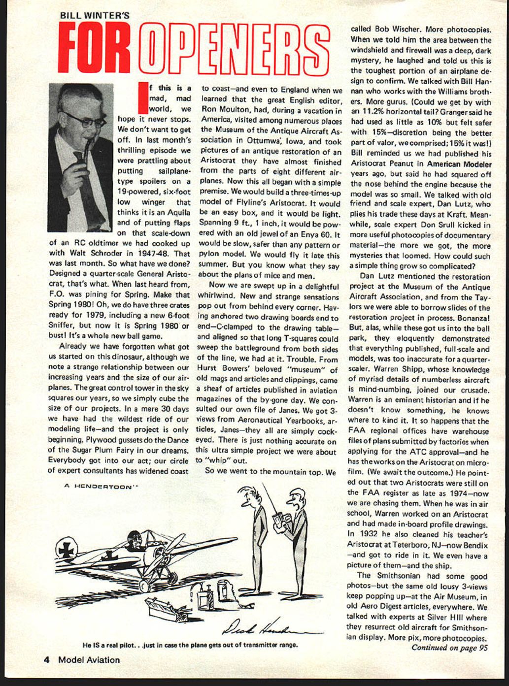 BILL WINTERS ION LLE3 mad mad world hope never stops dont want get off last months thrilling episode prattling about putting sailplanetype spoilers 19-powered six-foot low winger thinks Aquila putting flaps scale-down RC oldtimer cooked up Walt Schroder 1 947-48 last month So what have done Designed quarter-scale General Aristo crat thats what last heard FO pining Spring Make Spring 1980 Oh have three crates ready 1979 including new 6-foot Sniffer now Spring 1980 bust Its whole new ball game Already have forgotten what got us started dinosaur although note strange relationship between increasing years size air planes great control tower sky squares years simply cube size projects mere 30 days have wildest ride modeling lifeand project beginning Plywood gussets Dance Sugar Plum Fairy dreams Everybody got act circle expert consultants has widened coast coastand England learned great English editor Ron Moulton during vacation America visited among numerous places Museum Antique Aircraft As sociation Ottumwa Iowa took pictures antique restoration Aristocrat have almost finished parts eight different air planes Now began simple premise would build three-times-up model Flylines Aristocrat would easy box would light Spanning 9 ft 1 inch would pow ered old jewel Enya 60 would slow safer pattern pylon model would fly late summer know what say about plans mice men Now swept up delightful whirlwind New strange sensations pop out behind corner Hav ing anchored two drawing boards end endC-clamped drawing table aligned long T-squares could sweep battleground both sides line Trouble Hurst Bowers beloved museum old mags articles clippings came sheaf articles published aviation magazines by-gone day con sulted own file Janes got 3views Aeronautical Yearbooks ar ticles Janesthey simply cock eyed just nothing accurate ultra simple project about whip out So went mountain top called Bob Wischer photocopies told him area between windshield firewall deep dark mystery laughed told us toughest portion airplane de sign confirm talked Bill Hannan works Williams broth ers gurus Could get 112% horizontal tail Granger said used little 10% felt safer 15%discretion being better part valor comprised15% Bill reminded us published Aristocrat Peanut American Modeler years ago said squared off nose behind engine because model small talked old friend scale expert Dan Lutz plies trade days Kraft Mean scale expert Don Srull kicked useful photocopies documentary materialthe got mysteries loomed could such simple thing grow complicated Dan Lutz mentioned restoration project Museum Antique Aircraft Association Tay lors able borrow slides restoration project process Bonanza alas got us ball park eloquently demonstrated everything published full-scale models too inaccurate fora quarterscaler Warren Shipp knowledge myriad details numberless aircraft mind-numbing joined crusade Warren eminent historian doesnt know something knows kind happens FAA regional offices have warehouse files plans submitted factories applying ATO approvaland has works Aristocrat micro film await outcome point ed out two Aristocrats still FAA register late 1974now chasing air school Warren worked Aristocrat made in-board profile drawings 1932 also cleaned teachers Aristocrat Teterboro NJnow Bendix got ride have picture themand ship Smithsonian some good photosbut same old lousy 3-views keep popping upat Air Museum old Aero Digest articles everywhere talked experts Silver Hill resurrect old aircraft Smithson ian display pix photocopies Continued page 95 4 Model Aviation HENDERTODN ISa real pilot iust case plane gets out transmitter range FOR THE SOARING BUFF supertape applies stickey brushing masking Its stronger typical R/C building material lt weighs 1 gin per sq ft building area lts 0005 thick Its ready instant apply Sits quickest efficient method applying balsa greenskin other skin foam wing cores Plus dozens other great uses Try 3/8roll $479 1roli $795 2roIl $1595 ALL ROLLS ARE 2160 LONG SUPERWINGS superwings Portfolio Everything need know create own super-performance sailplane completely illustrated difinative work 20 pages packed technical data charts diagrams step-bystep instructions million $ worth information interested obtaining winning edge sailplane performance Hi Johnson Only $150 11015 Glenoaks Blvd Pacoima CA 91331 Tel 12131 8994312J Openers/Winter continued page 4 Over Don Srulls drawing table big homemade projector Finally opted two best looking draw ings scaled side view size multiplied 5 would give us model profile Another drawing scaled multiplication 8this planform Srull Bowers old wizard Ned Kragness bull session us during projected color slides Antique Aircraft Museum Ned explained tube nut bolt weve whipping out sheets drawings cross sections started over three times What now trying to freeze reason able level scalethis Sport Scale modeland crate has flown crank numerous minute cor rections final drawing Everyone has advice ought scale exhaust etcyou know Ned wants us build up Warren Truss ribs little ply gussets eyes roll said would cov ered painted would know what inside absolutely horrified Come fel lows wanted nice crate fly no competition just long does exhibit visual errors Now know what scale guys go through documentation begins insidiously builds builds like anvil-head thunderstorm Research becomes game itself fascinating enjoyable tend forget model Research unveiled hobby itself within could enjoy life time hobby uncontrolled documenta tion single design single airplane What license numbers ship building Which varia tion really copying find stringers no knew about nobody shows drawing Longerons shown curved drawing engineer types tell us thats no-nothat steel tube never bowed because its compression strength would shot darn wheeis 7 inches have make supposed fun project So well put Williams biggest6 inches maybe replace later big gest Williams cylinders e Gnome rotary make 7cylinder Warner out Now Fox 78 extension shaft mount 