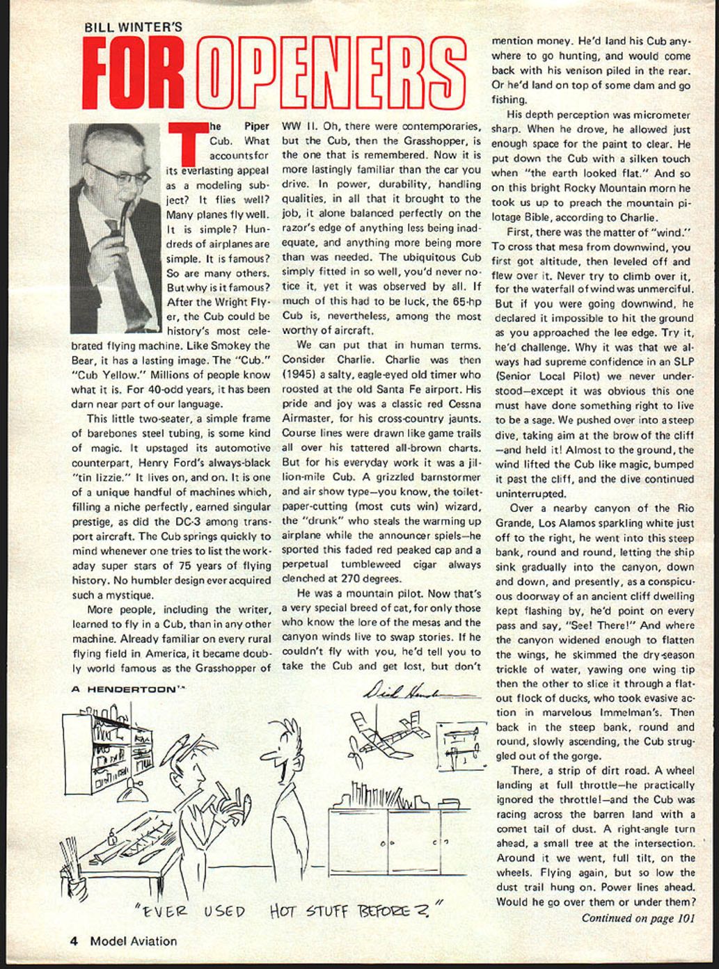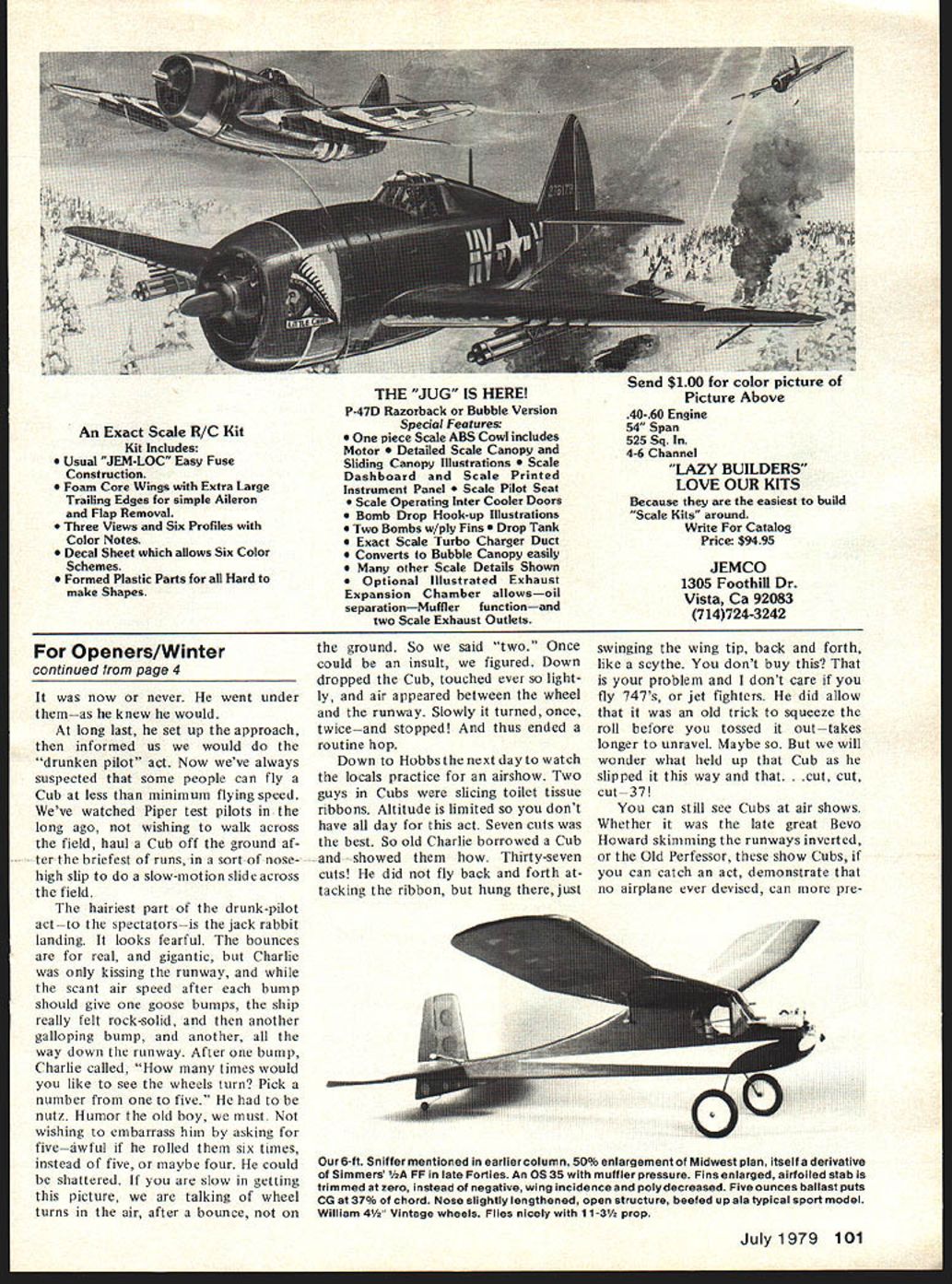 BILL WINTERS ION LILE3 Piper Cub What acco unts its everlasting appeal modeling sub ject flies well planes fly well simple Hun dreds airplanes simple famous So others famous After Wright Fly er Cub could historys cele brated flying machine Like Smokey Bear has lasting image Cub Cub Yellow Millions people know what 40-odd years has darn near part language little two-seater simple frame barebones steel tubing some kind magic upstaged its automotive counterpart Henry Fords always-black tin lizzie lives on unique handful machines filling niche perfectly earned singular prestige did DC-3 among trans port aircraft Cub springs quickly mind whenever tries list work aday super stars 75 years flying history No humbler design ever acquired such mystique people including writer learned fly Cub other machine Already familiar rural flying field America became doub ly world famous Grasshopper WW II Oh contemporaries Cub Grasshopper remembered Now lastingly familiar car drive power durability handling qualities brought job alone balanced perfectly razors edge anything less being inad equate anything being needed ubiquitous Cub simply fitted well youd never no tice yet observed much luck 65-hp Cub nevertheless among worthy aircraft can put human terms Consider Charlie Charlie 1945 salty eagle-eyed old timer roosted old Santa Fe airport pride joy classic red Cessna Airmaster cross-country jaunts Course lines drawn like game trails over tattered all-brown charts everyday work jil lion-mile Cub grizzled barnstormer air show typeyou know toiletpaper-cutting cuts win wizard drunk steals warming up airplane announcer spielshe sported faded red peaked cap perpetual tumbleweed cigar always clenched 270 degrees mountain pilot Now thats very special breed cat know lore mesas canyon winds live swap stories couldnt fly hed tell take Cub get lost dont 0 Cl- mention money Hed land Cub go hunting would come back venison piled rear hed land top some dam go fishing depth perception micrometer sharp drove allowed just enough space paint clear put down Cub silken touch earth looked flat bright Rocky Mountain morn took us up preach mountain pi lotage Bible according Charlie First matter wind cross mesa downwind first got altitude leveled off flew over Never try climb over waterfall wind unmerciful going downwind declared impossible hit ground approached lee edge Try hed challenge al ways supreme confidence SLP Senior Local Pilot never under stoodexcept obvious must have done something right live sage pushed over steep dive taking aim brow cliff held Almost ground wind lifted Cub like magic bumped past cliff dive continued uninterrupted Over nearby canyon Rio Grande Los Alamos sparkling white just off right went steep bank round round letting ship sink gradually canyon down down presently conspicu ous doorway ancient cliff dwelling kept flashing hed point pass say See canyon widened enough flatten wings skimmed dry-season trickle water yawing wing tip other slice through flatout flock ducks took evasive ac tion marvelous Immelmans back steep bank round round slowly ascending Cub strug gled out gorge strip dirt road wheel landing full throttlehe practically ignored throttle Iand Cub racing across barren land comet tail dust right-angle turn ahead small tree intersection Around went full tilt wheels Flying again low dust trail hung Power lines ahead Would go over under Continued page 101 4 Model Aviation HENDERTOON -/ 4 THE JUG IS HERE P-47D Razorback Bubble Version Special Features piece Scale ABS Cowl includes Motor e Detailed Scale Canopy Sliding Canopy Illustrations e Dashboard Scale Printed Instrument Panel e Pilot Seat Scale Operating Inter Cooler Doors Bomb Drop Hook-up Illustrations Bombs w/ply Fins Tank Exact Scale Turbo Charger Duct Converts Bubble Canopy easily other Scale Details Shown Optional Illustrated Exhaust Expansion Chamber allowsoil separationMuffler functionand two Scale Exhaust Outlets JEMCO 1305 Foothill Dr Vista Ca 92083 714724-3242 Openers/Winter continued page 4 now never went under themas knew would long last set up approach informed us would drunken pilot act Now weve always suspected some people can fly Cub less minimum flying speed Weve watched Piper test pilots long ago wishing walk across field haul Cub off ground af ground So said two Once could insult figured Down dropped Cub touched ever light ly air appeared between wheel runway Slowly turned once twiceand stopped thus ended routine hop Down Hobbsthe next day watch locals practice airshow Two guys Cubs slicing toilet tissue ribbons Altitude limited dont have day act Seven cuts best So old Charlie borrowed Cub ter briefest runs sort nose-and showed Thirty-seven high slip slow-motion slide acrosscuts did fly back forth atthe fieldtacking ribbon hung just hairiest part drunk-pilot actto spectatorsis jack rabbit landing looks fearful bounces real gigantic Charlie kissing runway scant air speed after bump should give goose bumps ship really felt rock-solid another galloping bump another way down runway After bump Charlie called times would like see wheels turn Pick number five nutz Humor old boy must wishing embarrass him asking fiveiwful rolled six times instead five maybe four could shattered slow getting picture talking wheel turns air after bounce swinging wing tip back forth like scythe dont buy problem dont care fly 747s jet fighters did allow old trick squeeze roll before tossed outtakes longer unravel Maybe will wonder what held up Cub slipped way cut cut37 can still see Cubs air shows Whether late great Bevo Howard skimming runways inverted Old Perfessor show Cubs can catch act demonstrate no airplane ever devised can pre 6-ft Sniffer mentioned earlier column 50% enlargement Midwest plan itself derivative Simmers hA FF late Forties An 0S35 muffler pressure Fins enlarged airfoiled stab trimmed zero instead negative wing incidence poly decreased Five ounces ballast puts CG 37% chord Nose slightly lengthened open structure beefed up ala ty