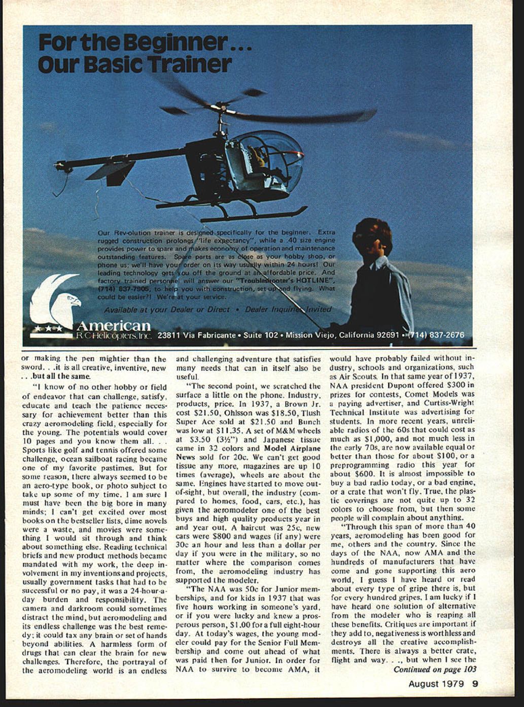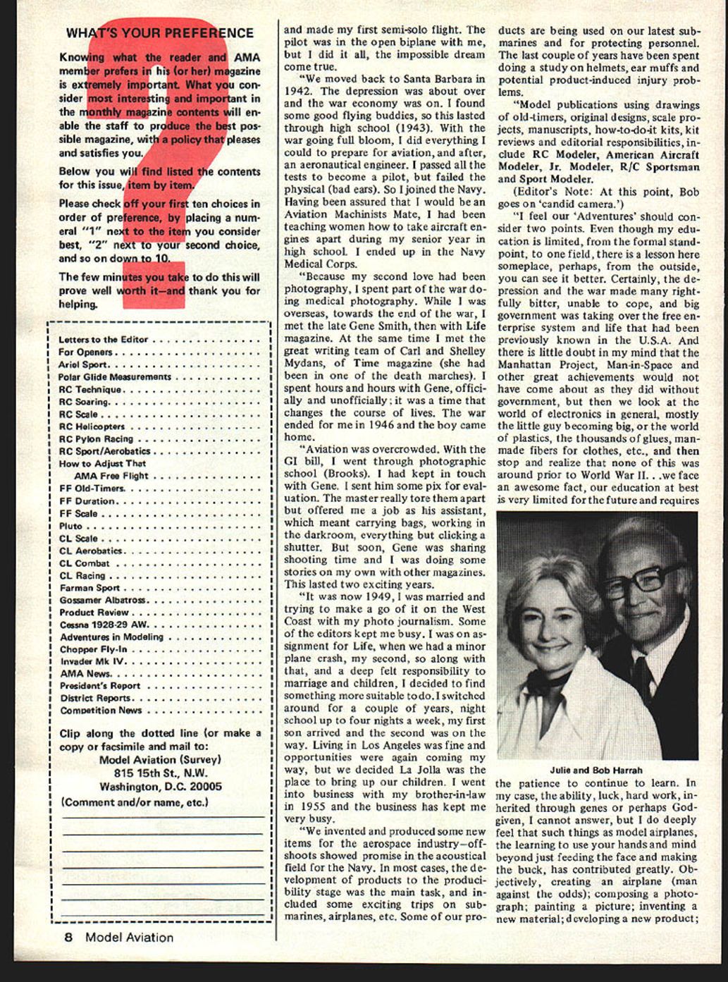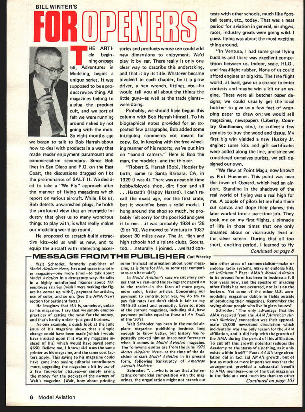 BILL WINTERS FOREEIEI3 THE ARTi cle begin ning page 56 Adventures Modeling begins unique series supposed pro duct review thing magazines belong plug -the product cult sort felt running around naked going mob So eight months ago began talk Bob Harrah about deal products way made reader enjoyment paramount commercialism secondary Since Bob lives San Diego FO East Coast discussions dragged like preliminaries SALT II Wedecid ed take Fly approach after manner flying magazines report various aircraft like us Bob detests unvarnished plugs holds profound view energetic dustry gives us wondrous things play what really makes modeling world go round proposed scratch-build attrac tive kitsold well new equip aircraft interesting acces sories products use could add new dimensions enjoyment Wed play ear really clear way describe undertaking its title Whatever became involved chapter glow driver hex wrench fittings etche would tell about things little guysas well trade giants doing Probably should have begun column Bob Harrah himself biographical notes provided ex pected few paragraphs Bob added some intriguing comments meant copy So keeping free-wheel ing manner reports weve put him candid camera Bob man modelerand thinker Robert S Harrah Bob Hoosier birth came Santa Barbara CA 1929 4 neat old-time hobby/bicycle shop dirt floor Hazards Happy Hazard cant re call exact age nor first crate wouldve solid model hung around shop much pro bably felt sorry poor kid gave ably 1934 35 9 10 moved Ventura 1937 about 30 miles away Jr High high schools airplane clubs Scouts too rally joined ESSAGE FROM THE PUBLISHER Carl Wheeley Walt Schroder formerly publisher Model Airplane News has used space anoth er magazineone timelto talk about Model Aviation derogatory way talks highly uninformed manner about MA employee salaries wish making fig ure comes up payment articles use color See AMA News section pertinent facts imagines MA somehow unfair magazine say simply employ practices getting the money thats hardly unfairjust good business As example quick look June issue magazine shows simple change could have made would have insisted upon magazine stead would have saved some $650 Believe know MA uses same printer magazine same cost fac tors apply saving magazine could have gone paying editorial contributors upgrading magazine bit use few four-color picturesor simply saving money pockets owners Walts magazine Walt about printing some financial information about maga zine done MAso some real compari sons can made Model Aviations case cut cor ner canand savings passed readerin form pages color better articles Concerning payment contributors yes try pay fair rates dont think fair pay 1945-50 rates promptly current magazines including MA have payment policies equal Air Trails 50s Walt Schroder has model air plane magazine publishing business long enough know better history has re peatedly proved him inaccurate forecaster comes Model viation magazine following quotes June 1975 Model Airplane Newsat time de cision start Model Aviation its present form following bankruptcy American Aircraft Modeler Schroder after en tering commercial competition mag azines organization might branch out tests other schools much like foot ball teams etc today neat period aviation general air shgws races industry greats going wild guess flying about exciting thing around Ventura some great flying buddies excellent compe tition between us Indoor scale HLG free-flight rubber None us could afford engines big kits free flight world least gave us chance enter contests maybe win kit en gine butcher paper de signs could usually get local butcher give us few feet wrap ping paper draw would sell magazines newspapers Liberty Coun try Gentleman etc collect few pennies buy wood tissue first big win yielded new Huskey Jr engine some kits gift certificates added along line since considered ourselves purists still de signed own flew Point Magu now known Port Hueneme point near town Oxnard air port Standing shadows real world flying real high couple pilots let help cut canvas dope planes later worked part-time job took first flights pinnacle life times dreamed about vicariously lived silver screen During too short exciting period learned fly Continued page 8 other areas commercialismmake endorse radio systems make endorse kits ad infinitum Fact AMAs Model Aviation its present form has business full four years now spectre invading other fields has occurred nor horizon Yet some other US aero modeling magazines dabble fields outside producing magazines Remember saying about people live glass houses Schroder advantage AMA received AAM [American Air craft Modeler] connection approxi mate 25000 newsstand circulation incidentally reason AAM affiliation did help growth AMA during period affiliation cut off growth potential reduces Academy status nothing exists within itself Fact AAMs large circu lation did fact aid AMAs growth just much importance arrangement provided substantial benefit AMA membersone best magazines field cost much less other Continued page 103 6 Model Aviation Letters Editor Openers Ariel Sport Polar Glide Measurements RC Technique RC Soaring RC Scale RC Helicopters RC Pylon Racing RC Sport/Aerobatics Adjust AMA Free Flight FF Old-Timers FF Duration FF Scale Pluto CL Scale CL Aerobatics CL Combat CL Racing Farman Sport Gossamer Albatross Product Review Cessna 192829 AW Adventures Modeling Chopper Fly-In Invader Mk IV AMA News Presidents Report District Reports Competition News Clip along dotted line make copy facsimile mail Model Aviation Survey 815 15th St NW Washington DC 20005 Comment and/or name etc 8 Model Aviation made first semi-solo flight pilot open biplane did impossible dream come true moved back Santa Barbara 1942 depression about over war economy found some good flying buddies lasted through high school 1943 war going full bloom did everything could prepare aviation after aeronautical engineer passed tests become pilot failed physical bad ears