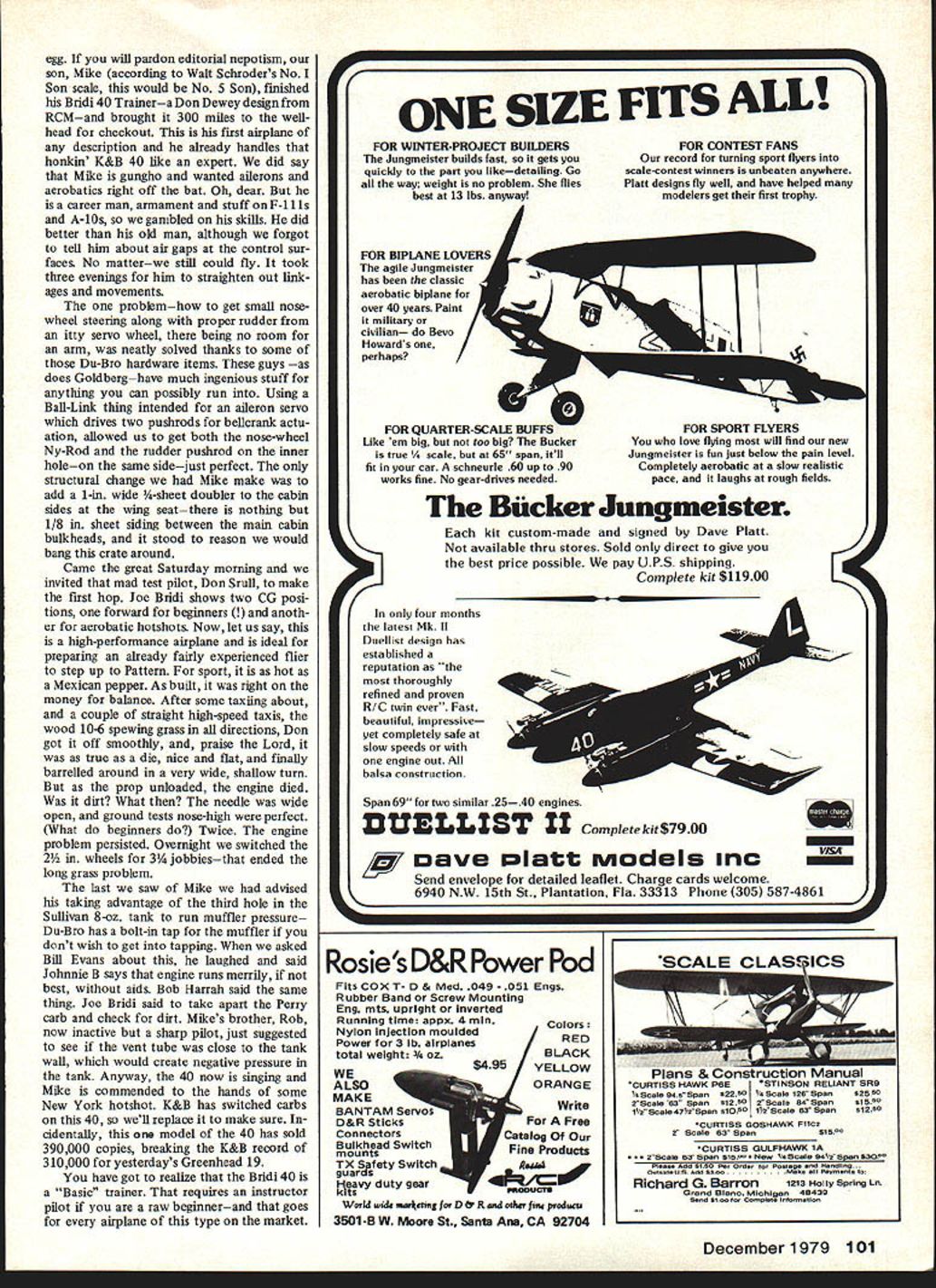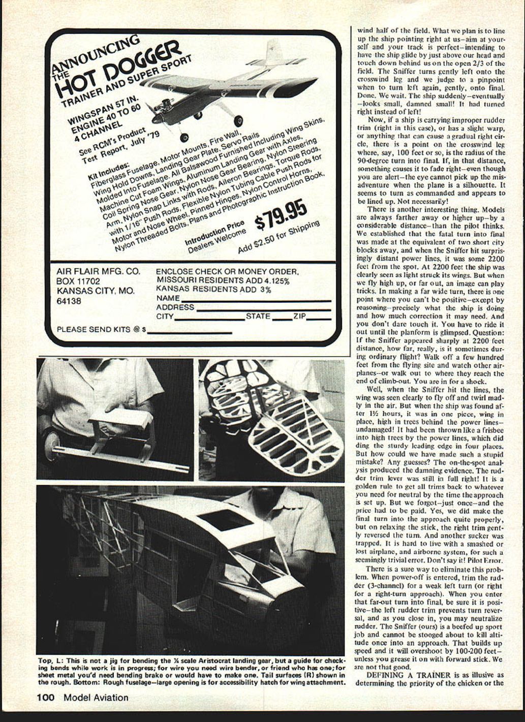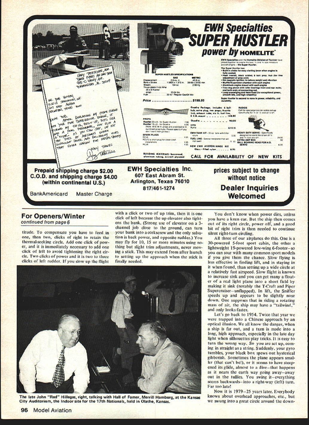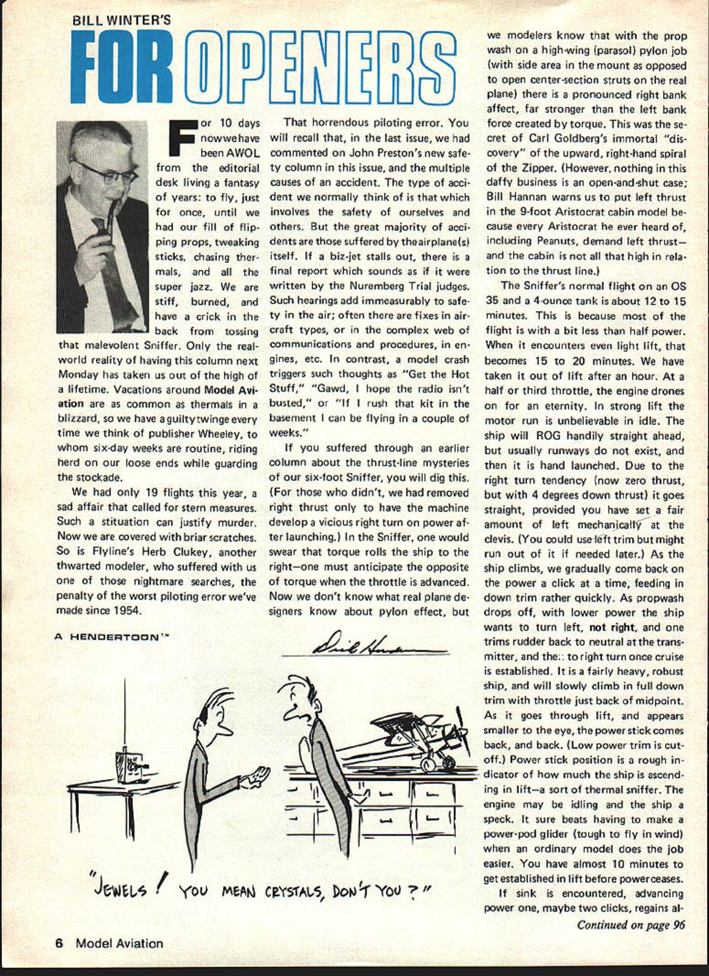 BILL WINTERS IONIIE3 10 days nowwe have AWOL editorial desk living fantasy years fly just once until fill flip ping props tweaking sticks chasing ther mals super jazz stiff burned have crick back tossing malevolent Sniffer Only realworld reality having column next Monday has taken us out high lifetime Vacations around Model Avi ation common thermals blizzard have aguiltytwinge time think publisher Wheeley six-day weeks routine riding herd loose ends guarding stockade 19 flights year sad affair called stern measures Such stituation can justify murder Now covered briar scratches So Flyines Herb Clukey another thwarted modeler suffered us nightmare searches penalty worst piloting error weve made since 1954 HENDESqTOON horrendous piloting error will recall last issue commented John Prestons new safe ty column issue multiple causes accident type acci dent normally think involves safety ourselves others great majority acci dents suffered theairplanes itself biz-jet stalls out final report sounds written Nuremberg Trial judges Such hearings add immeasurably safe ty air often fixes air craft types complex web communications procedures en gines etc contrast model crash triggers such thoughts Get Hot Stuff Gawd hope radio isnt busted rush kit basement can flying couple weeks suffered through earlier column about thrust-line mysteries six-foot Sniffer will dig didnt removed right thrust have machine develop vicious right turn power af ter launching Sniffer would swear torque rolls ship rightone must anticipate opposite torque throttle advanced Now dont know what real plane de signers know about pylon effect nrF tT2 JtjL5 / MA CYS1A16 1o ~l lers know prop wash high-wing parasol pylon job side area mount opposed open center-section struts real plane pronounced right bank affect far stronger left bank force created torque se cret Carl Goldbergs immortal dis covery upward right-hand spiral Zipper However nothing daffy business open-and-shut case Bill Hannan warns us put left thrust 9-foot Aristocrat cabin model cause Aristocrat ever heard including Peanuts demand left thrust cabin high rela tion thrust line Sniffers normal flight OS 35 4-ounce tank about l2to 15 minutes because flight bit less half power encounters light lift becomes 15 20 minutes have taken out lift after hour half third throttle engine drones eternity strong lift motor run unbelievable idle ship will ROG handily straight ahead usually runways exist hand launched Due right turn tendency now zero thrust 4 degrees down thrust goes straight provided have set fair amount left mechanjcatljat clevis could use-lift trim might run out needed later As ship climbs gradually come back power click time feeding down trim rather quickly As propwash drops off lower power ship wants turn left right trims rudder back neutral trans mitter right turn once cruise established fairly heavy robust ship will slowly climb full down trim throttle just back midpoint As goes through lift appears smaller eye power stick comes back back Low power trim cut off Power stick position rough dicator much ship ascend ing lifta sort thermal sniffer engine may idling ship speck sure beats having make power-pod glider tough fly wind ordinary model does job easier have almost 10 minutes get established lift before powerceases sink encountered advancing power maybe two clicks regains al Continued page 96 6 Model Aviation qs-cu3 A5ao9 Ce *y550 C hJV 1t1 $ Prepaid s ipping charge $200 COD shipping charge $400 within continental US BankAmericard Master Charge power D HOMELITE EW potOloision 01 TuxI onnae 4tcaflellgn0 1110 Sup gush Thu Sup Oustlo has Sulit cook ssy stalling moon mhn glns tulip nuotudi LIFER MUSTIER SPECIFICATIONS001 Irsalud bisnA onidsd S boil prop hub br tin OAR 507010 sdjotmoI 01 pop 000 OtsoMcunun u 420cc No nagnoto ignition duoo 051591 nd vibration 50, 51SU 5 1375 3909 3492 AnAl UutliriEupnsioo ohumbr 0th ngin Wuight 0k 29559 Aluminum snin mount aoh 0gm Thust i0-7i00 RPM-TWO dng piston wIth oii buarings tront u mOm 200 HUSIA both sndsot nonnonting rod 01091 4 ho-Loop soarottging ond Immihoad iloro0ptlu,ai powor Funi20101 neatia Gonflht U, smooth dl. high rsiiabllitoi SOPOr 0011 IS 502004 tO noon POW0 fstlabliity sod Price 19995durublilty Coodris Ponlisgo toolodo boilRASIOS Huh 0015 piom wo P1595 throlti Call pco etices adtns sot-up ink uhsuot tuho oio toi ho PAnitcally tot I Stat a, 01011 PROPS Naults 208- CI SuCOt ItuStlet Ousdrs 00 guotta 150 CI OsuOtO - 695 KiTS ISO, CII C W 0 pCp1ute CtO0ttlld tO ItPuma- OutS bOlt PlOt fluSh PIunnpncty 4001 cont Ttmdttla IEW TUNE KiT -330 antto luteHEAVY SUTY SERVO Spectically SPANS PLUOSclunk- - 395aengnedtostandtflOttun 01 OCunt Cand Vszeuitnatt2995 OCJ7Jasnot plug tot ctos CCCI - FUEL LiNE SPout, flCPlC Intl Colt EXTRA AMP BOX o SuplI t s 5AU SEARING EAO FOR 110 CCJB195 NEW OWN AILERON RiNGS OilSORVO - nCn Gis5 lilsd ripion095 SUILOING idAPERiAIS boos00 sinorioun ohtro sirorsit pipttoCALL EWH Specialties Inc 607 East Abram St Arlington Texas 76010 817/461-1274 prices subject change notice Dealer Inquiries Welcomed Openers/Winter continued page 6 titude compensate have feed two clicks right retain thermal-seeking circle Add click pow er immediately necessary add click left avoid tightening right cir cle Two clicks power two three clicks left rudder slow up flight click two up trim click left because up elevator also tight ens bank Strong use elevator 3channel job close ground can turn bank corkscrew salva tion back power opposite rudder may fly 15 minutes using no thing slight trim adjustments never mov ing stick may extend after launch setting up approach stick finally needed dont know power dies unless have keen ear ship comes out its right circle power off good bit right trim needed continue silent right-turn circling three airplanes 30-powered 5-foot sport cabin other lightweight 19-powered low-wing 6-footerso can soar common sport models give chance Slow flying less effective finding lift staying found setting up w