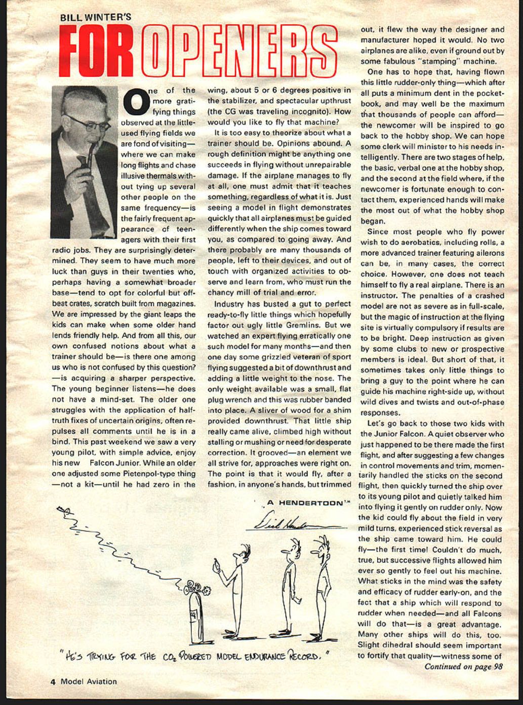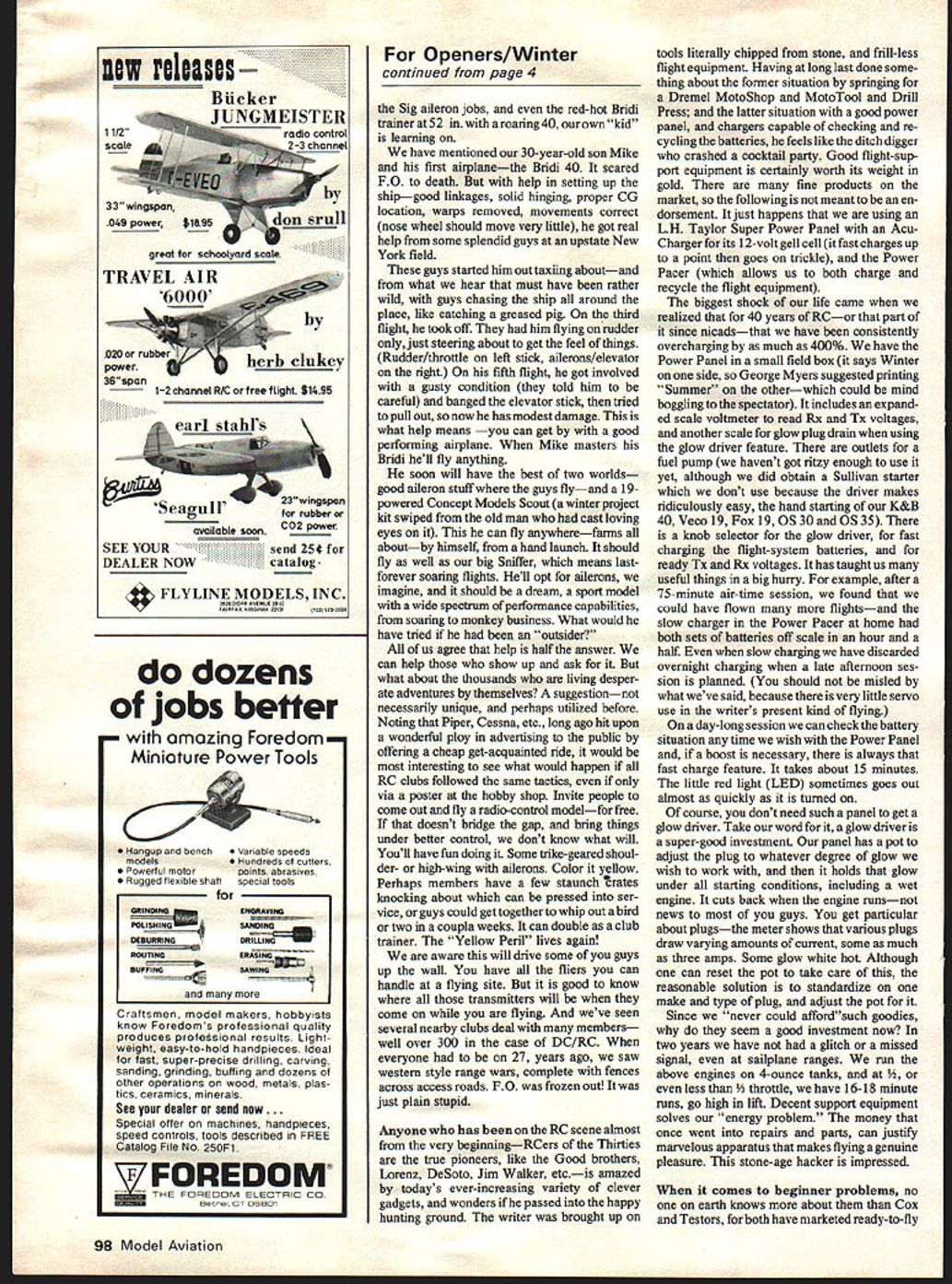 BILL WINTERS IONLE3 ne 53 g rati fying things observed littleused flying fields fond visiting can make long flights chase illusive thermals Out tying up several other people same frequencyis fairly frequent ap pearance teen agers first radio jobs surprisingly deter mined seem have much luck guys twenties perhaps having somewhat broader basetend opt colorful off beat crates scratch built magazines impressed giant leaps kids can make some older hand lends friendly help own confused notions about what trainer should beis among us confused question acquiring sharper perspective young beginner listenshe does have mind-set older struggles application halftruth fixes uncertain origins often re pulses comments until bind past weekend saw very young pilot simple advice enjoy new Falcon Junior older adjusted some Pietenpol-type thing kituntil zero wing about 5 6 degrees positive stabilizer spectacular upthrust CG traveling incognito would like fly machine too easy theorize about what trainer should Opinions abound rough definition might anything succeeds flying unrepairable damage airplane manages fly must admit teaches something regardless what Just seeing model flight demonstrates quicklythatall airplanes must guided differently ship comes toward compared going away probably thousands people left devices Out touch organized activities ob serve learn must run chancy mill trial error Industry has busted gut perfect ready-to-fly little things hopefully factor out ugly little Gremlins watched expert flying erratically such model monthsand day some grizzled veteran sport flying suggested bit downthrust adding little weight nose weight available small flat plug wrench rubber banded place sliver wood shim provided downthrust little ship really came alive climbed high stalling mushing need desperate correction groovedan element strive approaches right point would fly after fashion anyones hands trimmed HENDERTOON 9p 5 1-%L& L4 1fe Co 9OD MOPEL UpAtJce out flew way designer manufacturer hoped would No two airplanes alike ground out some fabulous stamping machine has hope having flown little rudder-only thingwhich after puts minimum dent pocket book may well maximum thousands people can afford newcomer will inspired go back hobby shop can hope some clerk will ministerto needs telligently two stages help basic verbal hobby shop second field newcomer fortunate enough con tact experienced hands will make out what hobby shop began Since people fly power wish aerobatics including rolls advanced trainer featuring ailerons can cases correct choice However does teach himself fly real airplane instructor penalties crashed model severe full-scale magic instruction flying site virtually compulsory results bright Deep instruction given some clubs new prospective members ideal short sometimes takes little things bring guy point can guide machine right-side up wild dives twists out-of-phase responses Lets go back two kids Junior Falcon quiet observer just happened made first flight after suggesting few changes control movements trim momen iarily handled sticks second flight quickly turned ship over its young pilot quietly talked him flying gently rudder Now kid could fly about field very mild turns experienced stick reversal ship came toward him could flythe first time Couldnt much true successive flights allowed him ever gently feel out machine What sticks mind safety efficacy rudder early-on fact ship will respond rudder neededand Falcons will thatis great advantage other ships will too Slight dihedral should seem important fortify qualitywitness some Continued page 98 4 Model Aviation new releases Bucker ER 1112control scalechannel -A wingspan eagu1Itar rubber available soon C 02 power SEE YOURsend 25 DEALER NOWcatalog 4 FLYLINE MODELS INC 703 573403 dozens jobs better amazing Foredom Miniature Power Tools Hangup bench Variable speeds modelsS Hundreds cutters Powerful motor points abrasives Rugged flexible shaft special tools ENGRAVING POIIf4IF~4SANDING DEBURRINGDR~G ROUTINGERASING BUFFINGSAWING =~ Craftsmen model makers hobbyists know Foredoms professional quality produces profetsional results Light weight easy-to-hold handpieces Ideal tast super-precise drilling carving sanding grinding buffing dozens other operations wood metals plas tics ceramics minerals See dealer send now Special otter machines handpieces speed controls tools described FREE Catalog File No 250F1 THEFORROOMELECRCCO Rex C 0680 Openers/Winter continued page 4 Sig aileron jobs red-hot Bridi trainer 52 roaring 40 own kid learning have mentioned 30-year-old son Mike first airplanethe Bridi 40 scared FO death help setting up ship-good linkages solid hinging proper CG location warps removed movements correct nose wheel should move very little got real help some splendid guys upstate New York field guys started him out taxiing aboutand what hear must have rather wild guys chasing ship around place like catching greased pig third flight took off him flying rudder just steering about get feel things Rudder/throttle left stick ailerons/elevator right fifth flight got involved gusty condition told him careful banged elevator stick tried pullout now has modest damage what help means can get good performing airplane Mike masters Bridi hell fly anything soon will have best two worlds good aileron stuff guys flyand 19powered Concept Models Scout winter project kit swiped old man cast loving eyes can fly anywherefarms aboutby himself hand launch should fly well big Sniffer means lastforever soaring flights Hell opt ailerons imagine should dream sport model wide spectrum performance capabilities soaring monkey business What would have tried outsider us agree help half answer can help show up ask what about thousands living desper ate adventures themselves suggestionnot necessarily unique perhaps utilized before Noting Piper Cessna etc long ago hit upon wonderful ploy advertising public offering cheap get-acquainted ride would interesting see what would happen R