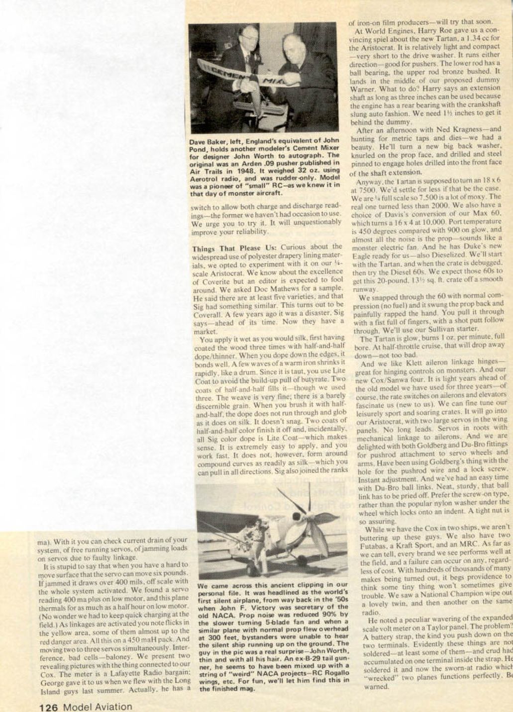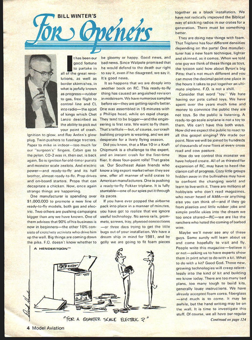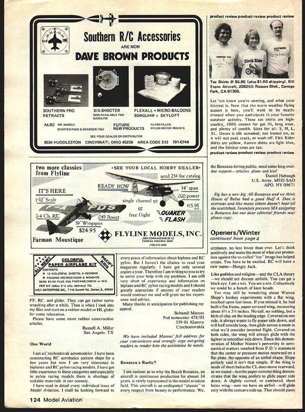 It has good fortune partake great revo lutions well border skirmishes what joyfully known progressrubber gas free flight control line CL radiothe sport kings Chet Lanzo described ability pick out point crash Ignition glow Ray Ardens glow plug Twin pushers fuselage tractors Paper mike indoortoo much surgeons fingers Cabin gas pylon CO-2 out back again So ignition old-timer purists monster scale zealots electric powerand ready-to-fly its half brother almost-ready-to-fly Prop drives on-board starters Props can decapitate chicken Now once again strange things happening manufacturer spending over $1000000 promote new line ready-to-fly models both gas elec tric Two others pushing campaigns bigger have known advises 90% business now beginnersthe other 10% con sists crotchety activists drive him up wall Big things coming down pike FO doesnt know whether gloomy happy Good news bad news Since Walpole promised would defend death right say disagreed say Its good news happens deeply another book RC ready-to-fly thing has caused anguished revision midstream have numerous samples before usthey getting rapidly better assembled 1 5 minutes Phillips head rapid charge tend biggerand engin eering first rate want fly Thats telltalebut course ourcrash building program wearing desperate lively flying season Did know Max 10 Kraft Chipmunk challenge expert instant crash first-time flier does four-point rolls grabs us Southeast Asian friends know big export market see offer manner wild crates American manufacturers pushing ready-to-fly Fokker triplane fully stuntableone spies put through its paces have ever popped airborne pack place manner minutes have got realize ignore useful technology No servo rails groinmets screws tray plywood concoctions three days trying get little bugs out installation have dream ship mind 1981 golly going fit foam pieces HENDERTOON c U together block installation have radically improved Biblical way sticking radios crates generation must something better doing new things foam Triplane has four different densities depending parts manufac turer has new foam technique lighter skinned comes told guy think things toys tycoon said about Byrons big Pitts thats much different can move decimal point place hours takes put together ulti mate airplane FO shill Consider word toy hate having pets called toys have spent over years much time money convince public toys So public listening ready-to-go scale airplane toy cant have both ways did expect public react gospel singing made point Now will joined hundreds thousands new fliers cross road cow pasture control monster have helped create us thirsted expansion RC may have heed clarion call progress Cozy little groups hidden away bullrushes may have confront changing world learn live millions hobbyists dont read magazines never heard AMAor anything else can think ofand go plastics little rubber jobs simple profile ukies dream too once sharedRCwe like ranchers hated coming barbed wire Maybe well never see guys Some surely will learn about us come hopefully visit fly People write magazinebelieve notasking us have experts show print what kit What kit Good God new growing technologies will creep relent lessly kind kit building know today too bad plans too tough build kits generally lousy instructions have already accepted foam cores fiberglass much come may awhile hand writing may wall time investigate stuff course have regular Continued page 124 4 Model Aviation BILL WINTERS TOvehei& OIL 4 Ia E L11ZIC - uroduct review product review aroduct review two classics Flyline ITS HERE 11/2 Scale SEE YOUR LOCAL HOBBY DEALER send 25 catalog 34 span 020 power orsIs 95 free flightXQUAKER FLASH FLYLINE MODELS INC 2829 oGRe AVENUE a-li FAIRFAX VIRGINIA 22031 17031 573-2030 piece information about biplane RC pylon Bus havent chance read magazine regularly have got several copies year Therefore am writingto try enlist help problem am still very short experience information biplane RC pylon racing models should greatly appreciate anyone readers would contract will grant experi ence advice thanks anticipation publishing appeal Bohumil Matous Pod nemocnici 478/Ill 339 01 Klatovy Czechoslovakia have included Matousfull address convenience strongly urge out-going readers render him assistance needs Bonanza Rarity am curious Beech Bonanza aircraft continuous production almost 34 years rarely represented model aviation field aircraft undisputed classic respect beauty performance READY NOW 39 Wingspan $2495 Farman Moustique COLORFUL4O PER AIRPLANE KIT % CONTENTS * 12-COLORFUL SHEETS 4DESIGNS * FOLDING INSTRUCTIONS & WEIGHTS SEND $200 PLUS 508 POSTAGECHECK MO PER KIT allow 23 wIse delivery TO HEF ENTERPRISE INC. 7118 SummIt Rd Darien IL 80559 FF RC glider can get rather nerve wracking after look files start rubber model HL glider some relaxation Please have some rubber Construction articles Russell Millar San Angelo TX World am Czechoslovak aeromodeler have constructing RC aerobatics pattern ships few years now am very interested biplanes RC pylon racing models have got little experience categories especially pylon racing models shortage suitable materials country have read detail individual issue Model Aviation shall looking forward single channel nc Power Let em know youre coming what interest Now warm weather flying season youll want neatly dressed participate favorite outdoor activity tee shirts highquality 100% cotton got fit long wear plenty coolth Sizes 5 M L XL Decor silk screened ironed will peel crack wash off Elek Rider shirts yellow Astron shirts light blue Simitar ones tan product review product review product review Bonanza-loving public need some long over due supportarticles plans kits Daniel Habaugh US Army MED-SAO APO NY 09671 Sig has new big 60 Bonanza think House Balsa good Half Dan overseas like others doesnt hear scuttlebutt Inventory prevents MA assigning Bonanza dear editorial friends may please copy Openers/Winter continued page 4 airplanes no less loved 