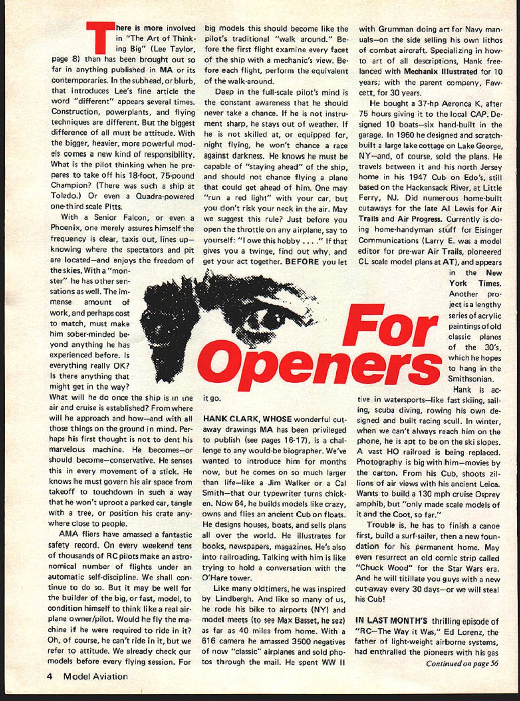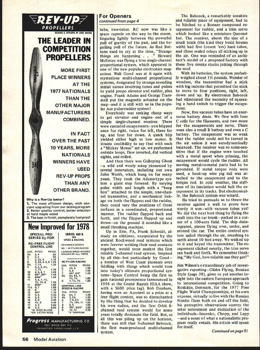 There involved Art Think ing Big Lee Taylor page 8 has brought out far anything published MA its contemporaries subhead blurb introduces Lees fine article word different appears several times Construction powerplants flying techniques different biggest difference must attitude bigger heavier powerful mod els comes new kind responsibility What pilot thinking pre pares take off 18-foot 75-pound Champion such ship Toledo Quadra-powered one-third scale Pitts Senior Falcon Phoenix merely assures himself frequency clear taxis out lines up knowing spectators pit locatedand enjoys freedom skies mon ster has other sen sations well im mense amount work perhaps cost match must make him sober-minded yond anything has experienced before everything really OK anything might get way What will once ship air cruise establishedFrom will approach howand things ground mind Per haps first thought dent marvelous machine becomesor should becomeconservative senses movement stick knows must govern air space takeoff touchdown such way wont uproot parked car tangle tree position crate close people AMA fliers have amassed fantastic safety record weekend tens thousands RC pilots make astro nomical number flights under automatic self-discipline shall con tinue may well builder big fast model condition himself think like real air plane owner/pilot Would fly ma chine required ride Oh course cant ride refer attitude already check models before flying session big models should become like pilots traditional walk around fore first flight examine facet ship mechanics view fore flight perform equivalent walk-around Deep full-scale pilots mind constant awareness should never take chance instru ment sharp stays out weather skilled equipped night flying wont chance race against darkness knows must capable staying ahead ship should chance flying plane could get ahead him may run red light car dont risk neck air May suggest rule Just before open throttle airplane say yourself owethis hobby ves twinge find out get act together BEFORE let HANK CLARK WHOSE wonderful cut away drawings MA has privileged publish see pages 16-17 chal lenge would-be biographer Weve wanted introduce him months now comes much larger lifelike Jim Walker Cal Smiththat typewriter turns chick en Now 64 builds models like crazy owns flies ancient Cub floats designs houses boats sells plans over world illustrates books newspapers magazines Hes also railroading Talking him like trying hold conversation OHare tower Like oldtimers inspired Lindbergh like us rode bike airports NY model meets see Max Basset sez far 40 miles home 616 camera amassed 3500 negatives now classic airplanes sold pho tos through mail spent WW II Grumman doing art Navy man ualson side selling own lithos combat aircraft Specializing howto art descriptions Hank free lanced Mechanix Illustrated 10 years parent company Faw cett 30 years bought 37-hp Aeronca K after 75 hours giving local CAP De signed 10 boatssix hand-built garage 1960 designed scratchbuilt large lake cottage Lake George NYand course sold plans travels between north Jersey home 1947 Cub Edos still based Hackensack River Little Ferry NJ Did numerous home-built cutaways late Al Lewis Air Trails Air Progress Currently ing home-handyman stuff Eisinger Communications Larry E model editor pre-war Air Trails pioneered CL scale model plans AT appears New York Times Another pro ject lengthy series acrylic paintings old 30s classic planes hopes hang ers Hank ac tive watersportslike fast skiing sail ing scuba diving rowing own de signed built racing scull winter cant always reach him phone apt ski slopes vast HO railroad being replaced Photography big himmovies carton Cub shoots zil lions air views ancient Leica Wants build 130 mph cruise Osprey amphib made scale models Coot far Trouble has finish canoe first build surf-sailer new foun dation permanent home May resurrect old comic strip called Chuck Wood Star Wars era will titillate guys new cut-away 30 daysor will steal Cub IN LAST MONTHS thrilling episode RCThe Way Ed Lorenz father light-weight airborne systems enthralled pioneers gas Continued page 56 4 Model Aviation go THE LEADER IN TITION PROPELLERS PLACE WINNERS 1977 NATIONALS MANUFACTURERS AT THE THAN THE OTHER MAJOR COMBINED IN FACT SPECIAL PRO SERIES 2 FOR RCFREE FLIGHT CONTROL LINE DIAPITCHPRICE 5%3489 63489 733/4119 833%456 129 8%77%139 94566% 77%139 104567149 106W EVIl149 106EW159 114877/ 7A7%8159 116EW169 11%67189 126179 125V4179 1356239 145 6279 1556349 184Y6449 1756599 1856699 -w WIDE BLADE EW EXTRA WIDE SERIES 400 B FOR SPEED NG ADVANCED DESIGN NO 1 IN PYLON RACING LEADING SPEED RECORD HOLDER OP ALL TIMES RC PYLON RACING DIAPITCHPRICE 53%4129 756149 75N6N149 8%6% 6% 7%7%189 977%7%188 CONTROL LINE SPEED& RACING DIA PITCHPRICE 4/6%7129 4%55%129 6788%149 77%1G%11169 889189 89N 9%N189 91213229 N NARROW Openers continued page 4 tube two-tuber RC now like space capsule way moon lingering lightly between powerful pull gravity past guiling pull future As Red tons used cry time Strange things happening ward McEntee flying true single-channel proportional system appeared new popular electronics mag azines Walt Good again mysterious multi-channel proportional systems designated strange sounding initial names involving tones pulses yield propo elevator rudder plus engine Frank Adams George Tram mell put magnetic actuator mapand still us popu lar Ace pulse-rudder system Everybody seeking cheap ways get elevatorand engineout simple single-channel receiver cascaded escapementsyou blipped once right twice left three up four down quick blip yielded either high low motor strains credibility say such Mickey Mouse set up performed outside loops flew inverted did vertical eights rolled Galloping Ghost wild wooly setup pioneered several innovators including own John Worth hung years took Adams-type sys tern giant step forward varying pulse width length beep box attached simple one-chan nel transmitter mechanical link age both flippers rudder coul