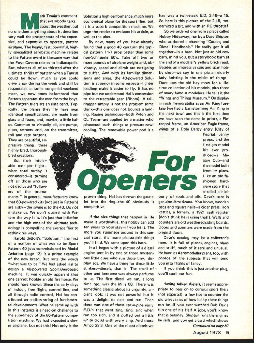 Ma rk Twains comment everybody talks bout weather no does anything about describes very well present state expen sive expensive operate pattern airplane heavy fast powerful high ly specialized aerobatic machine relates Pattern event same way Foyt Coyote relates Indianapolis whereas us thirsted after ultimate thrills pattern Taurus could flown much could drive car during week still respectable some congenial weekend meet now know beforehand Pattern separates men boys Pattern fliers elite band Typ ically planes fly have near identical specifications made glass foam maybe little bal sa Common virtually pumps pipes retracts transmitter roll rate buttons beautiful ex pressive things highly bred thoro ughbred creations intoler able cost per flight total outlay consideredis turning off dedicated follow ers tourna ments general manufacturers know 60-powered kits just Pattern riskythe swing 40 mistake us dont quarrel Pat tern way Its just inflation high cost ultimate tech nology compelling average flier rethink ways Harold deBolts Solution first number what Sport Pattern 40 jobs commissioned Model Aviation page 13 prime example new breed note words what asked Hal design 40-powered Sport/Aerobatic machine quickly apparent cannot hobble old fire horse should have known Since early days indoor free flight control line through radio control Hal has con tributed endless string fundamen tal developments What came up instance head-on challenge supremacy 60-Pattern compe tition machine expected clev er airplane thisl Solution high-performance much economical plane sport flier superb competition machine urge reader evaluate article well plan now have already found good 40 can turn typi cal pattern 11-7 prop better some non-Schnuerle 60s Take off two pounds airplane weight ob viously speed climb going suffer its familiar dimen sions areas 40-powered Solu tion superior some respectslighter loadings make easier fly has no pipe understand Hals concession retractable gear Rhom taildragger simply problem some thinkthis does bounce land ing Racing techniquesboth Pylon CL Teamare applied master pioneered such things pressure-cowl cooling removable power pod ners provenHal has thrown gaunt let ringthe 40 obviously competitive nice things happen life make worthwhile hobby can add ten years stayif let rummage around spe cial store pleasurable things youll find came upon barn began picture diesel engine sent mysteri ous little guys run tiny dis play ads have thing little stinkersdiesels smell ether kerosene always perfume us first diesel ran long time ago Mills 08 something classic about its ungainly cient look powerful delight start run stove-pipe early EDs went zing zing zing run too rich puffed out little white cloud zing Amco 29s nicest diesels twin-stack ED 246a 15 So picture 246 mo dernized bit RC throttle So ordered onefroma place called Hobby Hideaway run Dave Shipton authored charming Catalog Diesel Handbook really got togetherin barn just old cow barn mind storybook barn end ofa modelers yellow brick road Besides impressive spic span hob shopwe spy pic elderly lady knitting midst things Dave uses old hay mow life time collection models plus famous modelers calls Wings Things Museum display such memorabilia Air King fuse lage barnstorming Air King next town first time have seen name print Pie tenpol frame American Eagle frame wings Dole Derby entry City Peoria Jenny props first gas model kit ever pro duceda gow Cuband model built its plans Like old-fa shioned hard ware store smelled delici ously tools oils Daves barn genuine Americana know wooden pegs square nailsa cider press iron kettles fernery 1921 cash register dont think using Walls counters old weathered siding boards Doors counters made original doors Daves catalog may collectors item full planes engines plans stuff much rare unusual handles Aeromodeller plans too photos subjects will send flights fancy think just another plug youll spoil fun Having talked diesels seems appro priate pass curious sport fliers experts few tips counter old wives tales balky things can beif ever watched Bob Davis flip Half jobs youll know baloney Shipton runs engines sells get card shows Continued page 80 August1978 5 MORE FIRST PLACE WINNERS AT THE 1977 NATIONALS THAN THE OTHER MAJOR MANUFACTURERS COMBINED IN FACT OVER THE PAST 10 YEARS MORE NATIONALS WINNERS HAVE REV-UP PROPS OTHER BRAND USED THAN ANY Rev-Up better 1 The efficient design con stant upgrading testing program 2 Better quality control better selection hard maple wood 3 The best finish completelyfuelproof New Improved 1978 SPECIAL PRO SERIES 2 FOR RCFREE FLIGHT CONTROL LINE DIAPITCHPRICE 5%3499 e3489 733%4119 833% 45 e129 9%77%139 94569% 77%139 104567149 106W aw149 10SEW159 114577% 7%7%9159 11BEW169 11%67169 126179 125W179 1356239 1456279 1556349 164% 6449 1756599 1956699 W WIDE BLADE EW EXTRA WIDE SERIES 400 B FOR SPEED NG ADVANCED DESIGN NO IN PYLON RACING LEADING SPEED RECORD HOLDER OF ALL TIMES AC PYLON RACING DIAPITCHPRICE 53%4129 756149 7SN 6%149 8%9% 9% 7 7%7%199 97 7% 7%199 CONTROL LINE SPEED & RACING DIA PITCHPRICE 4%6%7129 4%55%129 6799%149 77%10%11199 899199 89% 9%N199 9 1213229 N NARROW Openers continued page 5 engine setting head jet needle turns open valve observation nine out ten fliers made com mon mistake As soon engine start ed immediately raised head compression maximum rpm As en gine temperature rose compression too high engines ran hot groaned flight Like lean-run glow engine better raise Compres sion enough make engine run moderate speed after 30 sec onds slowly raise compression rpxm dont hungry Before mufflers primed diesels stackor choked prime light first flip en gine might pop time back off head because next flip often brutal surprise flipped com pression down what first pop until started slowly raised compression couple starts became necessary additional variablethe head screwaffords fasci nating combition adjustment controls too lean exhaust sounds ragged tattered fascinating pl